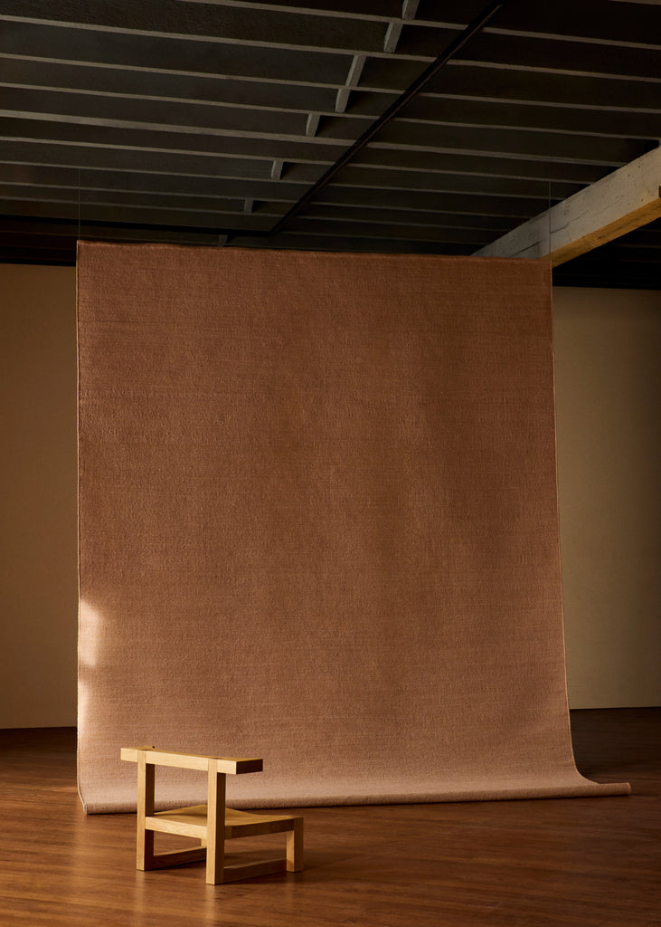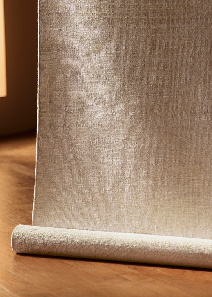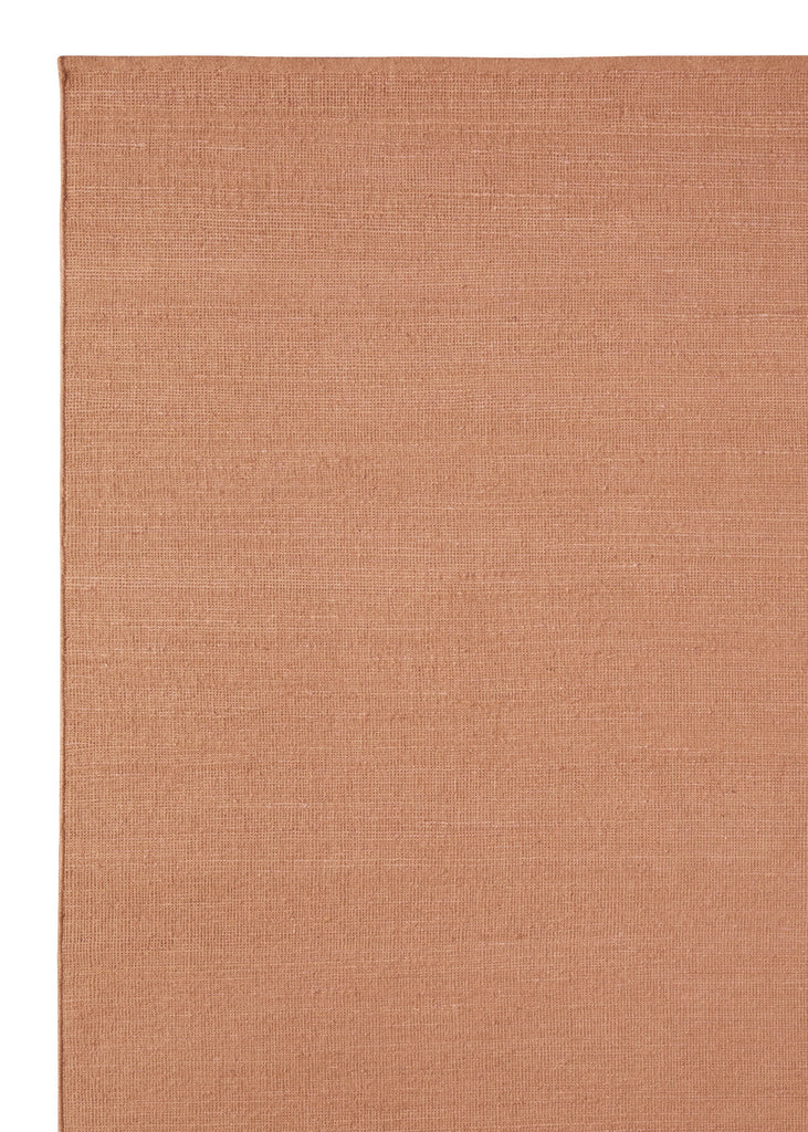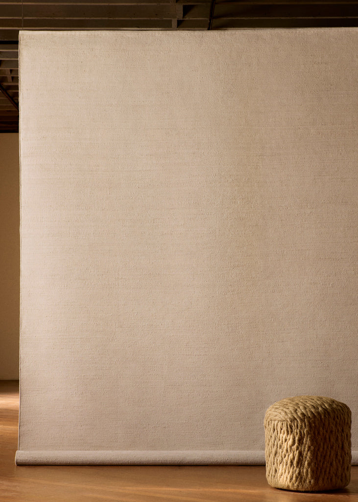 Hand-woven from a linen warp with a weft of alternating wool and jute, Aerie displays subtle tonal variations across its grid-like surface. The edges are finished with a turnover binding, ensuring durability and clean lines. Its tightly constructed weave provides structural strength suitable for high-traffic areas. One of a kind.