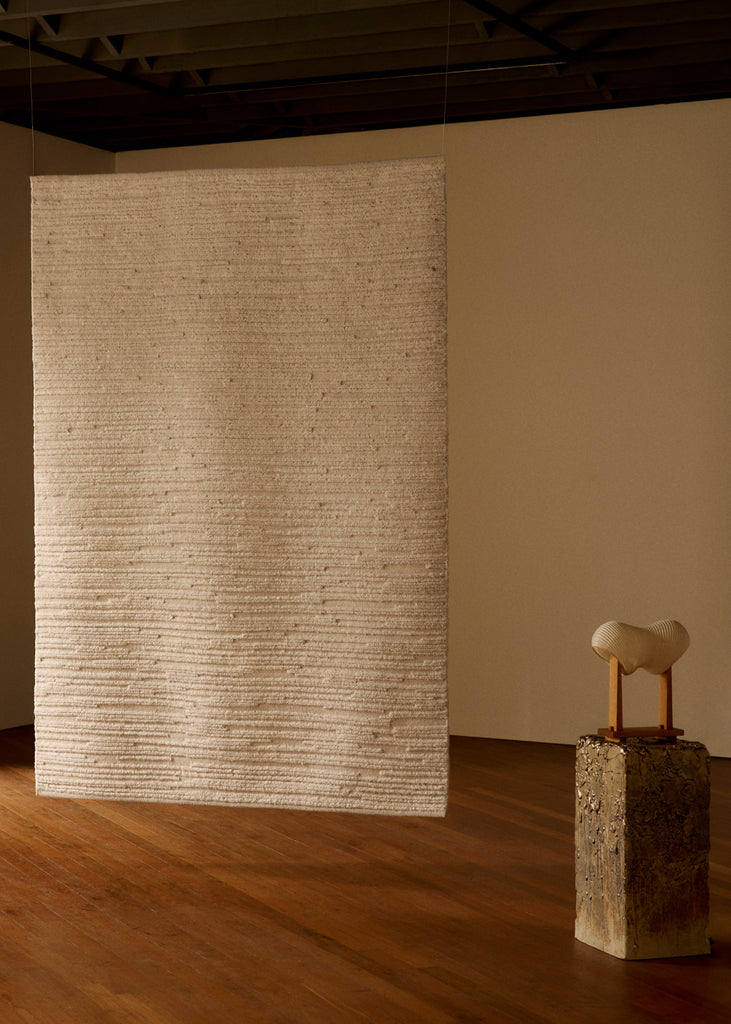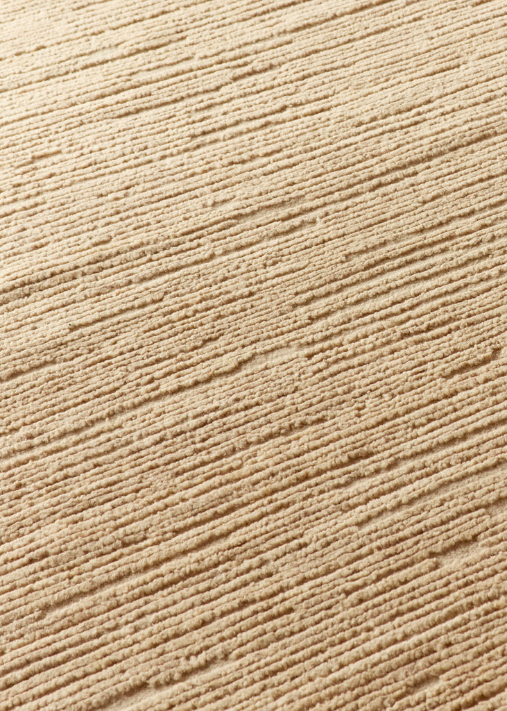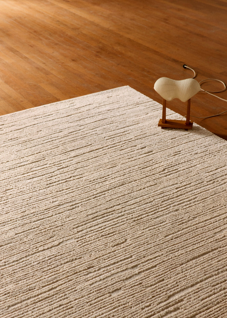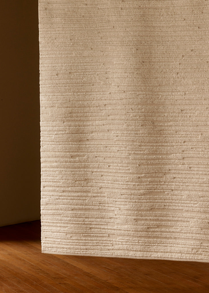 Hand-knotted from wool, Cirrus features raised, pillowy piles that form an organically banded pattern above the base. The edges are finished with a turnover binding, providing a clean and durable perimeter. Available in multiple sizes, the rug is suitable for living rooms and bedrooms. One of a kind.