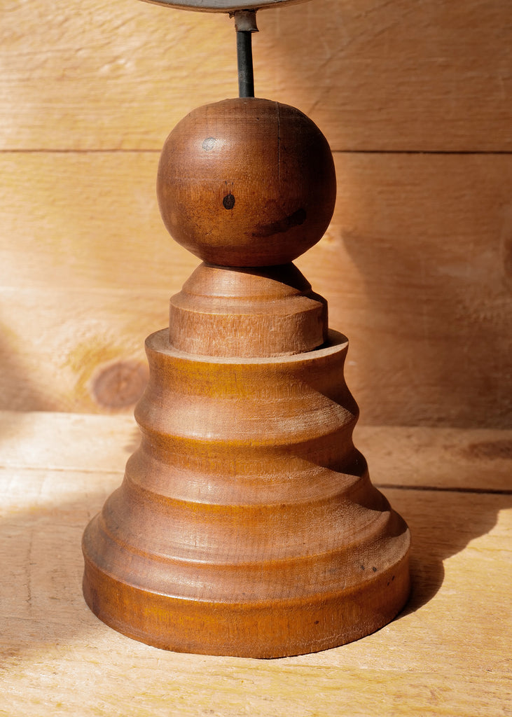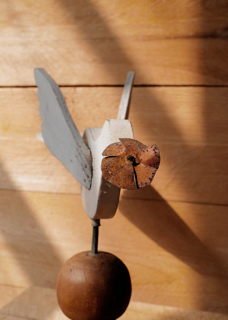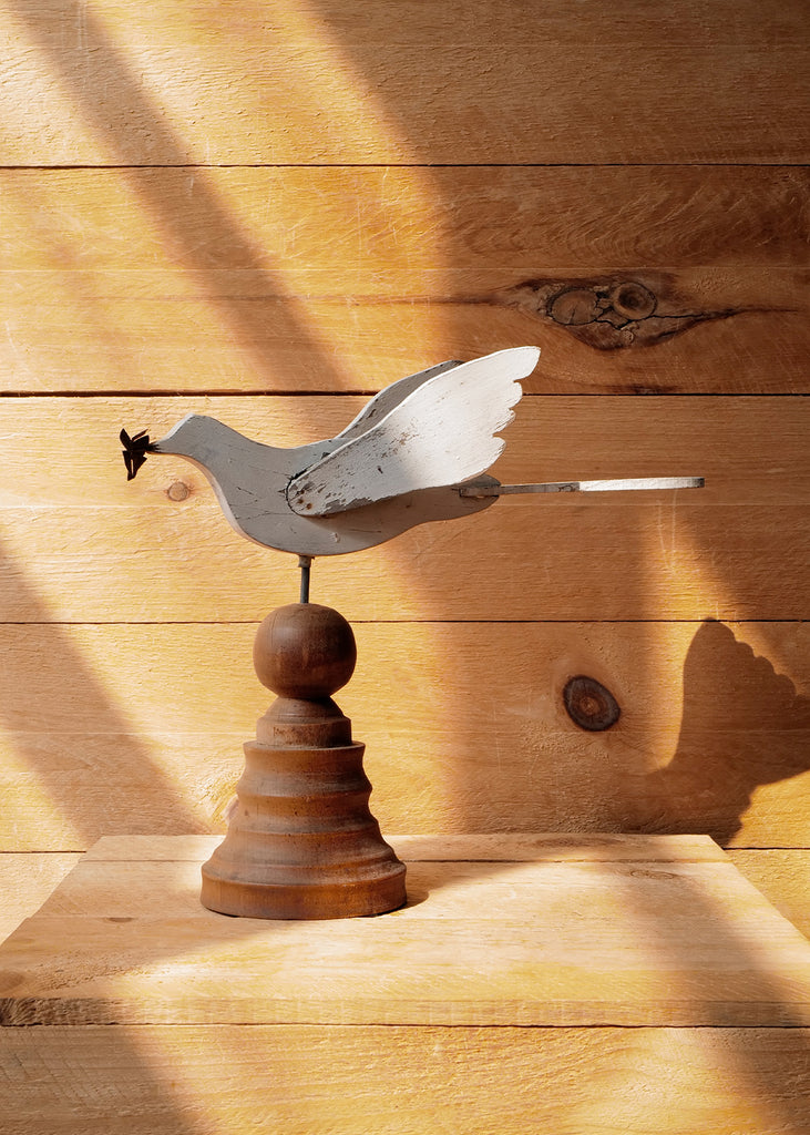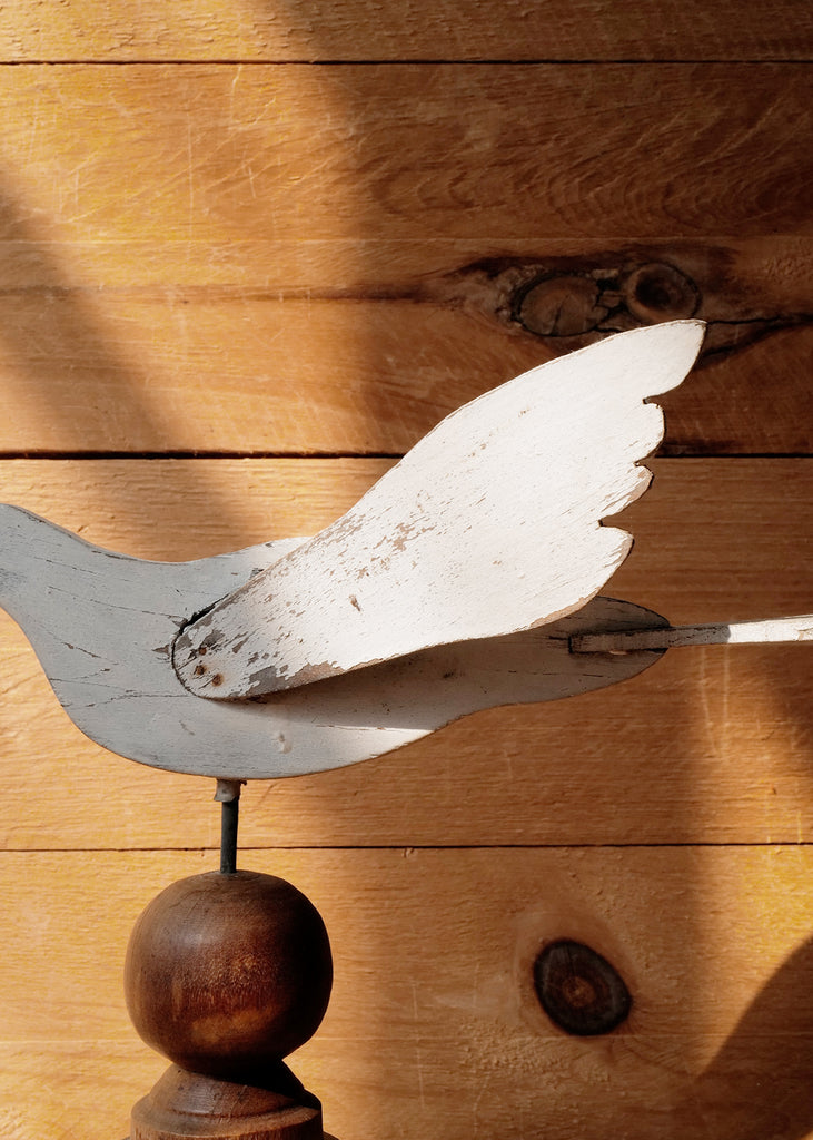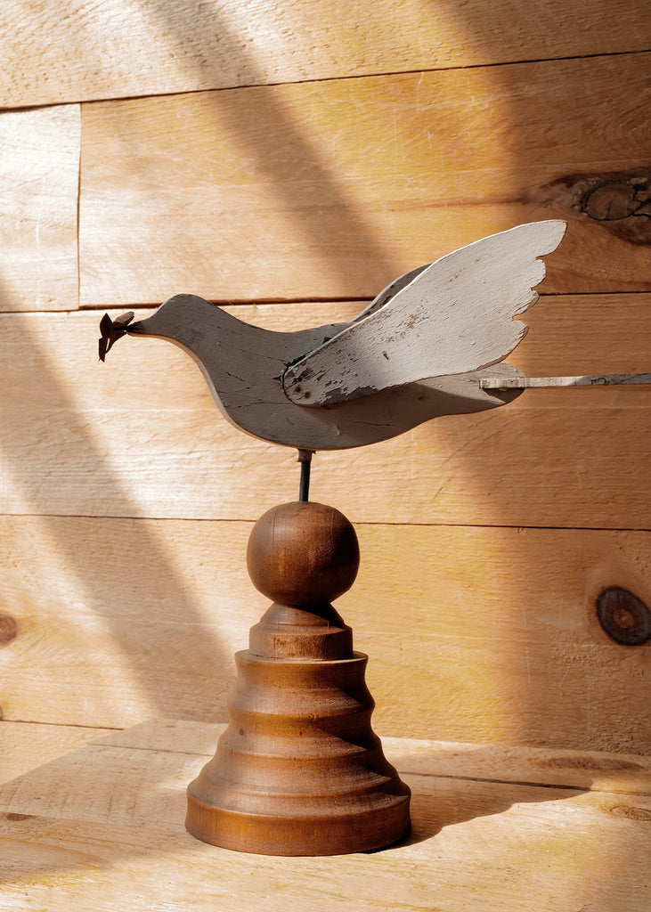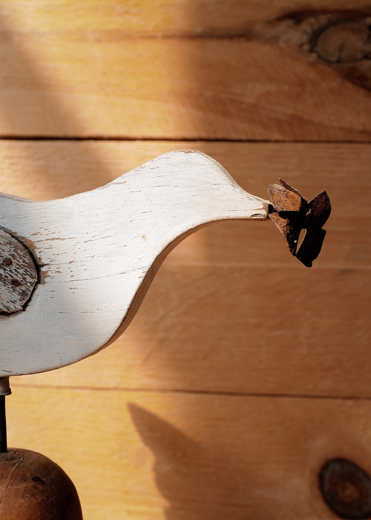 Hand-carved wooden dove mounted on a wooden stand. Painted white, the beak features a miniature vintage windmill detail. One of a kind.