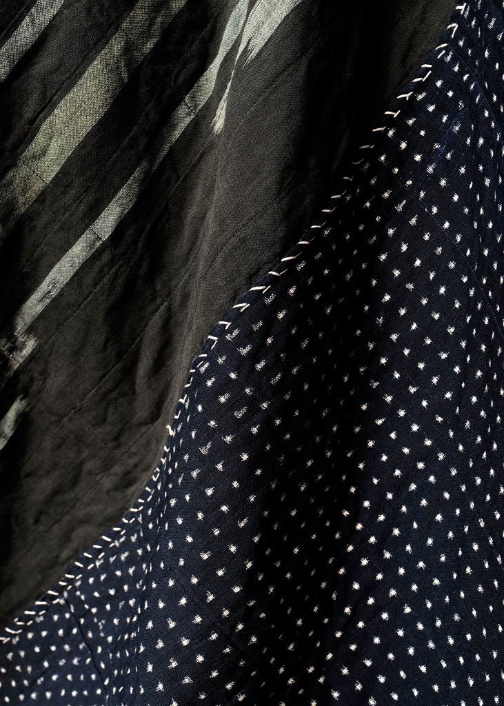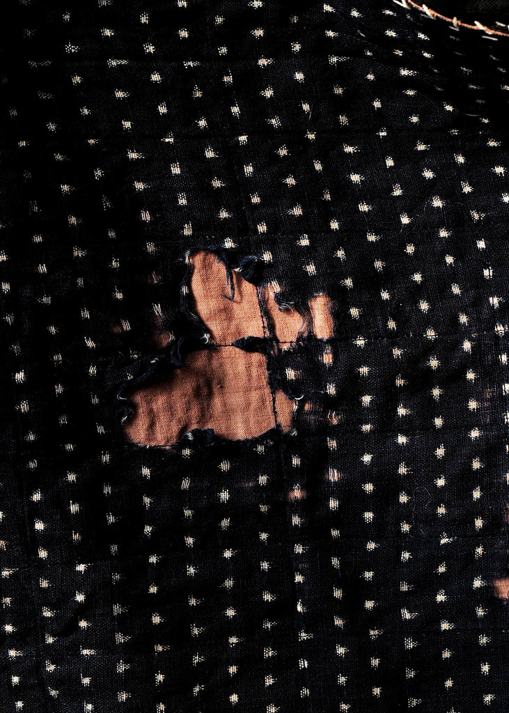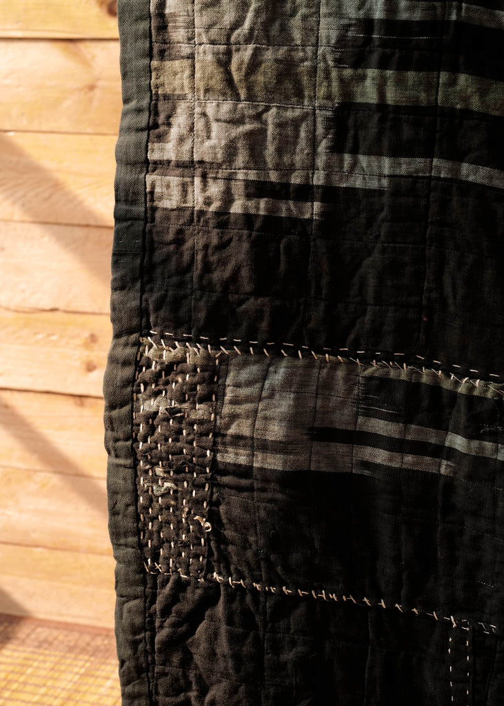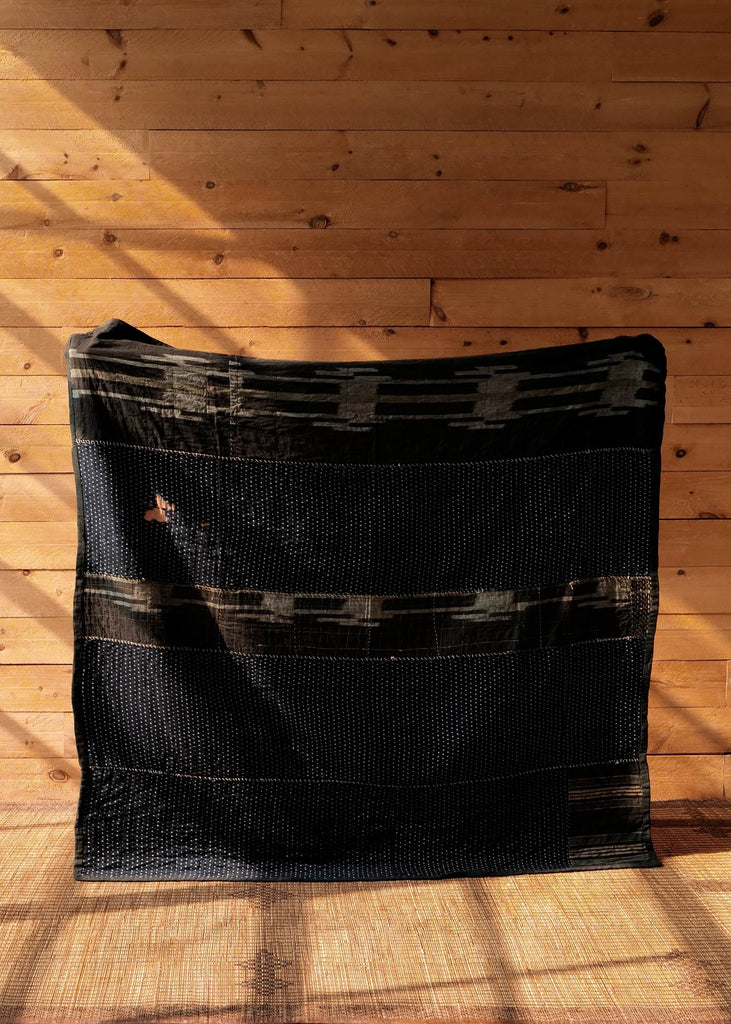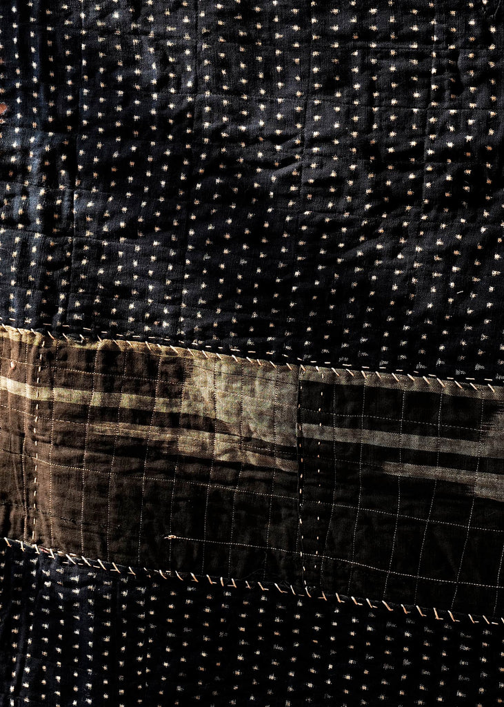 Handmade Japanese boro quilt featuring traditional aizome (indigo-dyed) fabrics. Constructed from layered and patched cotton textiles, each section shows evidence of hand-stitching and repair. Subtle variations in color and texture reflect the artisan’s hand and the natural indigo dye. One of a kind.
