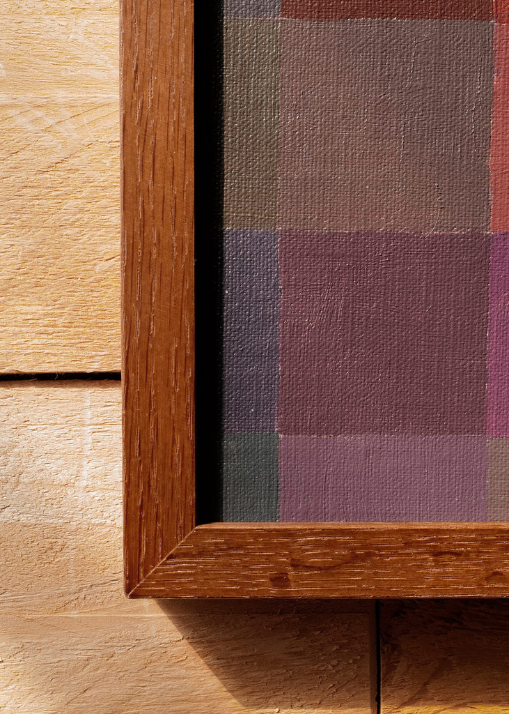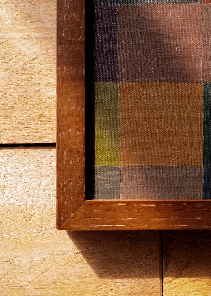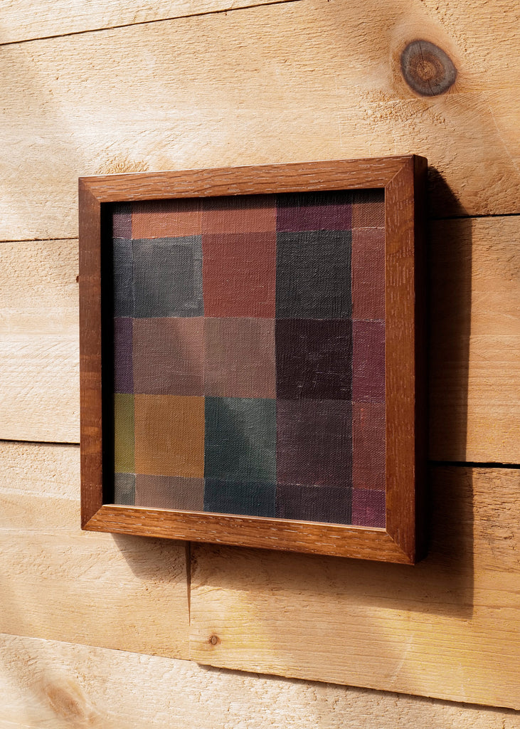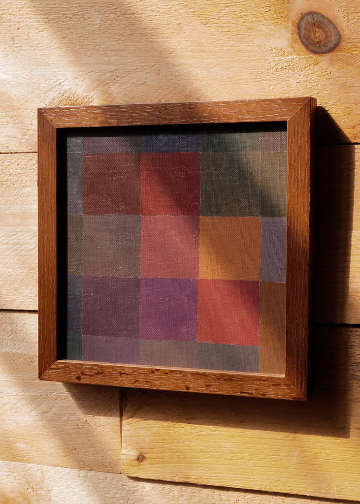 These one-of-a-kind meditative paintings feature soft tonal colors and abstract geometric patterns, exploring the spiritual connection between color and space. Inspired by Bauhaus artists like Paul Klee and Anni Albers, the work experiments with color, shape, scale, and rhythm. Framed in a simple walnut-stained oak frame, each piece is unique.
