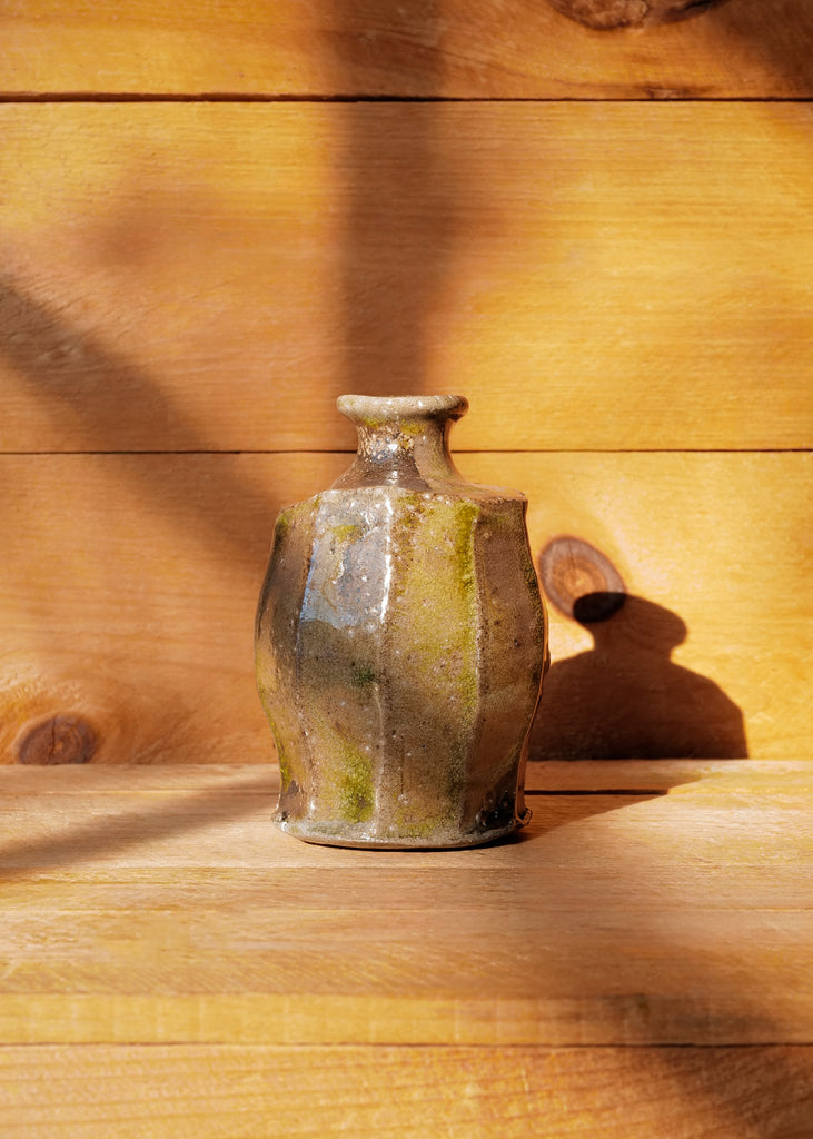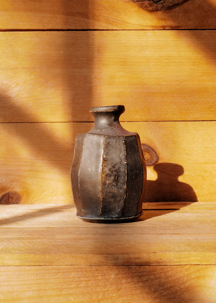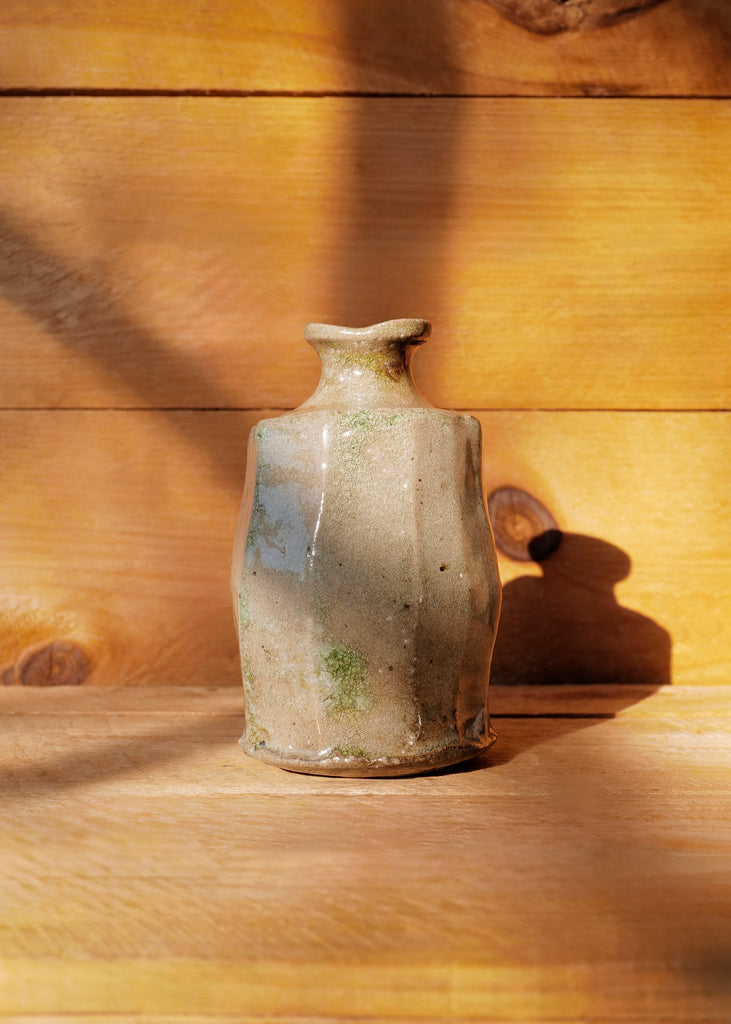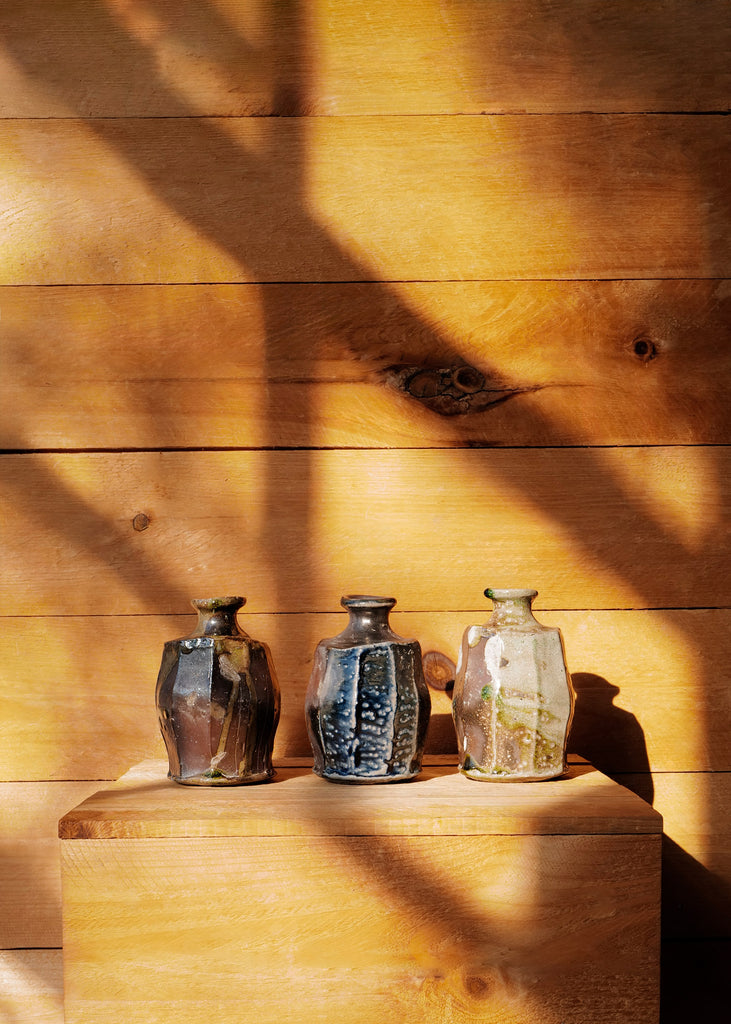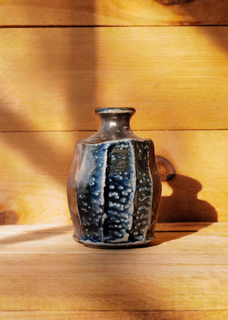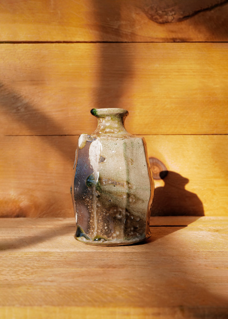 These fluted ceramic bottles are handmade for sake but can also function as bud vases. Each piece is formed individually, resulting in unique variations in shape and surface. Fired propped on seashells, the bottles display subtle markings from the process. Glazes range across earthy tones from black and brown to green and blue, with natural variations created during firing. One of a kind.