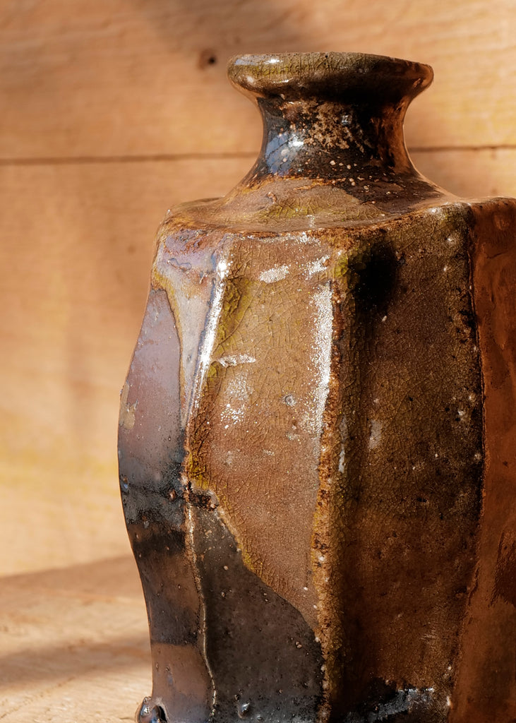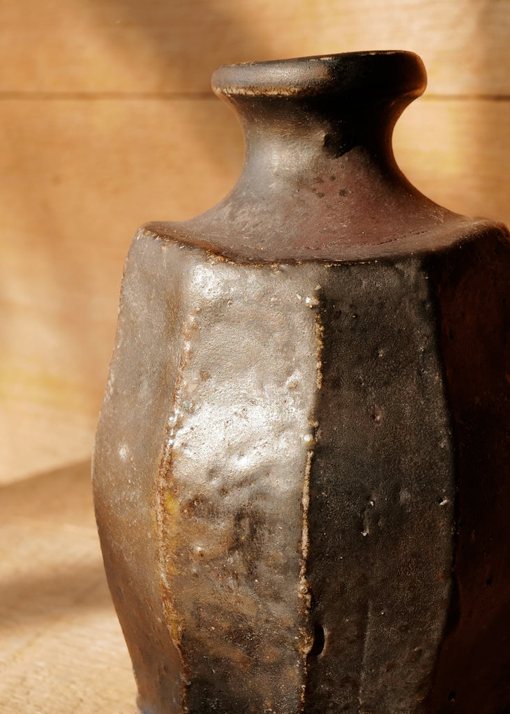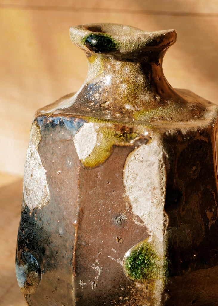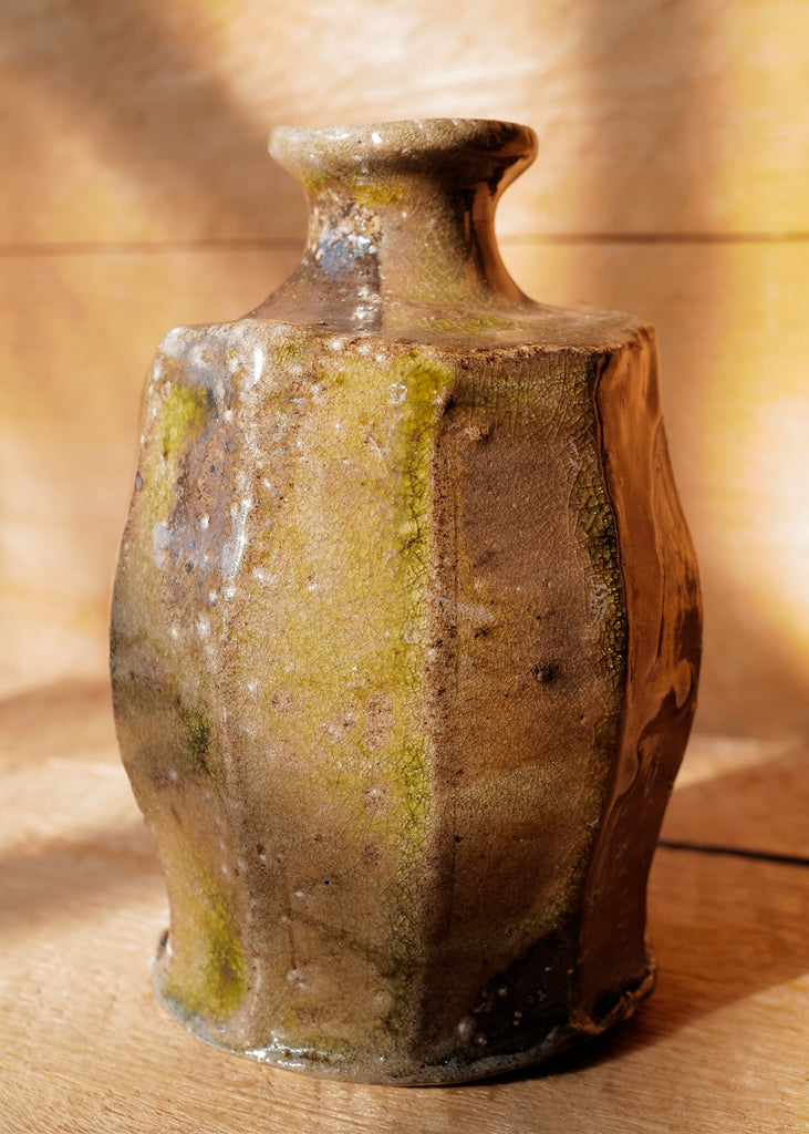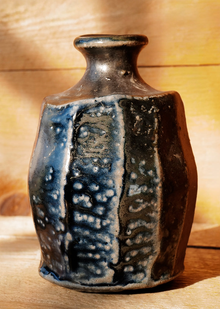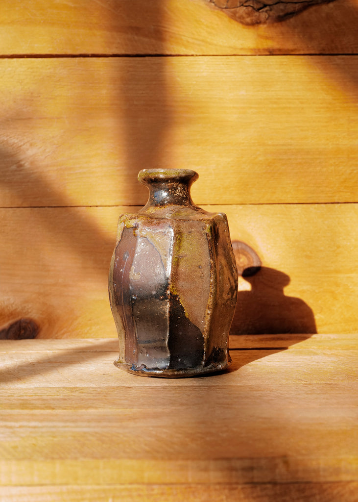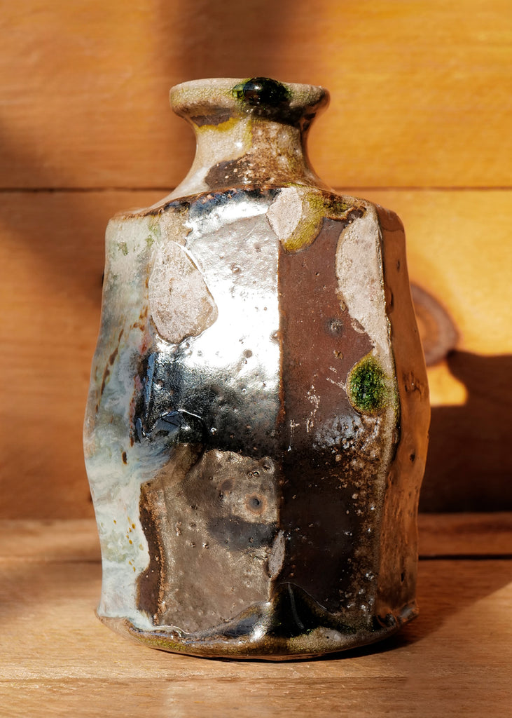 These fluted ceramic bottles are handmade for sake but can also function as bud vases. Each piece is formed individually, resulting in unique variations in shape and surface. Fired propped on seashells, the bottles display subtle markings from the process. Glazes range across earthy tones from black and brown to green and blue, with natural variations created during firing. One of a kind.