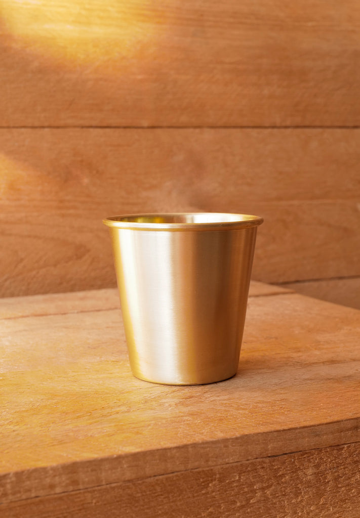 Handcrafted with a warm brushed brass finish, the Yumi Cup is a simple, essential, and minimal design. Suitable for use as a toothbrush holder or, outside the bathroom, as a small vase or decorative accent. One of a kind.