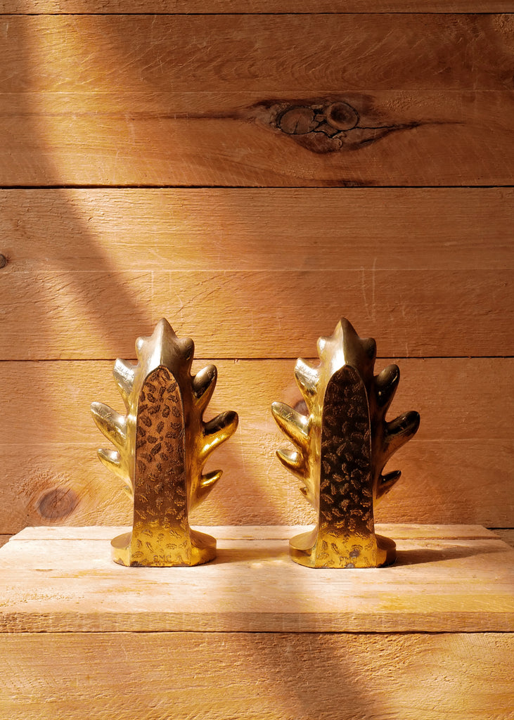 Our vintage Mid Century Oak Leaf Bookends are Inspired by Nature. Each bookend is made of brass, and features a mini embossed design of falling leaves on the base and back. Due to their vintage nature, these bookends have a warm aged patina and come with felt bottoms to protect your shelves from scratches. One of a kind.