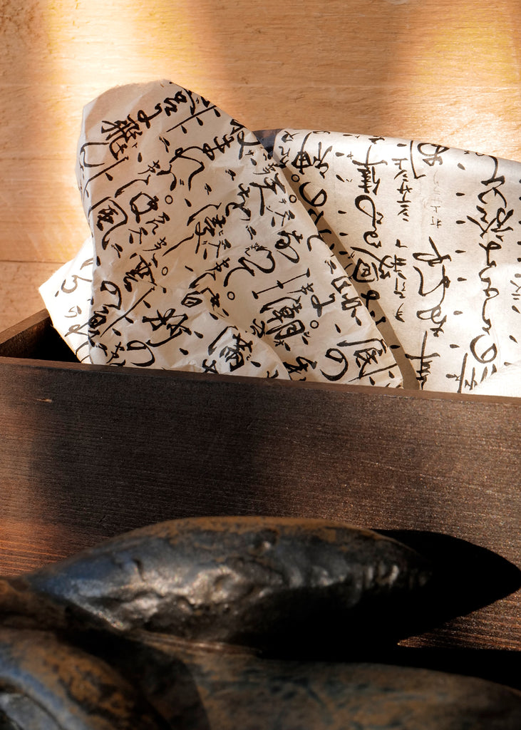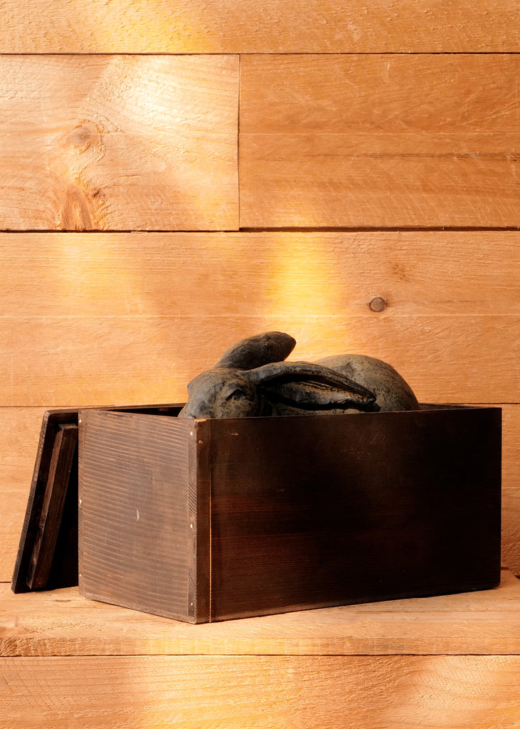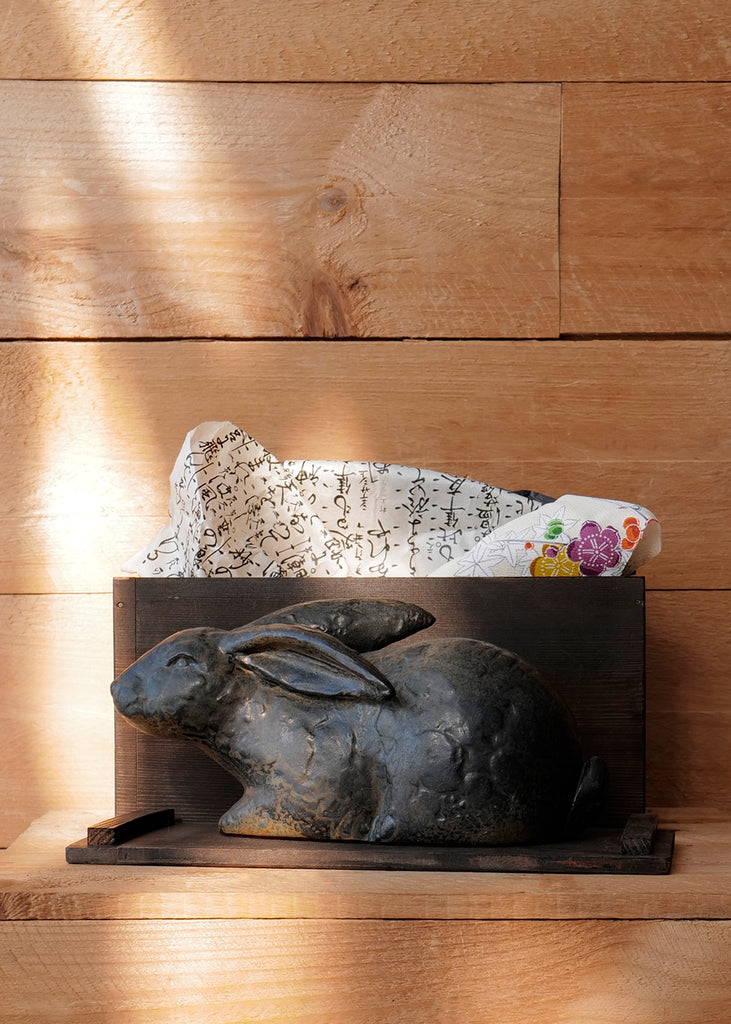 This rabbit figure is connected to long-standing Japanese symbolism, where the form is associated with ideas of forward motion and generational prosperity. It is housed in a vintage handmade wooden box filled with traditional Japanese wrapping materials, including printed textiles and kimono fabric remnants. One of a kind.