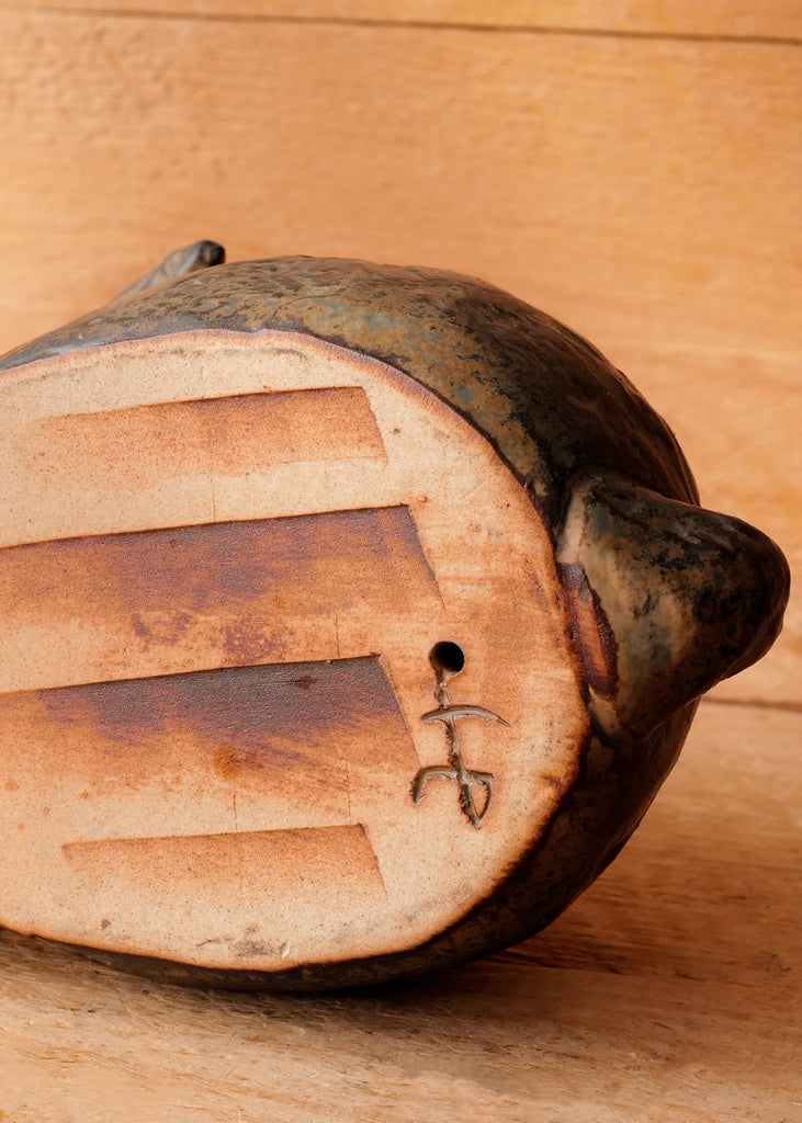Hand-formed in ceramic, the piece features a slate-grey and dark-brown glaze with a natural patina that reflects its age. The surface shows the subtle irregularities characteristic of kiln-fired work from this region. The base is engraved with the hiragana character み (mi).