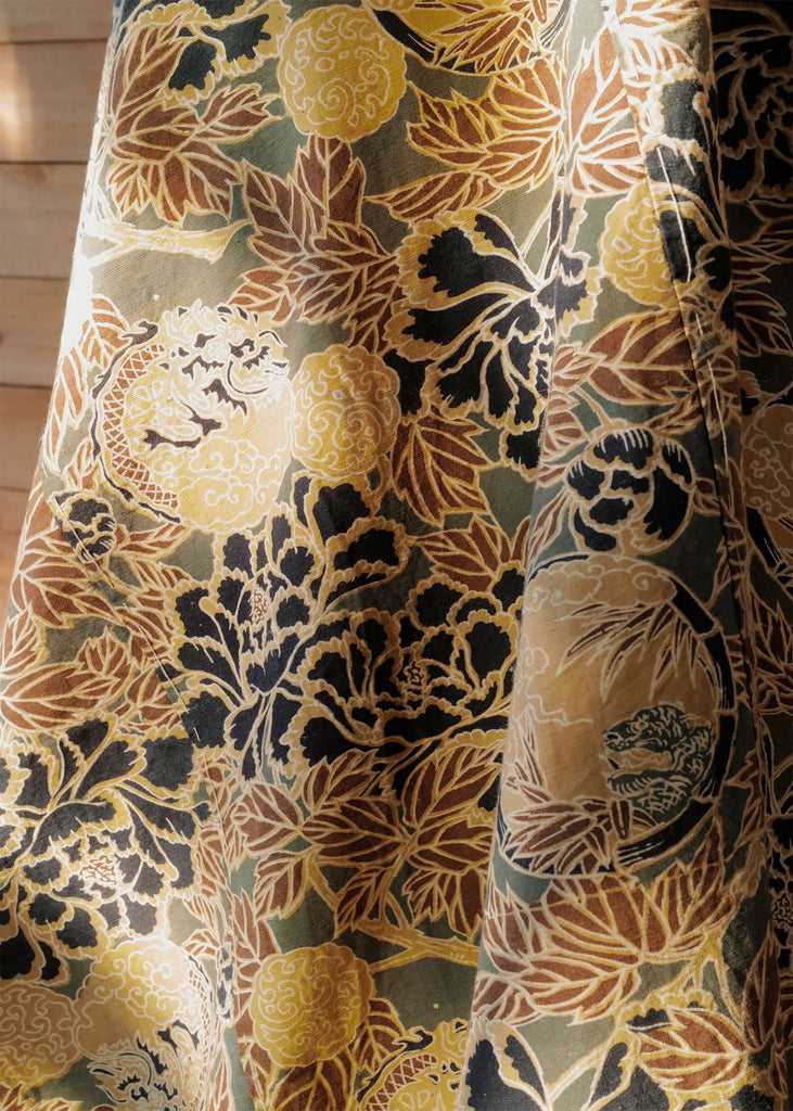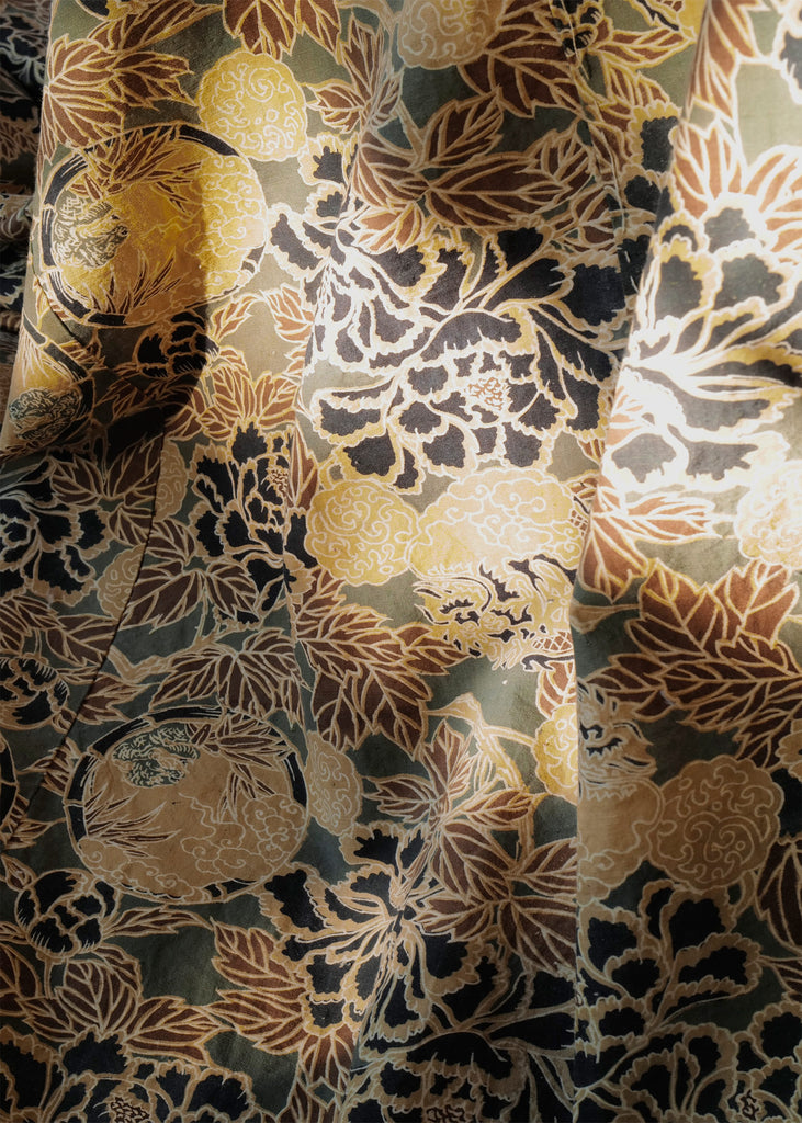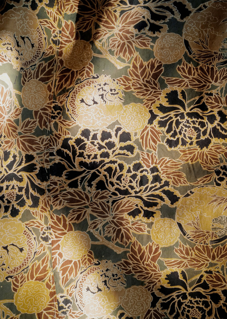 This vintage 1950s boro cloth is a five-panel Japanese textile made by layering and patching worn fabrics, a traditional craft for extending the life of textiles. Hand-stitched with selected remnants, the piece displays a bold floral, dragon, and cloud motif. Evidence of careful repairs is visible throughout. One of a kind.