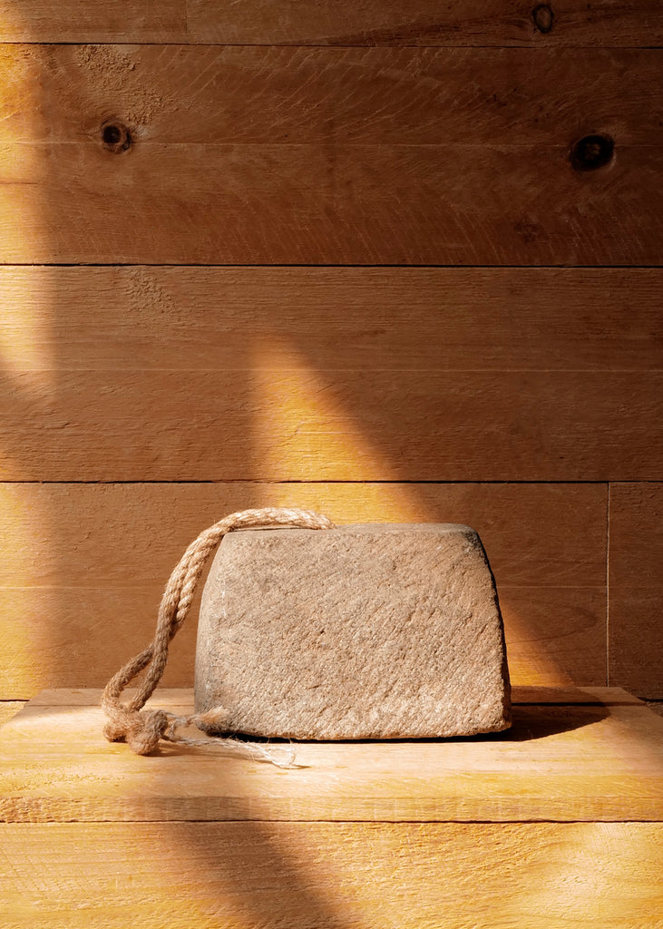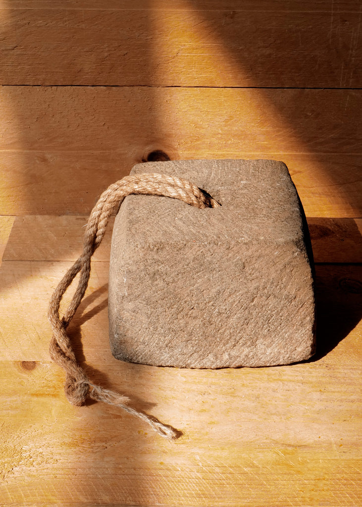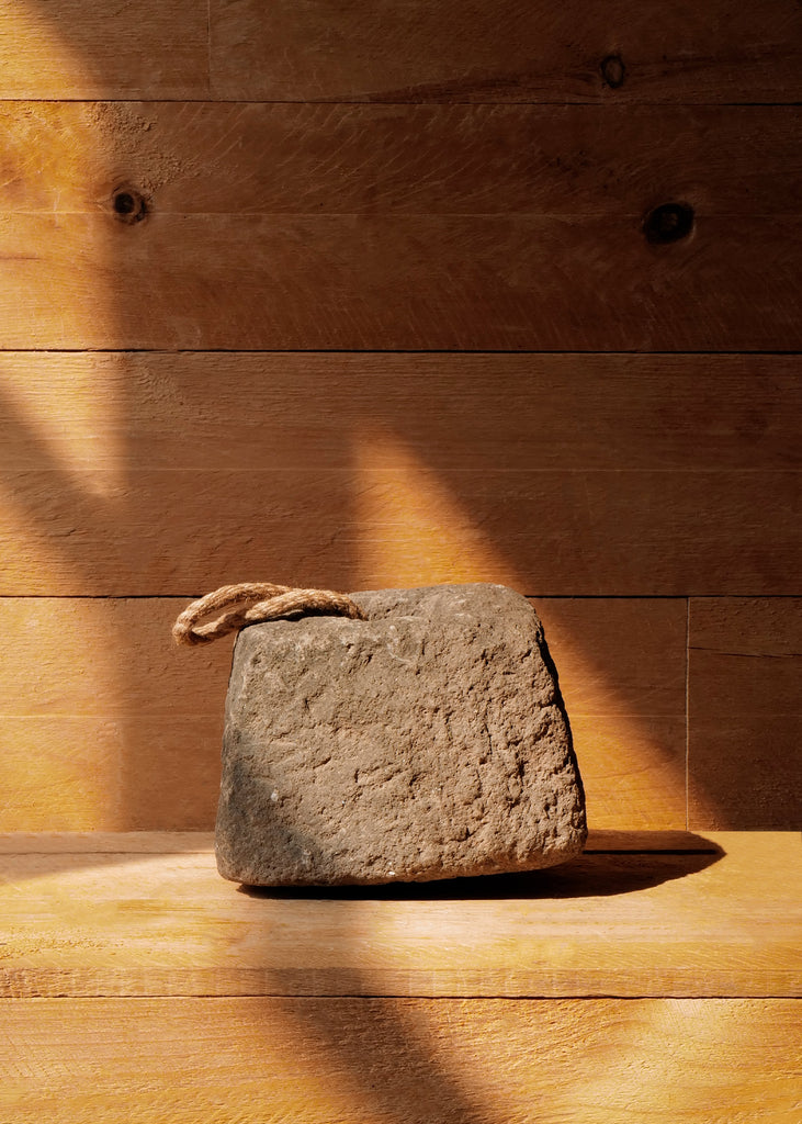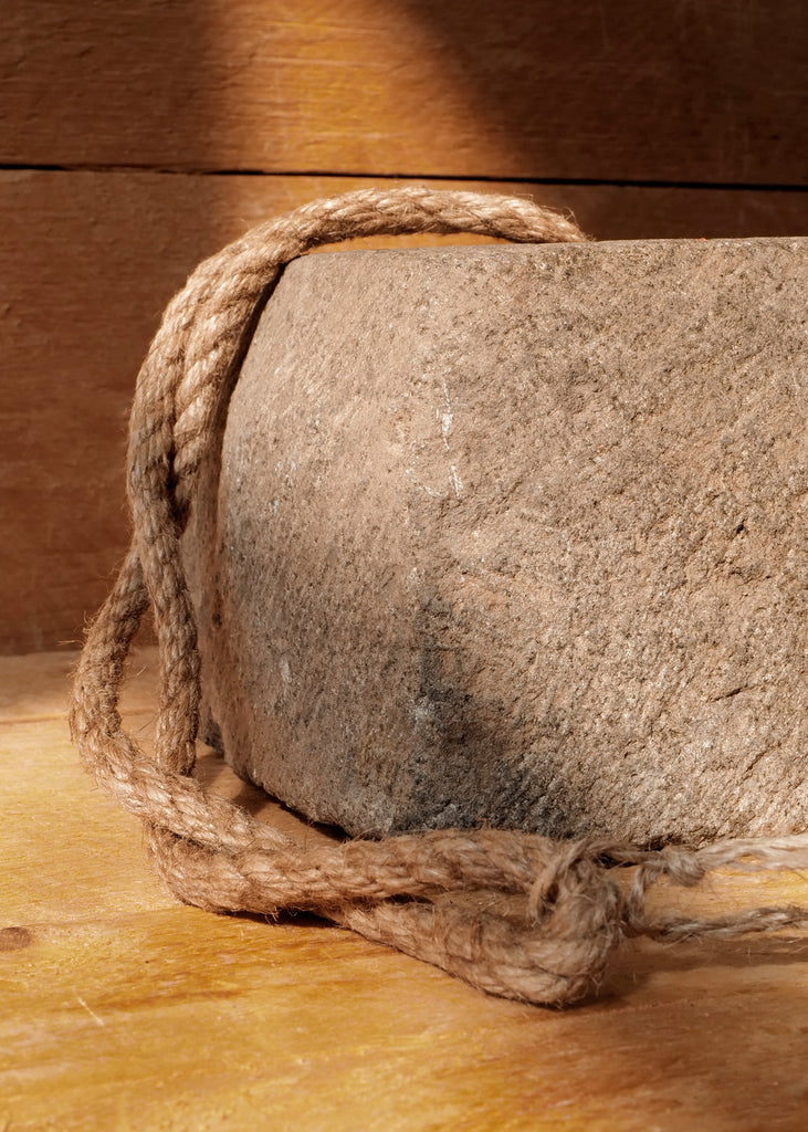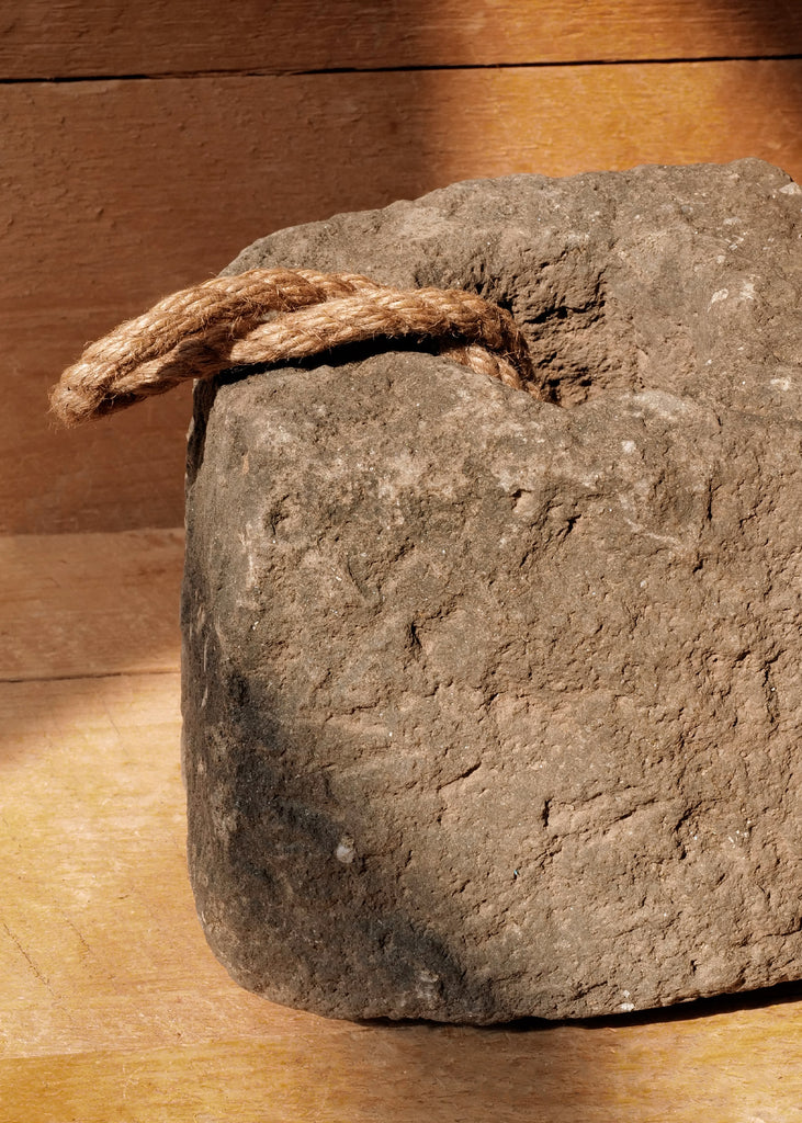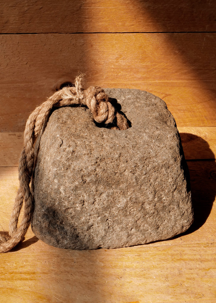Also known as an Ishi-doorstop, this vintage piece from Japan is made from natural stone and finished with a simple rope handle. Each one shows slight variations in shape and surface, sometimes lightly carved to enhance function. One of a kind.