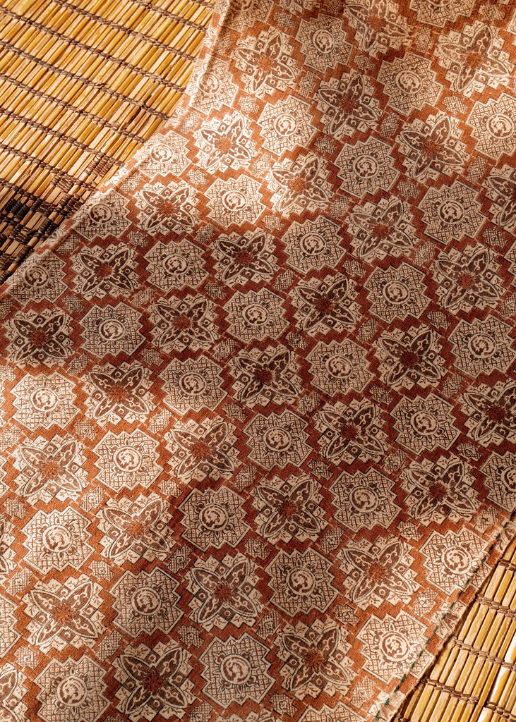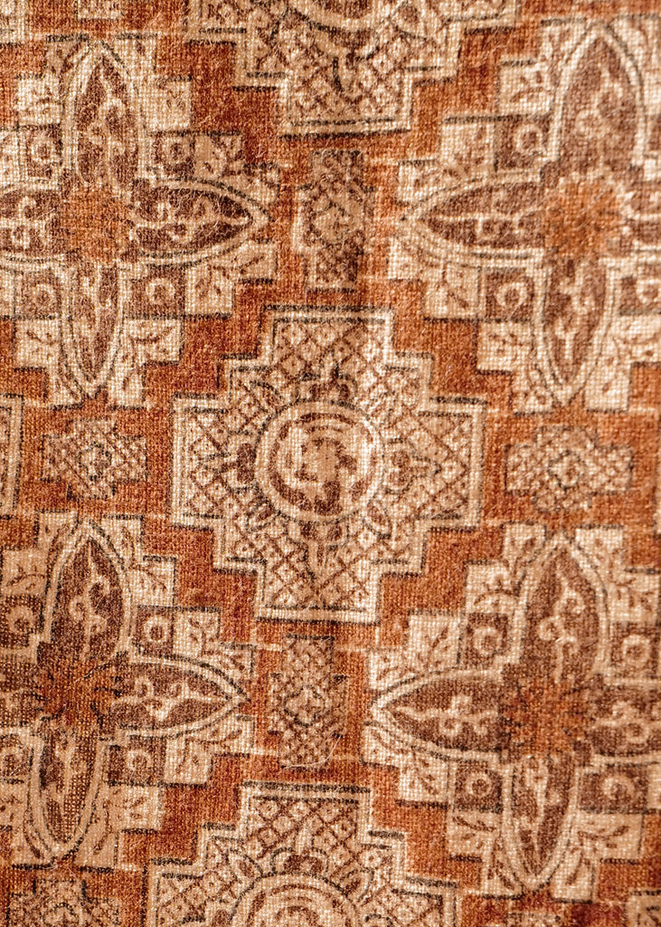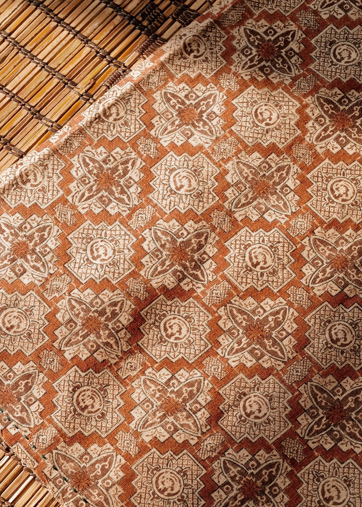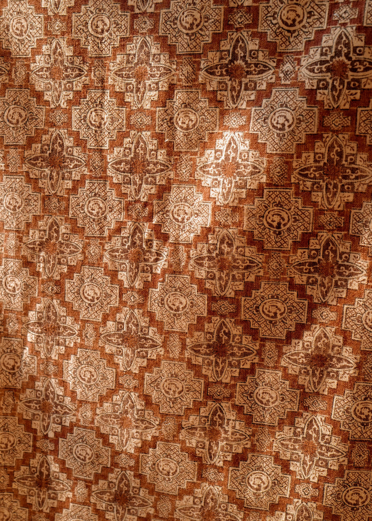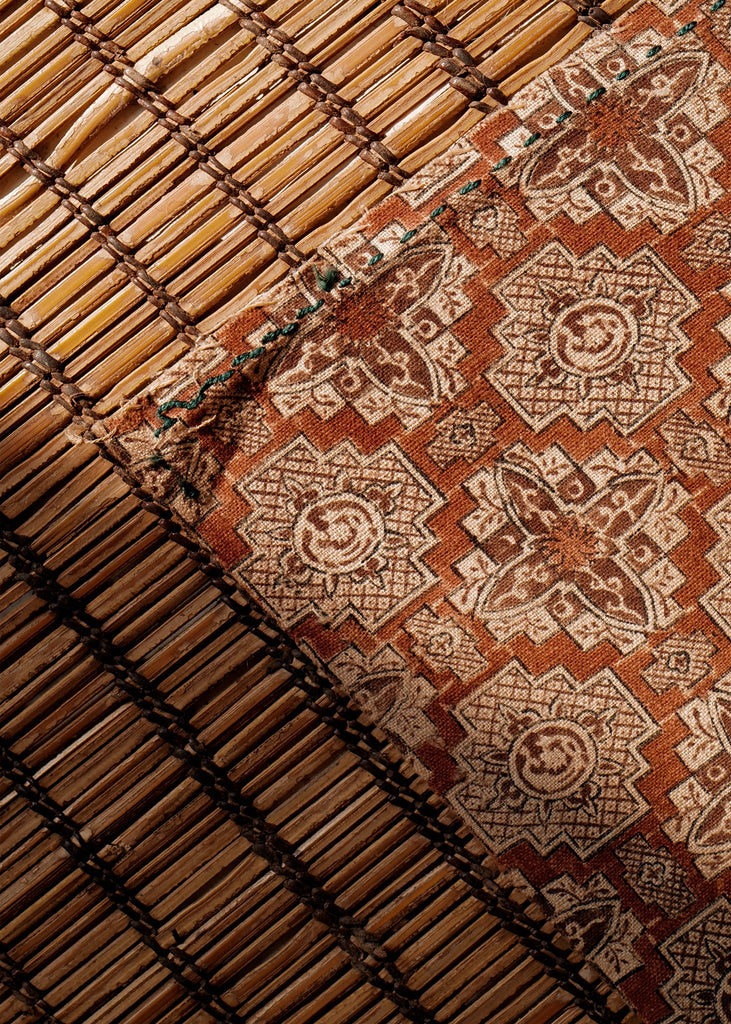 Made of cotton, the fabric has developed a soft, supple texture from years of use. Stitch marks along the edges and dye penetration to the back indicate a functional use, likely as a futon cover. Estimated to date from the late Edo period, Bunka-Bunsei era (1804–1830), reflecting the period’s highly detailed repeating patterns and the use of bengara (red iron oxide) pigment. One of a kind.
