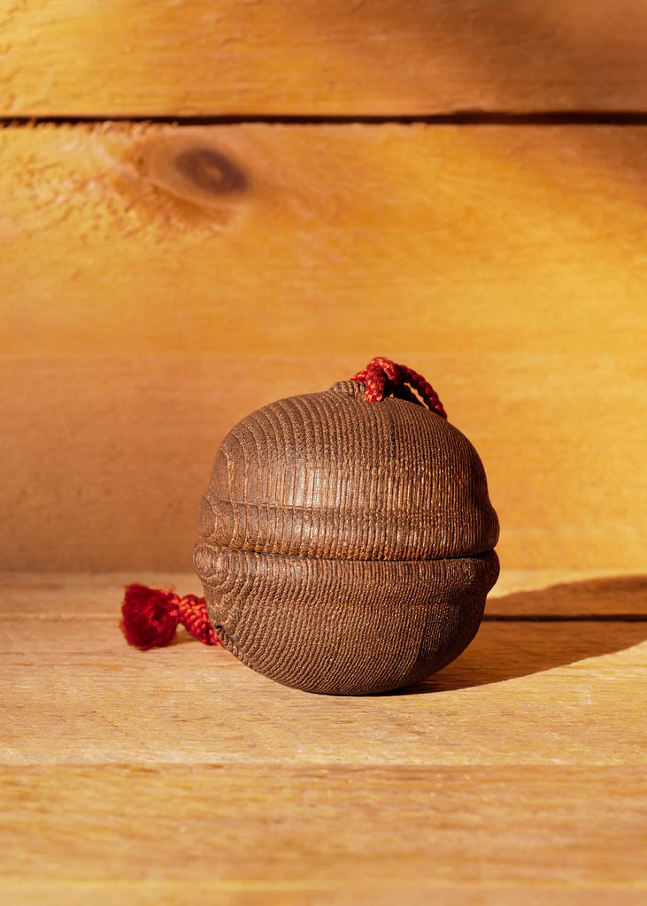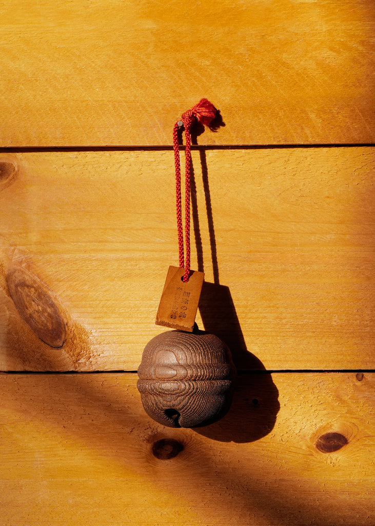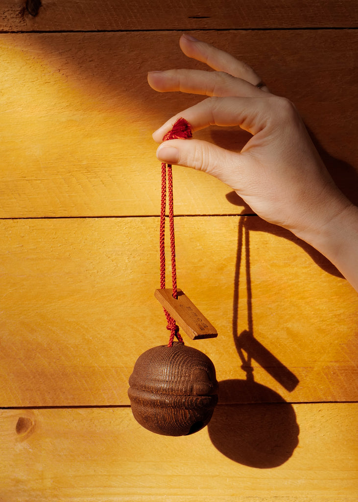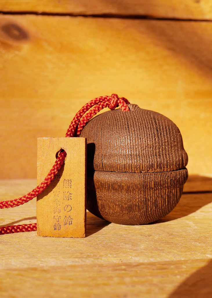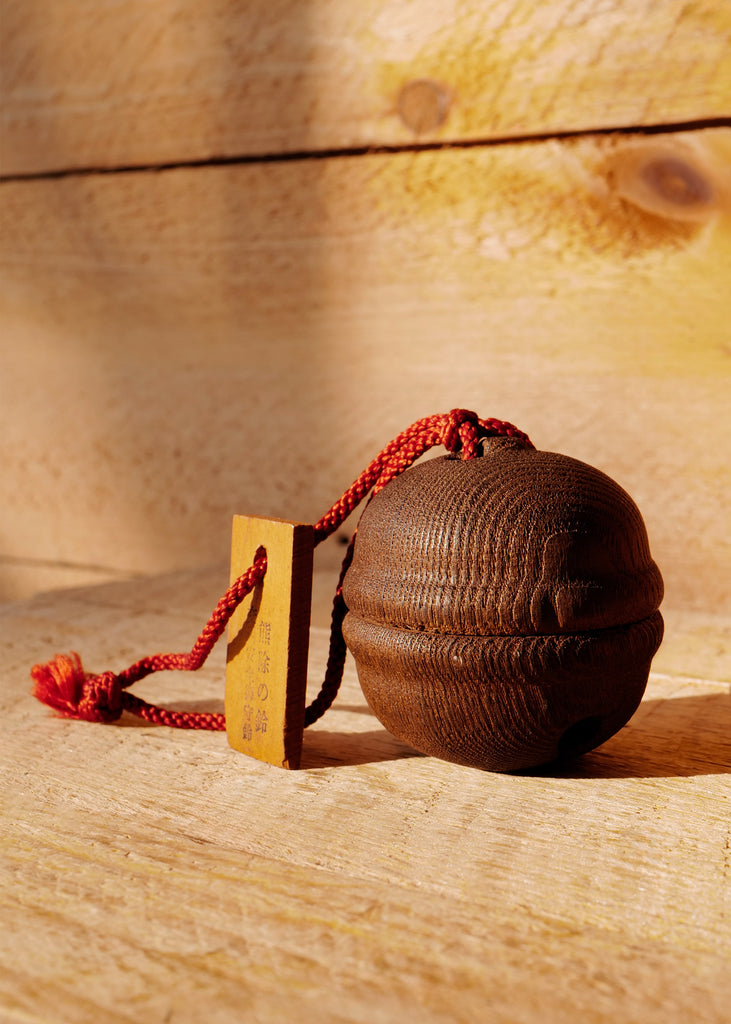 This Japanese Shinto bell is hand-carved from wood and contains a small metal bell that produces a clear tone when struck. Traditionally hung outside shrines, these bells typically served as talismans to warn of bears and protect visitors in forested areas. A red tassel and wooden tag are attached, inscribed with Japanese characters translating to “To Protect Against Bears, Safety Amulet Bell.” One of a kind.
