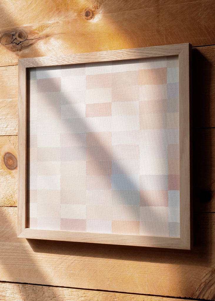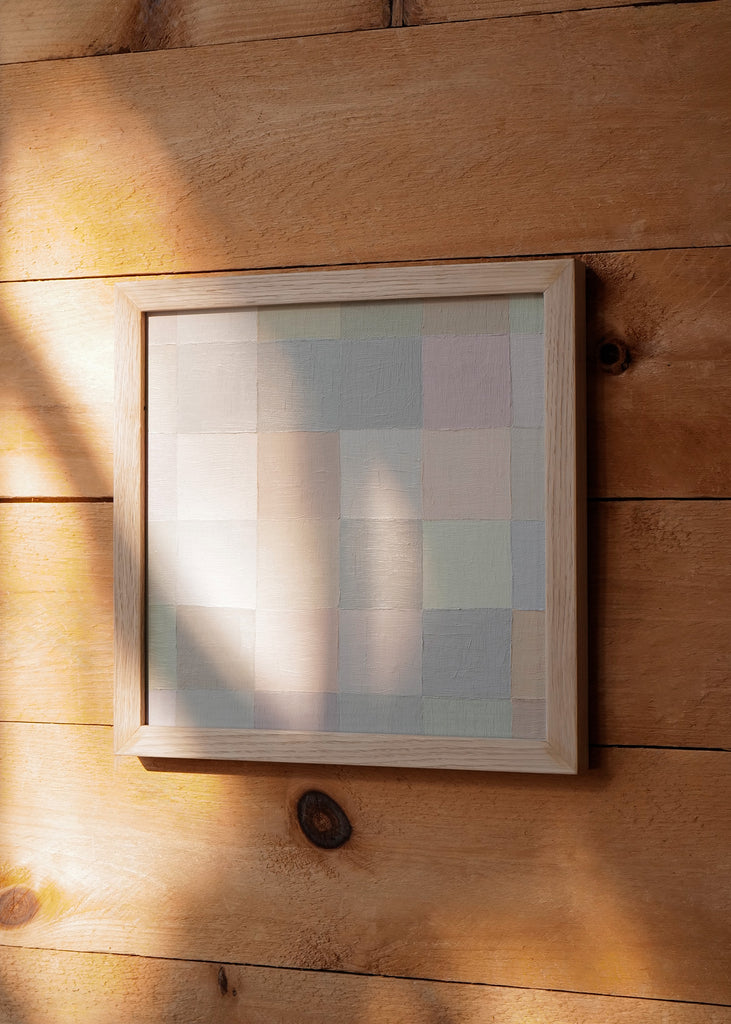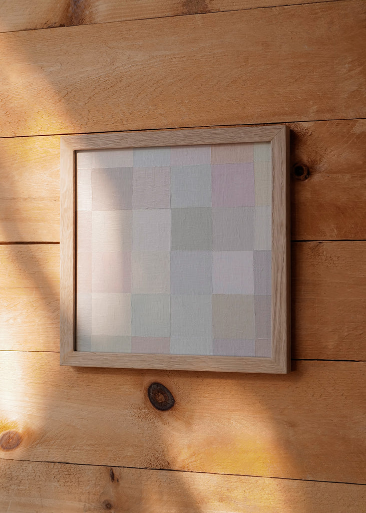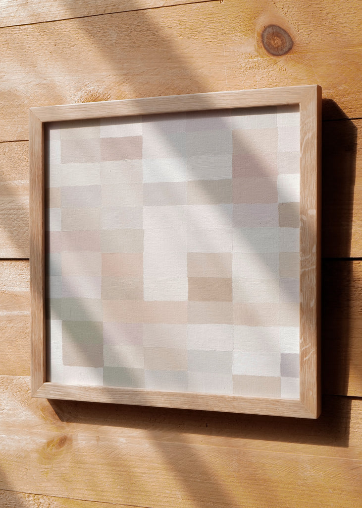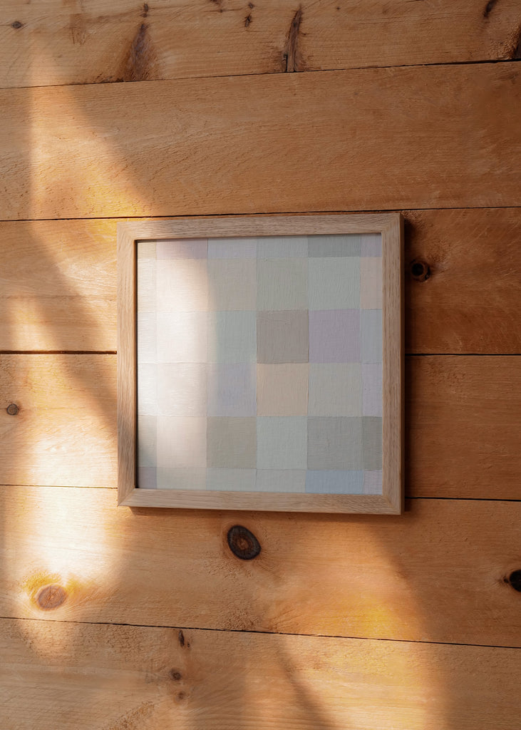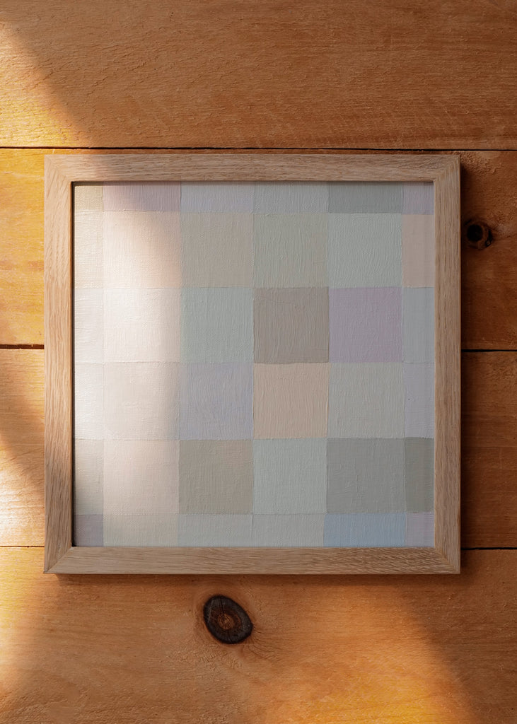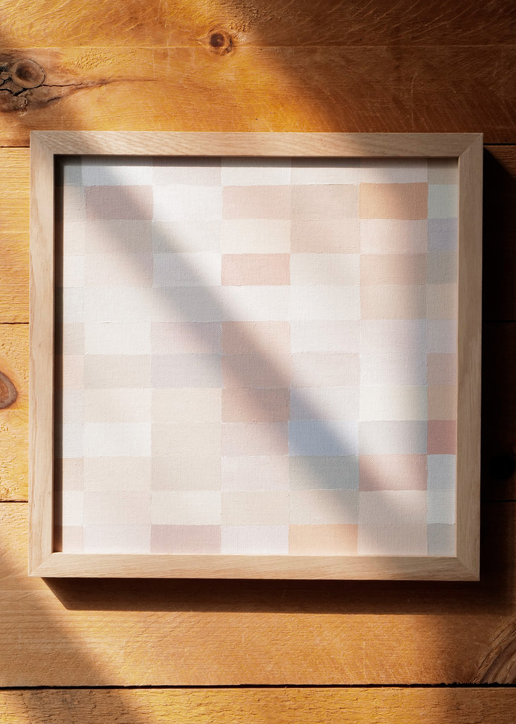 These one-of-a-kind meditative painting feature soft cool beige tonal colors and abstract geometric patterns. Inspired by Bauhaus artists like Paul Klee and Anni Albers, the work experiments with color, shape, scale, and rhythm. Framed in a simple white oak frame.
