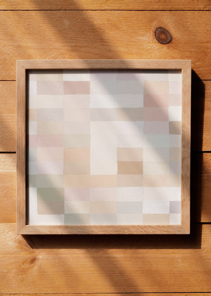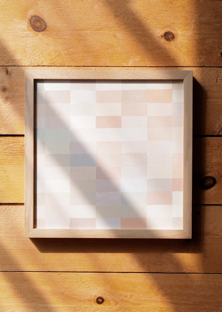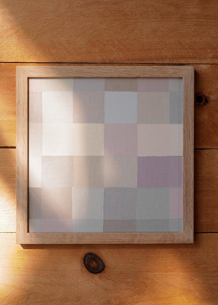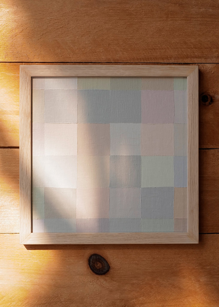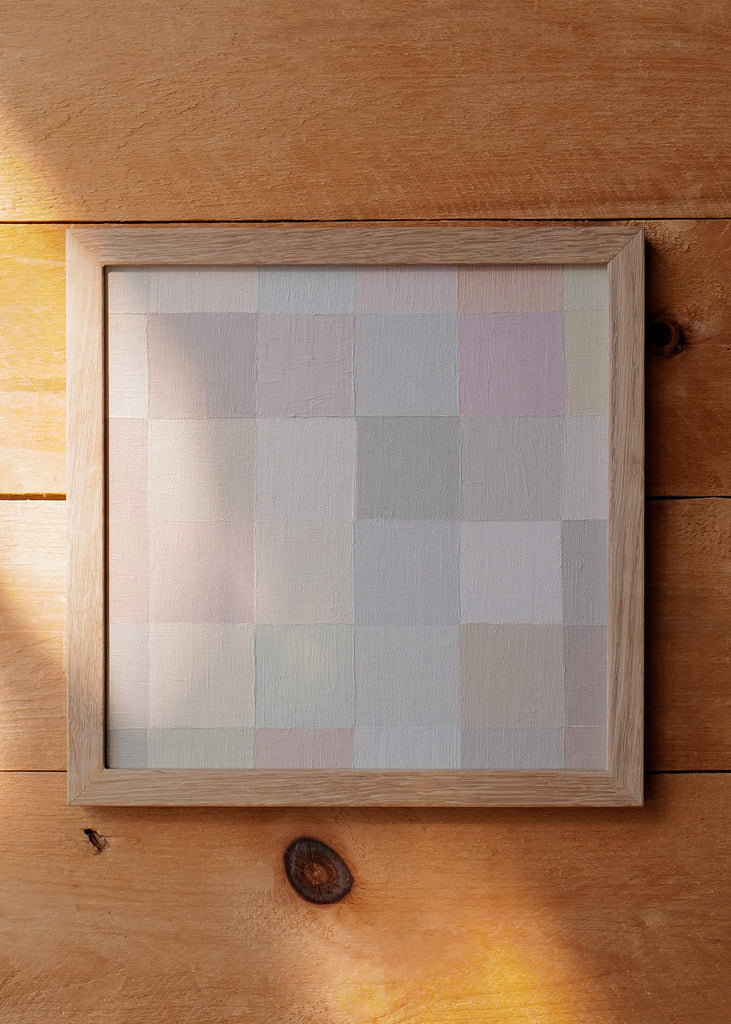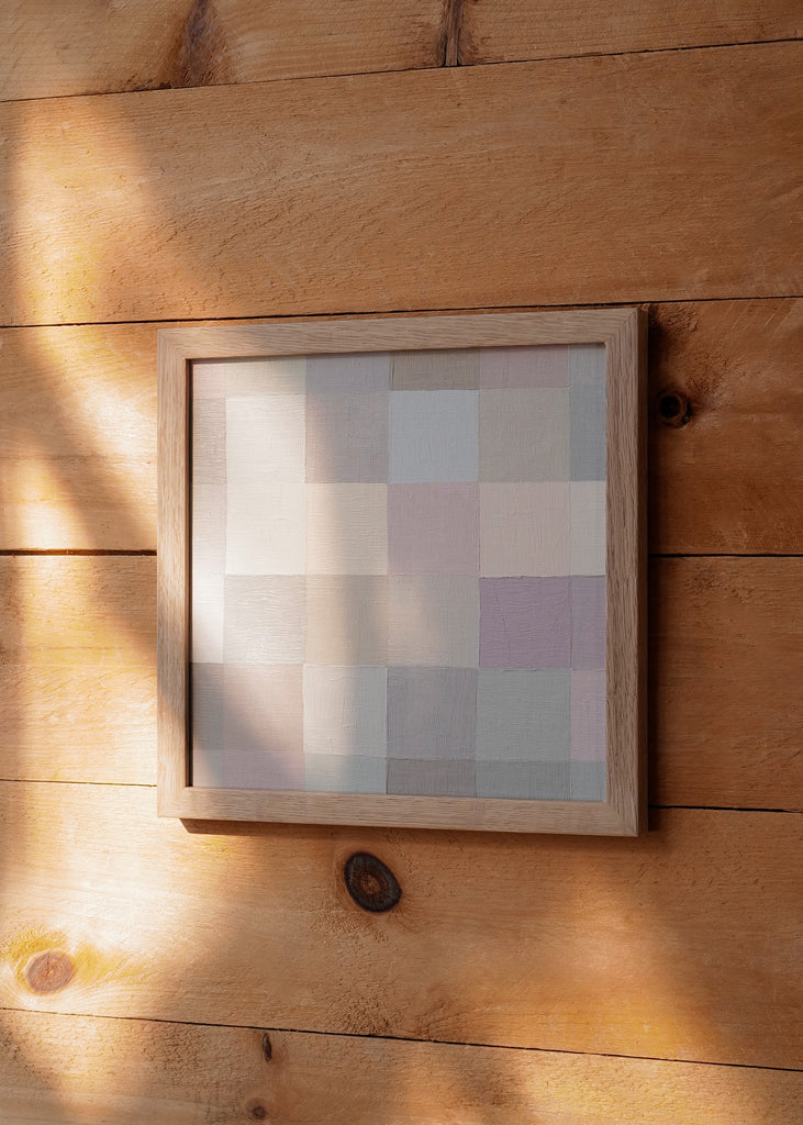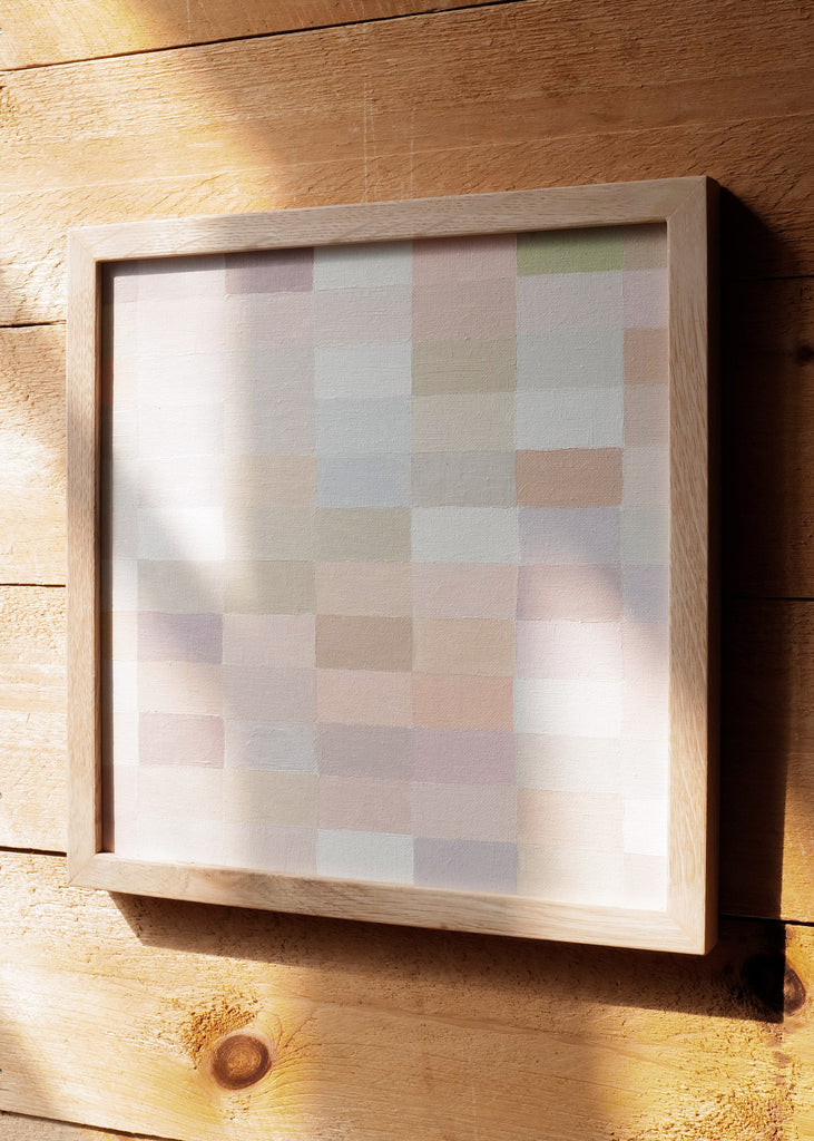 These one-of-a-kind meditative painting feature soft cool beige tonal colors and abstract geometric patterns. Inspired by Bauhaus artists like Paul Klee and Anni Albers, the work experiments with color, shape, scale, and rhythm. Framed in a simple white oak frame.