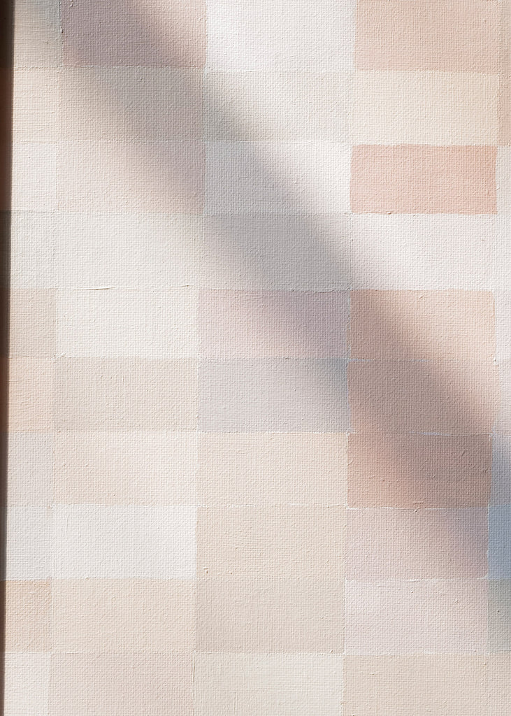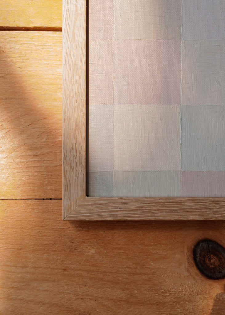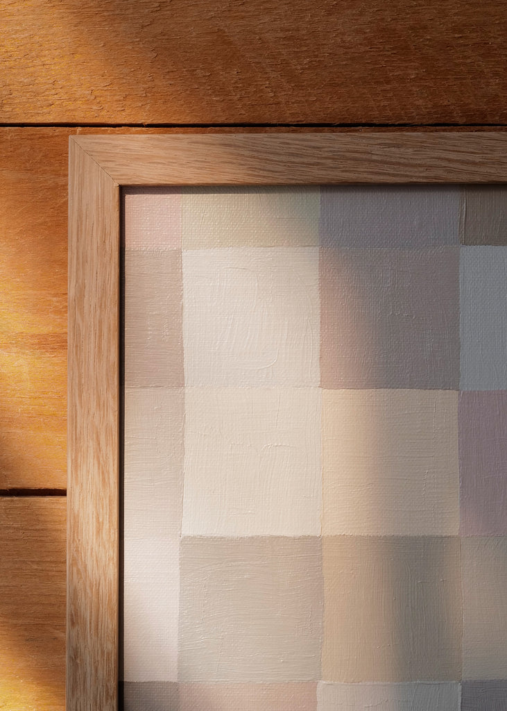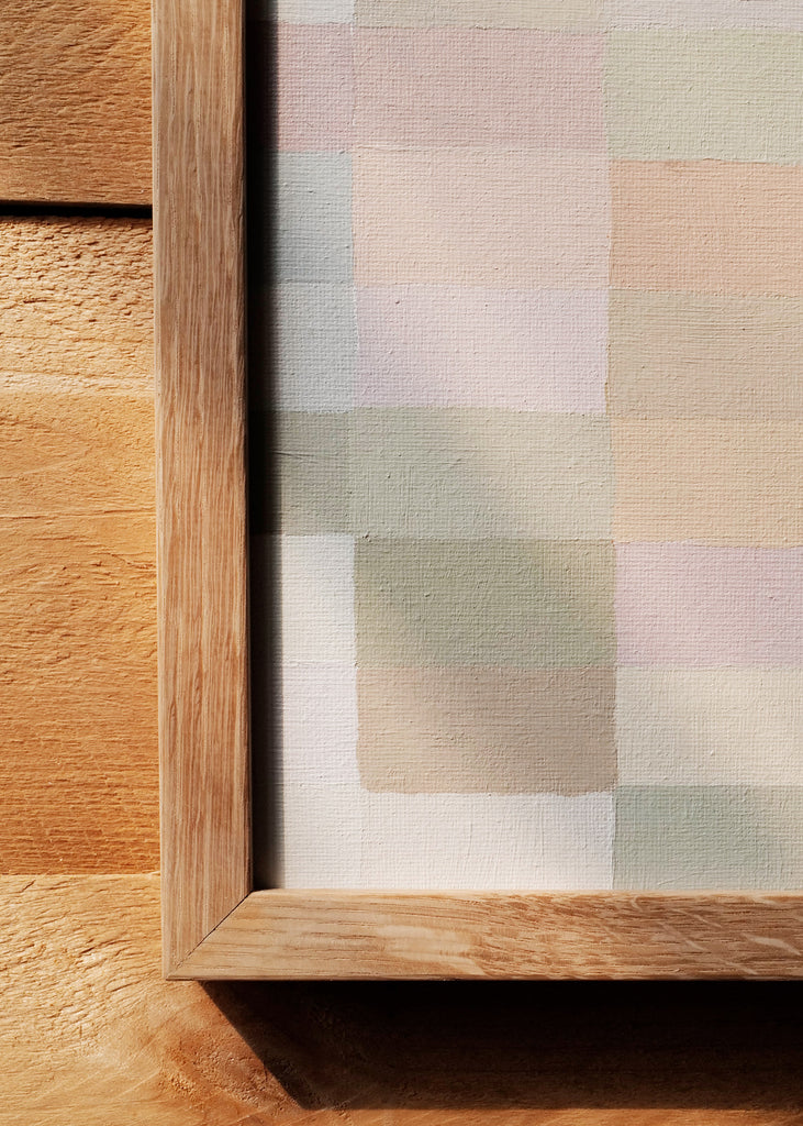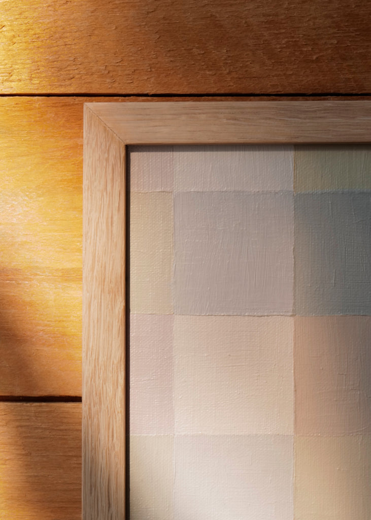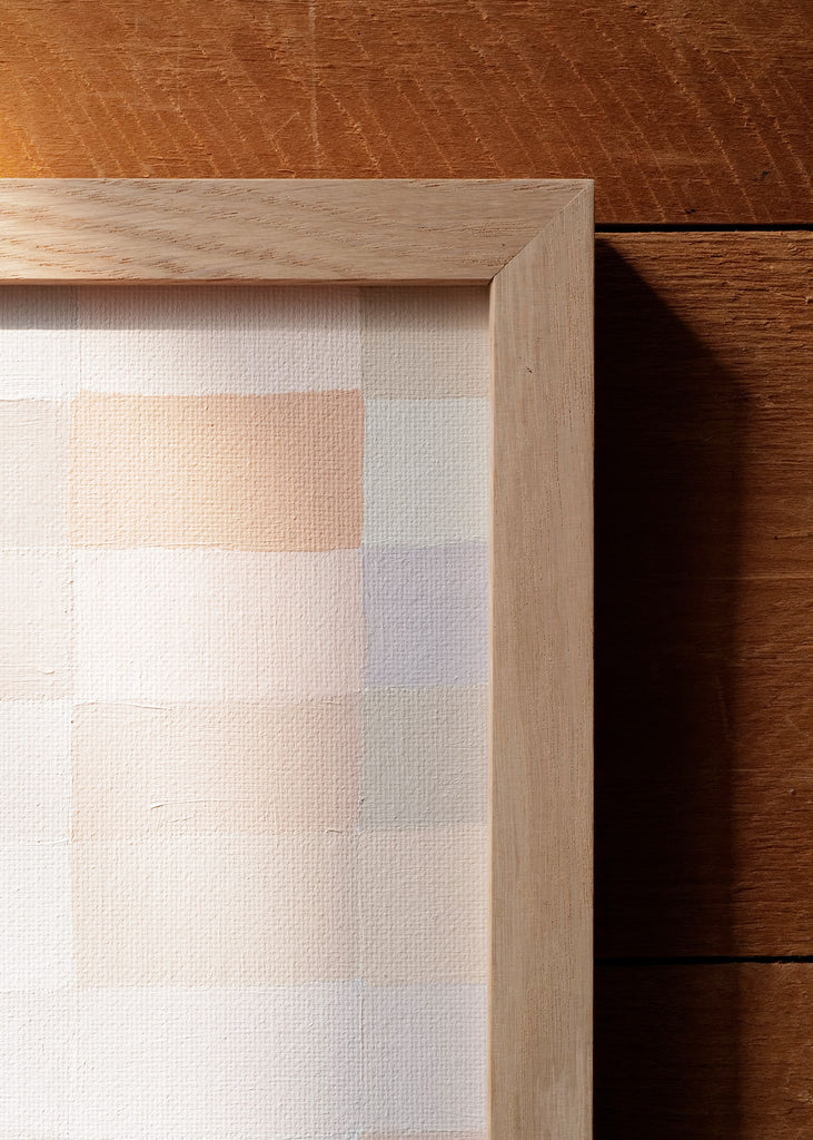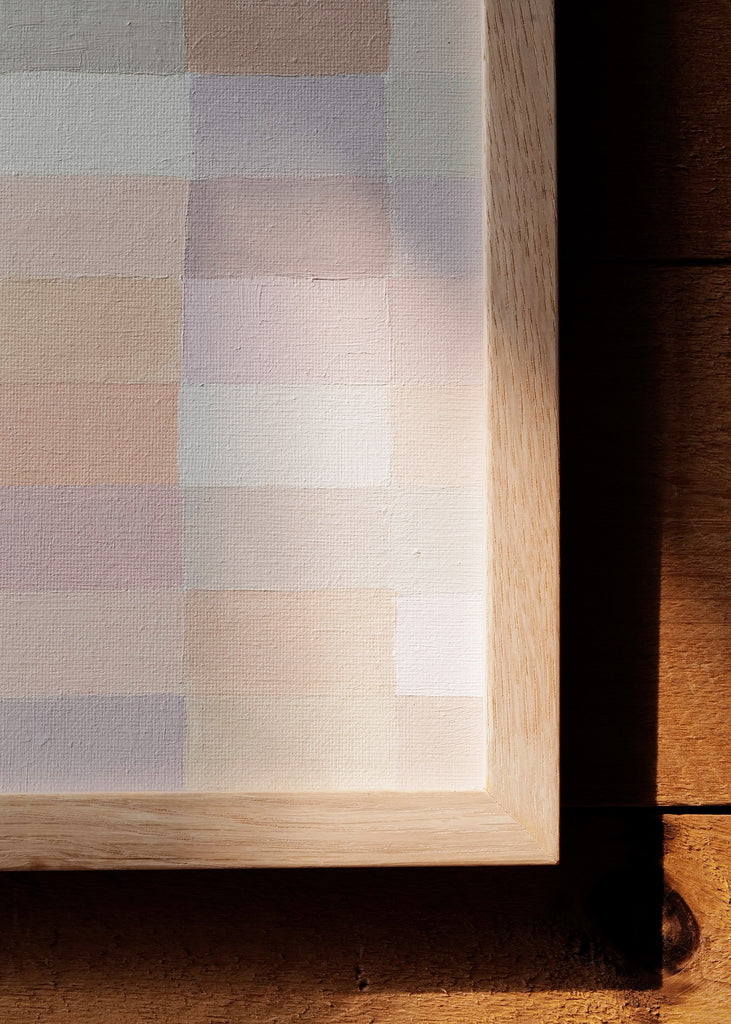 These one-of-a-kind meditative painting feature soft cool beige tonal colors and abstract geometric patterns. Inspired by Bauhaus artists like Paul Klee and Anni Albers, the work experiments with color, shape, scale, and rhythm. Framed in a simple white oak frame.