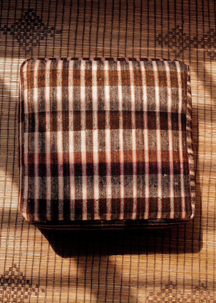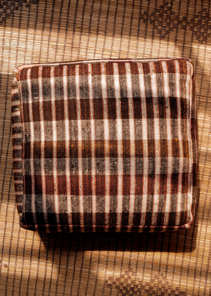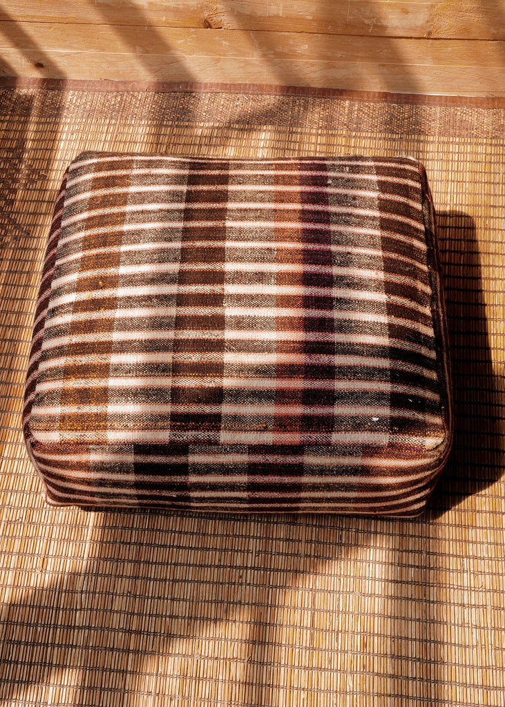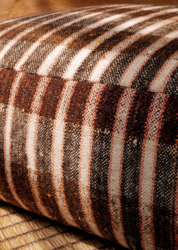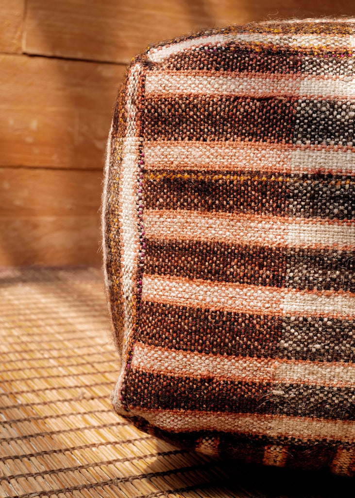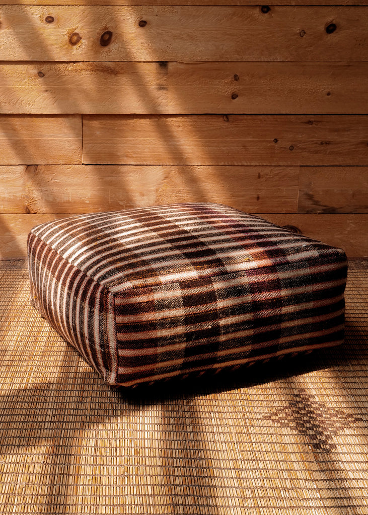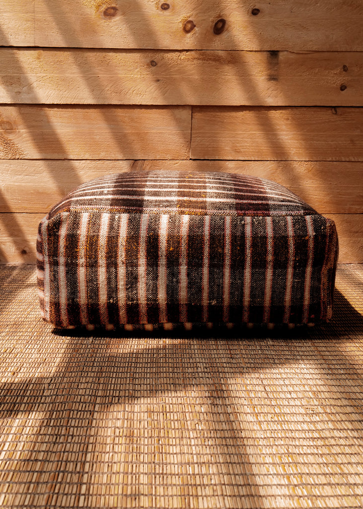Each Colina Harvest Ottoman is a one-of-a-kind piece from Portugal, made using vintage grain sacks traditionally handwoven by women and dyed with plant-based pigments. Once used to store and carry the season’s harvest, the sacks carry the texture and history of their past lives. Each ottoman is handmade and filled with 100% natural Portuguese cork, offering a lightweight yet sturdy shape. Each piece is unique with varying stripe patterns, patchwork, mending, and design. Photos showcase the range of designs in this color way. One of a kind.