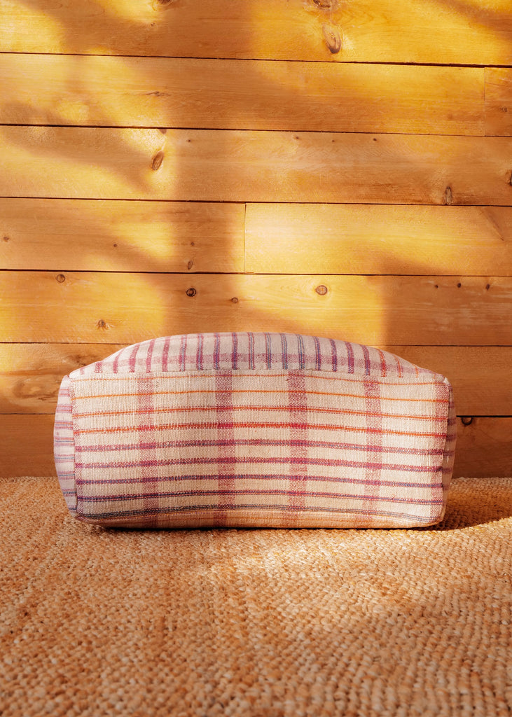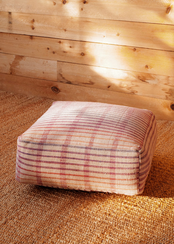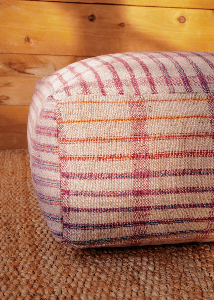 Each Colina Harvest Ottoman is a one-of-a-kind piece from Portugal, made using vintage grain sacks traditionally handwoven by women and dyed with plant-based pigments. Once used to store and carry the season’s harvest, the sacks carry the texture and history of their past lives. Each ottoman is handmade and filled with 100% natural Portuguese cork, offering a lightweight yet sturdy shape. Each piece is unique with varying stripe patterns, patchwork, mending, and design. Photos showcase the range of designs in this color way. One of a kind.