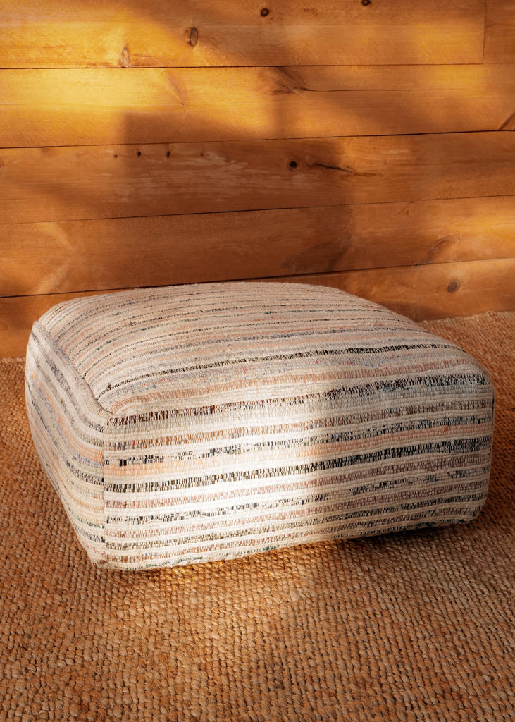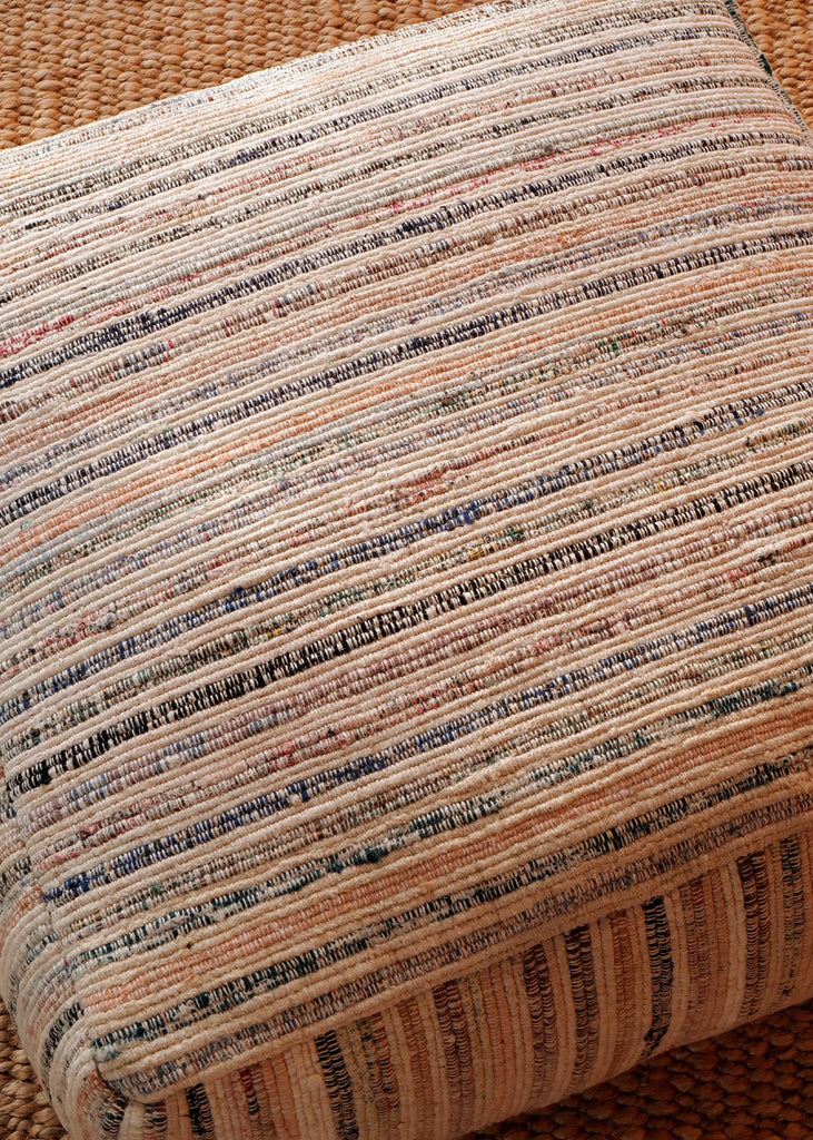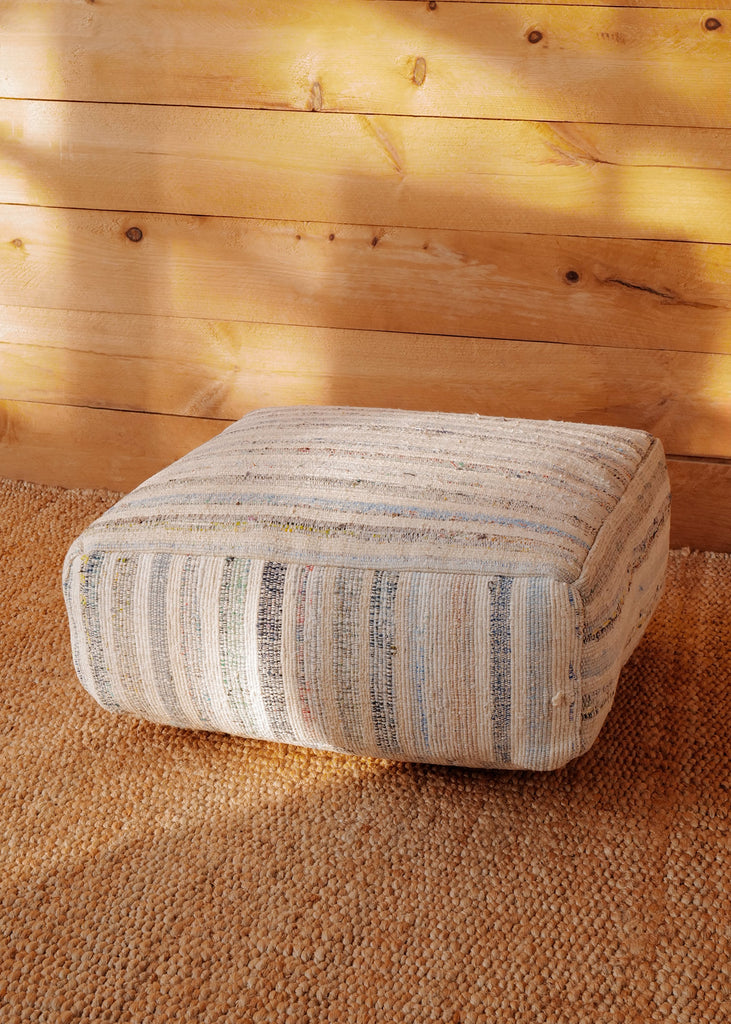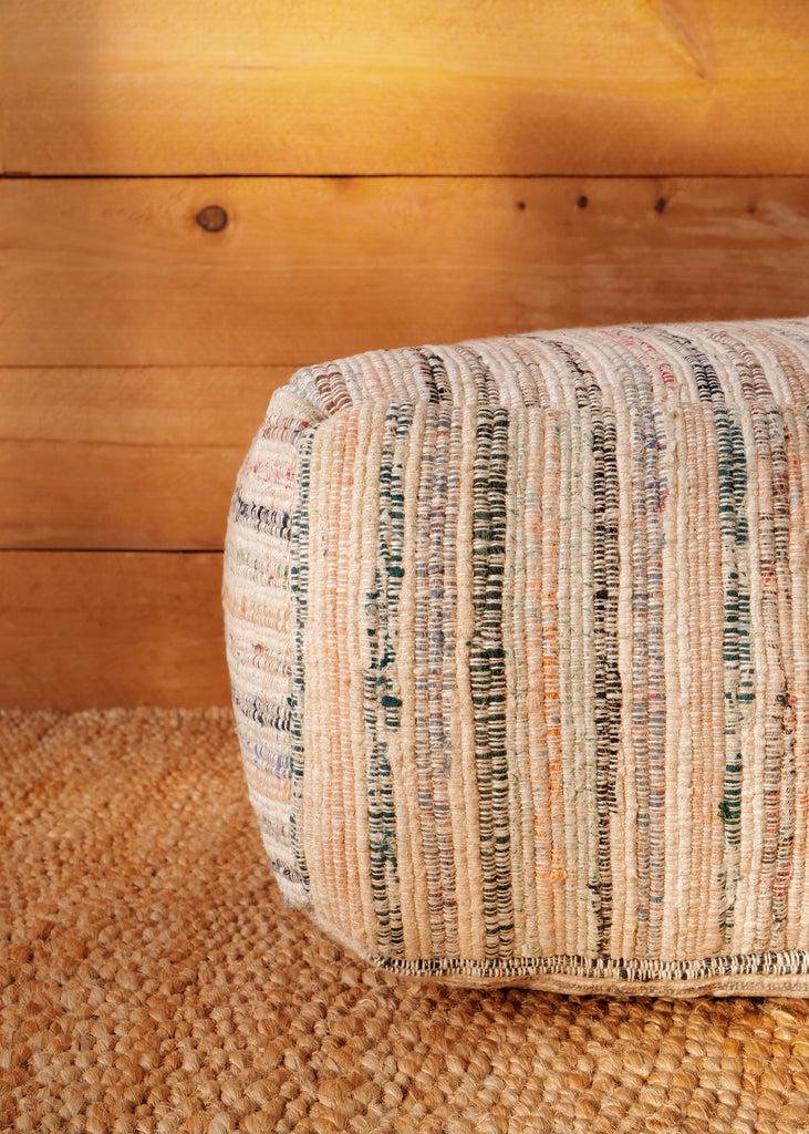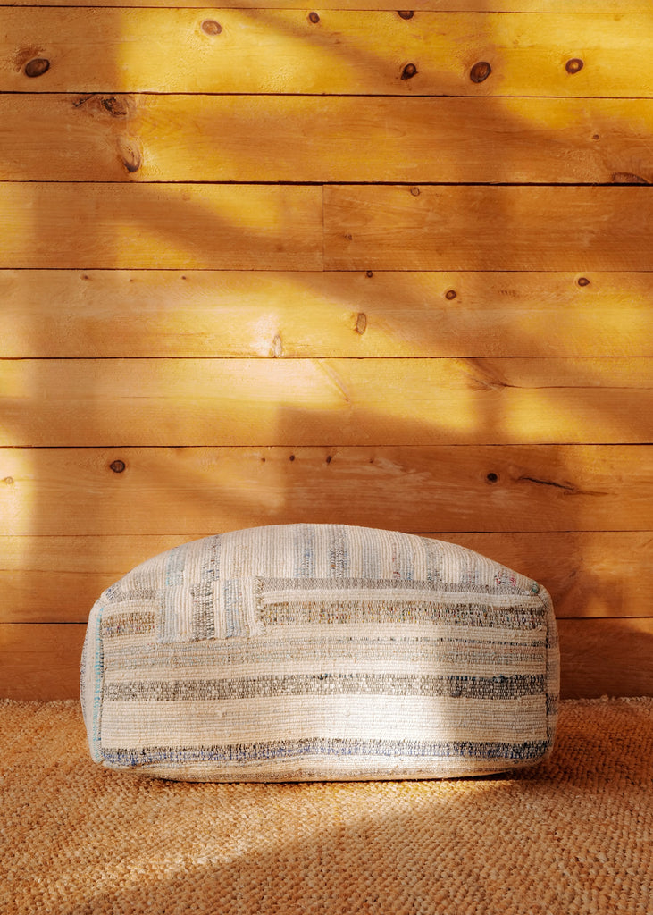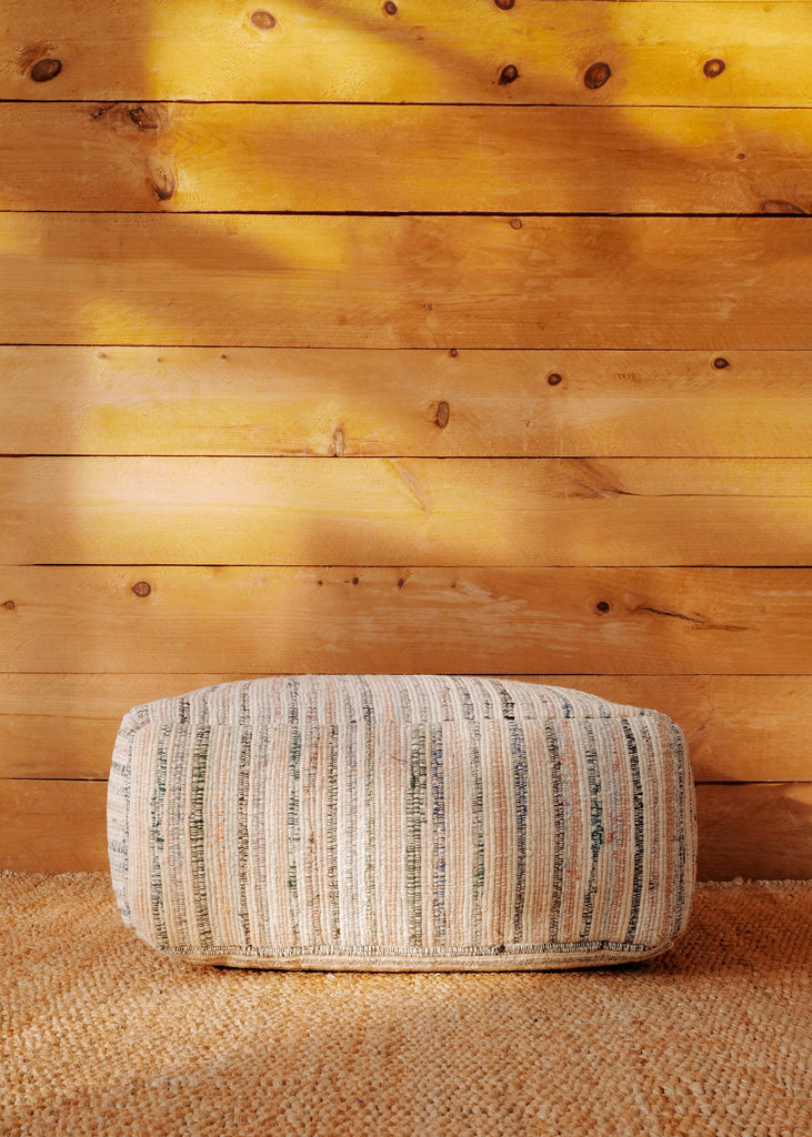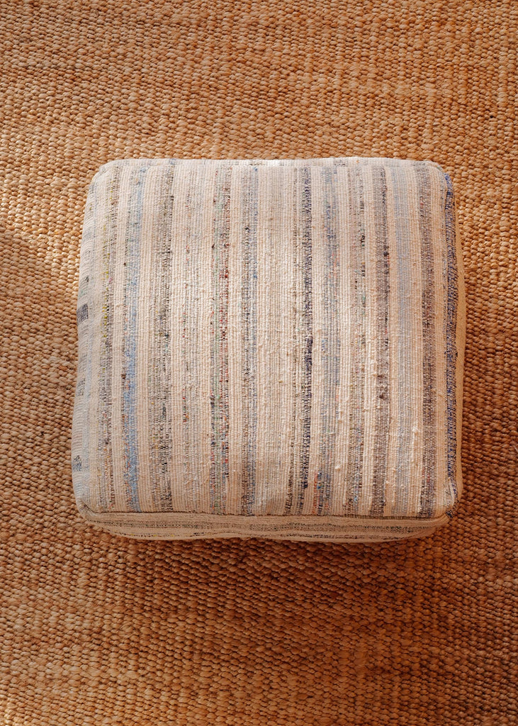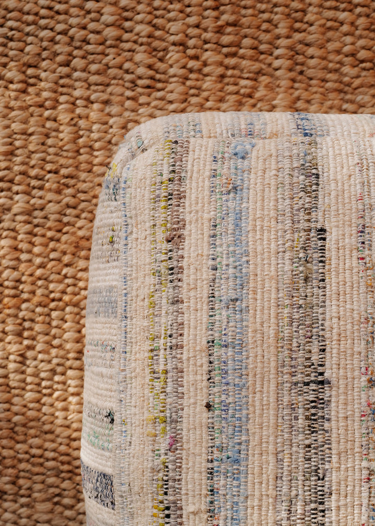 Handmade in Portugal from vintage grain sacks once used to transport seasonal harvests, this ottoman is crafted with handwoven, plant-dyed fabric. The textile retains subtle signs of its previous use, including irregular stripes and mending, reflecting its history. Filled with 100% natural Portuguese cork, the ottoman is both lightweight and structurally resilient. Please note that each piece varies slightly in color and pattern. One of a kind.
