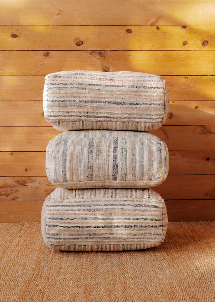 Care: Please note that the cork inside of the ottoman is freshly cut and has a warm scent, similar to oak. Leave the ottomans out and the scent will fade over time. Dry clean only.