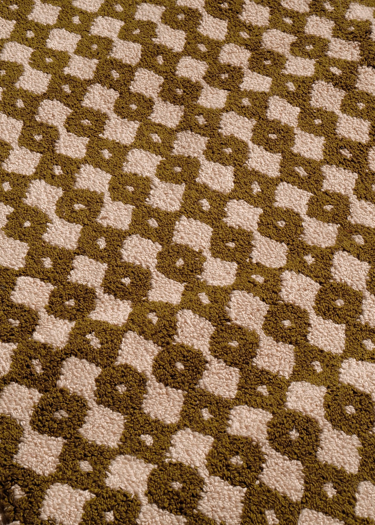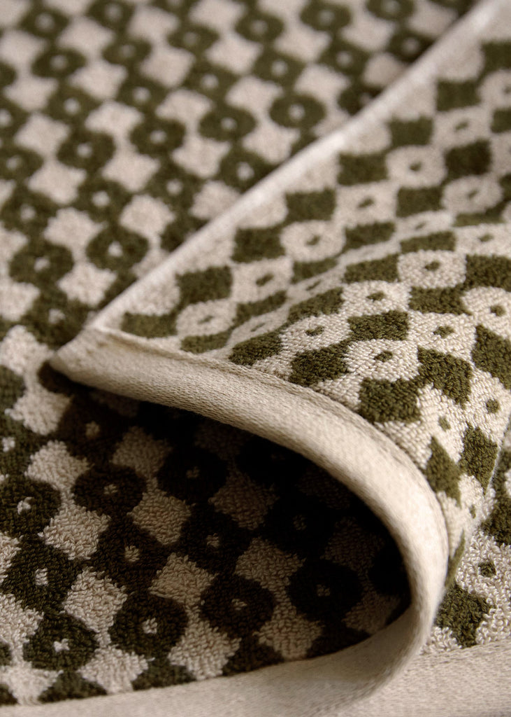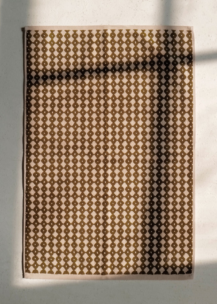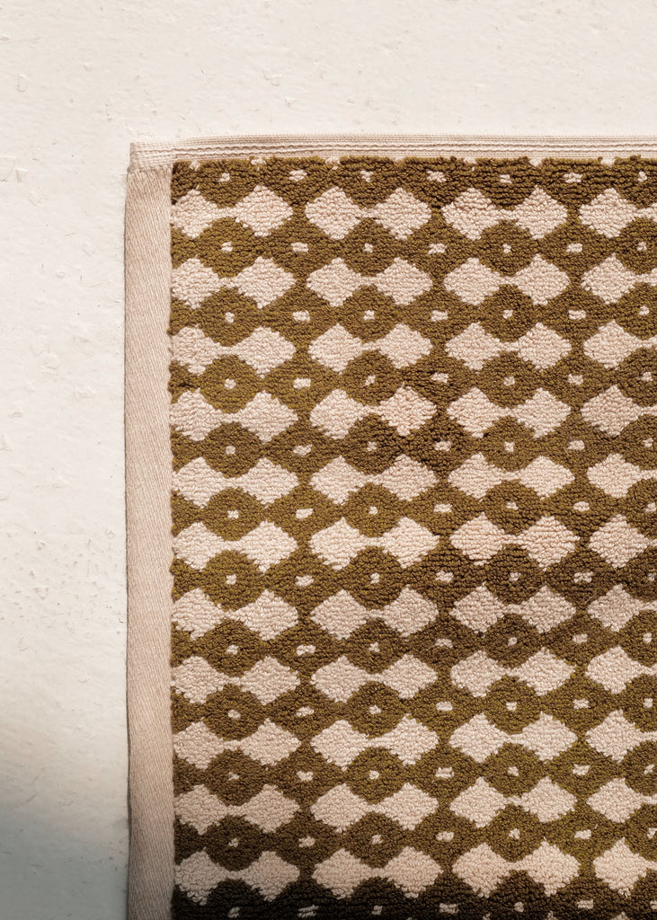 The Hana Bath Mat features a two-tone circle pattern inspired by traditional Katazome stenciling. Fully reversible in olive and ecru, it’s designed to look good no matter how it’s folded or hung. Made with thick double yarn, it’s both durable and soft underfoot, and the dense, even pile offers excellent absorbency and quick drying.