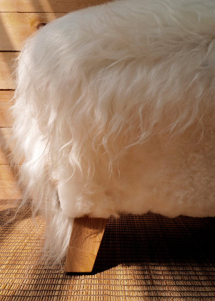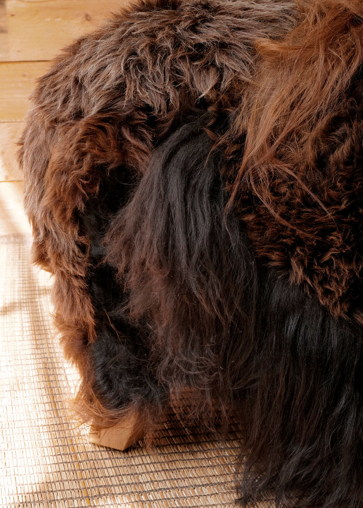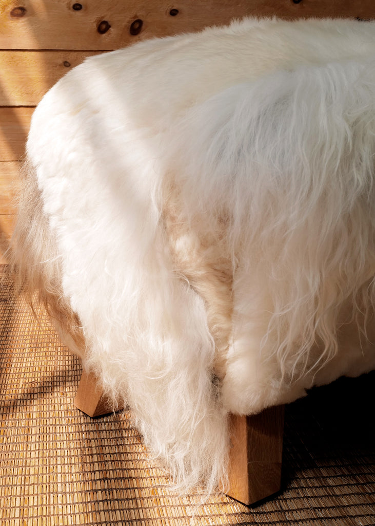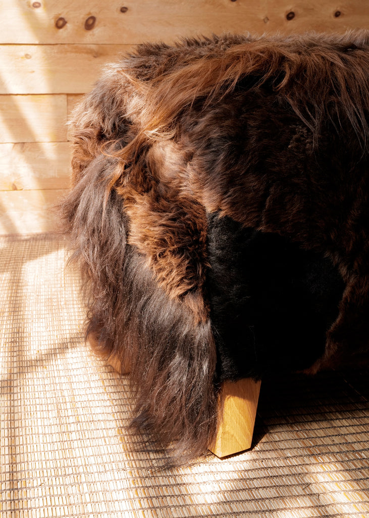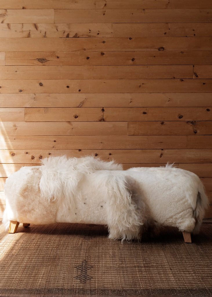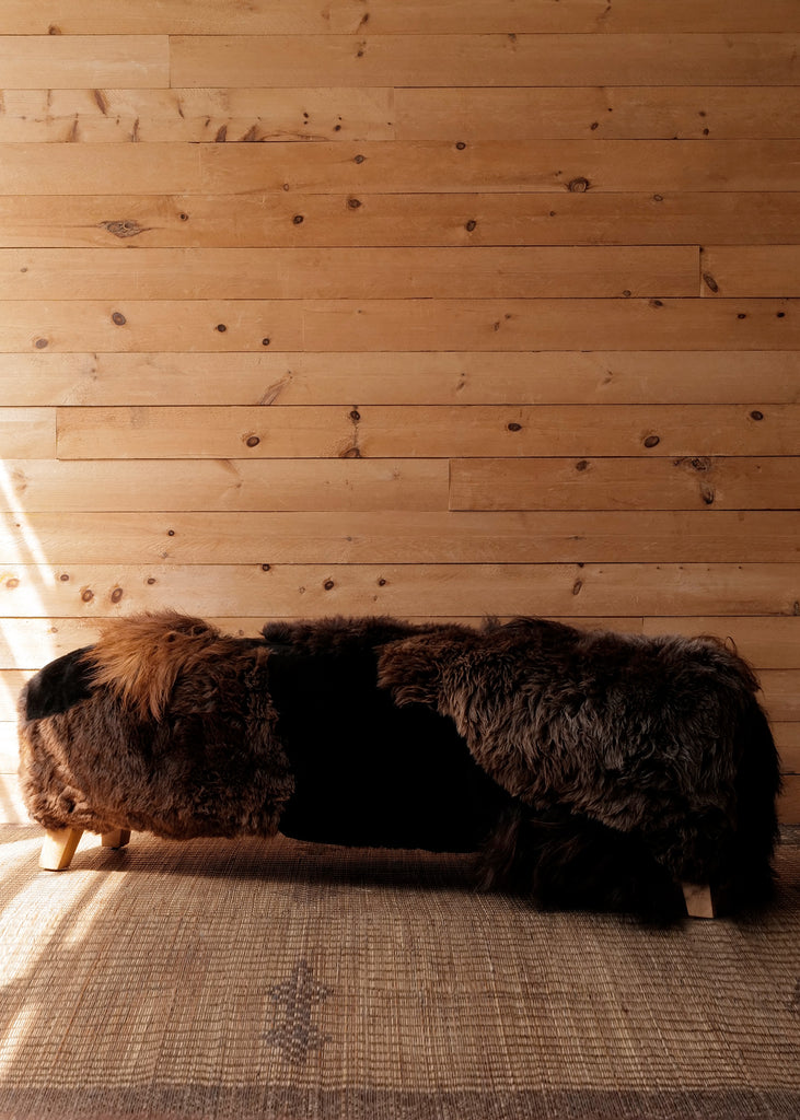 What makes this version of the Ithaca Bench truly unique is the Slow Roads upholstery program. We specialize in creating one-of-a-kind combinations using rare vintage fabrics, premium leather, hand-selected textiles, and our Saja Sheepskin design. Saja is offered in three naturally undyed melange colorways, (Warm White, Grey, and Brown) each made from a blend of unbleached furs with their own natural variations in tone, texture, and length. The result is a surface rich in depth and character, ranging from warm to cool and light to dark.