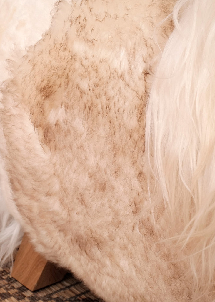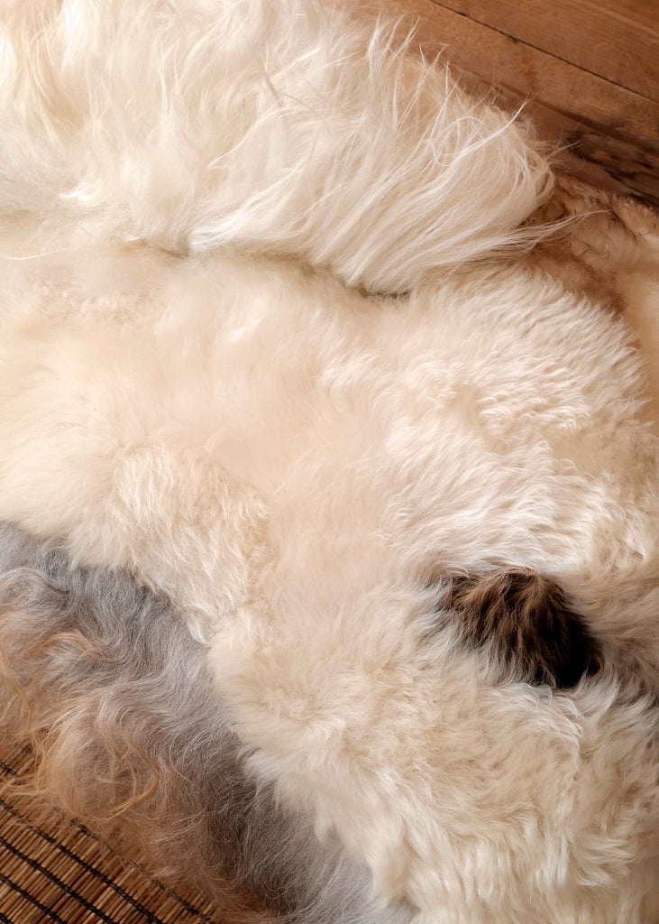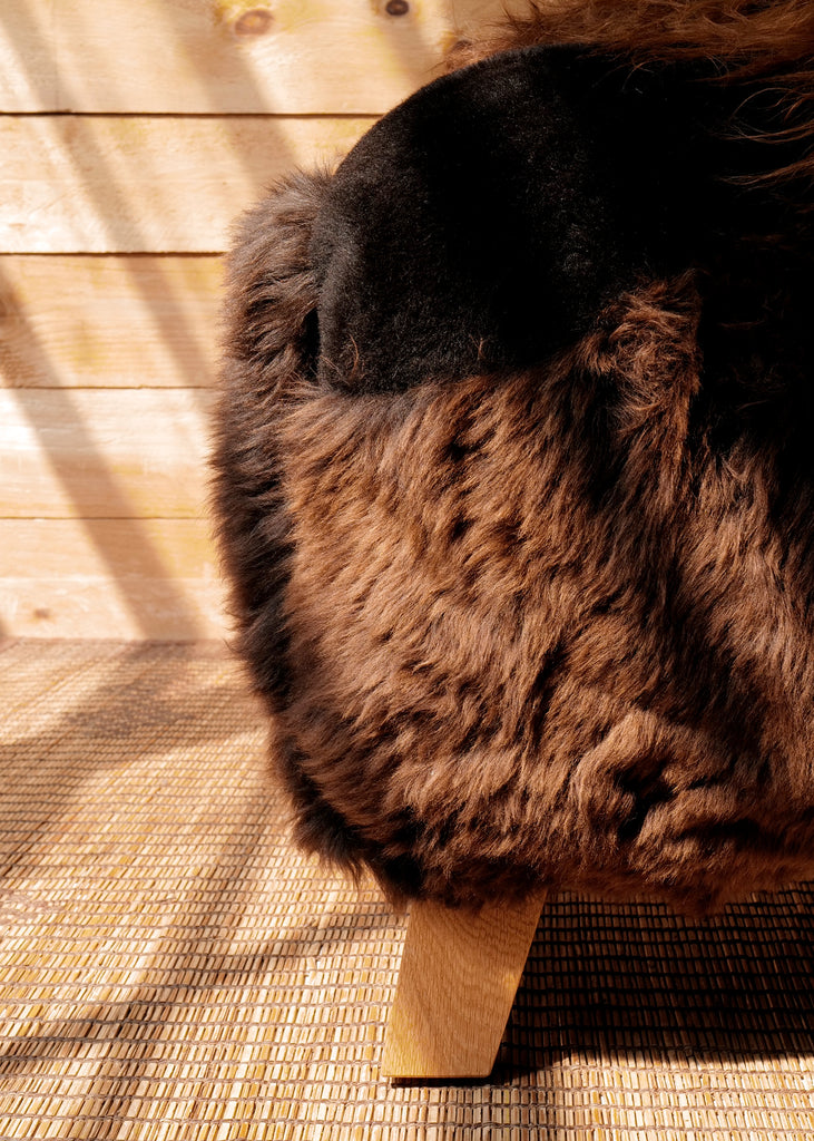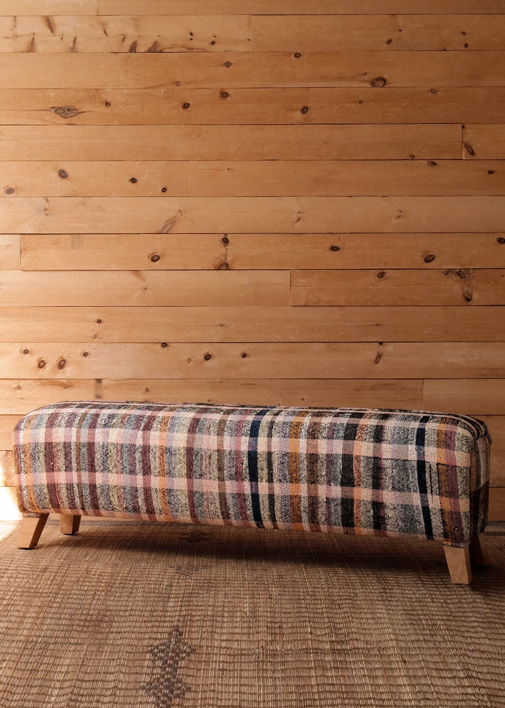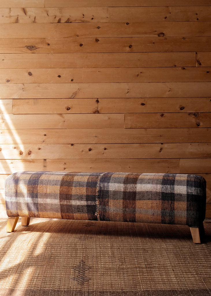 What makes this version of the Ithaca Bench truly unique is the Slow Roads upholstery program. We specialize in creating one-of-a-kind combinations using rare vintage fabrics, premium leather, hand-selected textiles, and our Saja Sheepskin design. Saja is offered in three naturally undyed melange colorways, (Warm White, Grey, and Brown) each made from a blend of unbleached furs with their own natural variations in tone, texture, and length. The result is a surface rich in depth and character, ranging from warm to cool and light to dark.