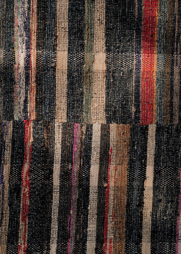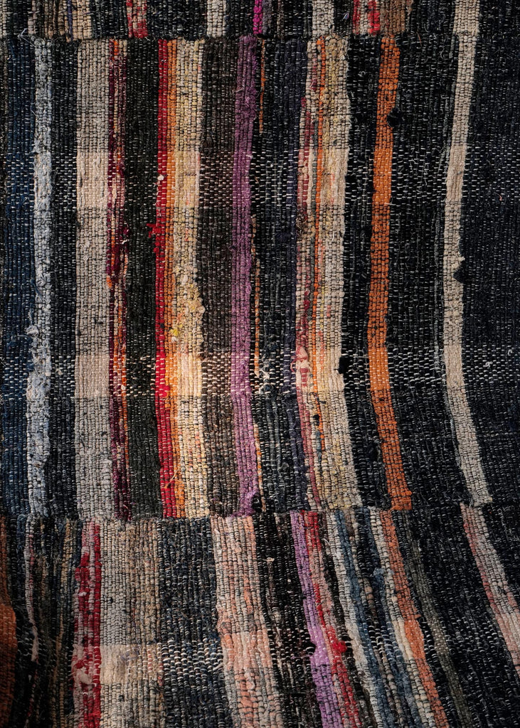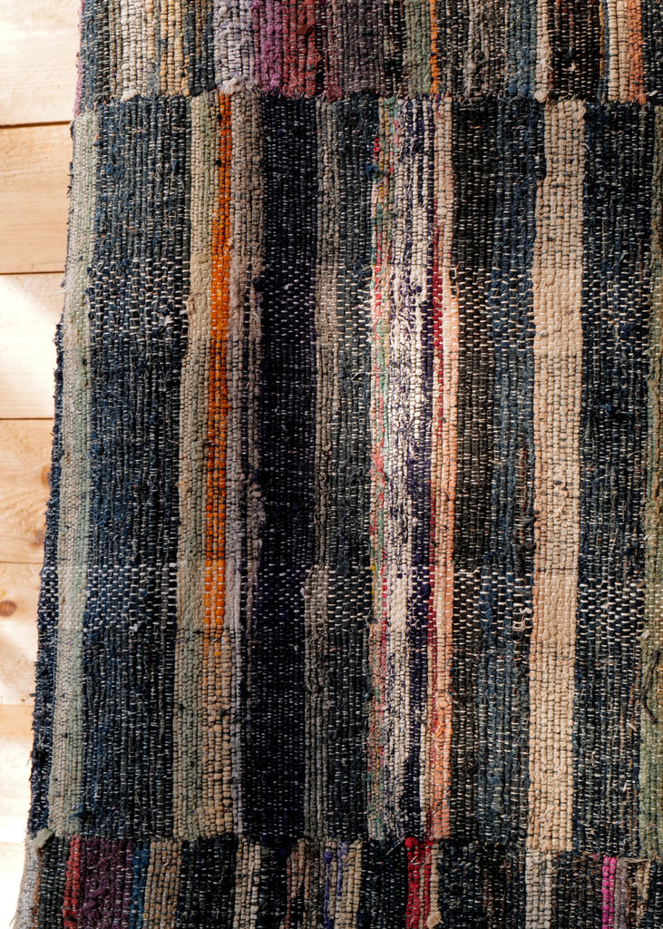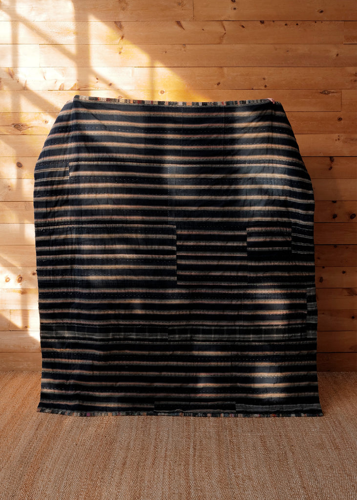 The Muzumi Sakiori Boro Rug is one of the best examples of a sakiori textiles we've come across. The 1960s piece is in near perfect condition, and features a warm palette reminiscent of autumn in Japan. Sakiori is a traditional form of Japanese weaving that recycles vintage textiles into a beautifully variegated functional cloth that is used for clothing, obis, rugs and blankets. We recommend using this piece as a rug, or as a bed topper draped at the end of a bed. One of a kind.