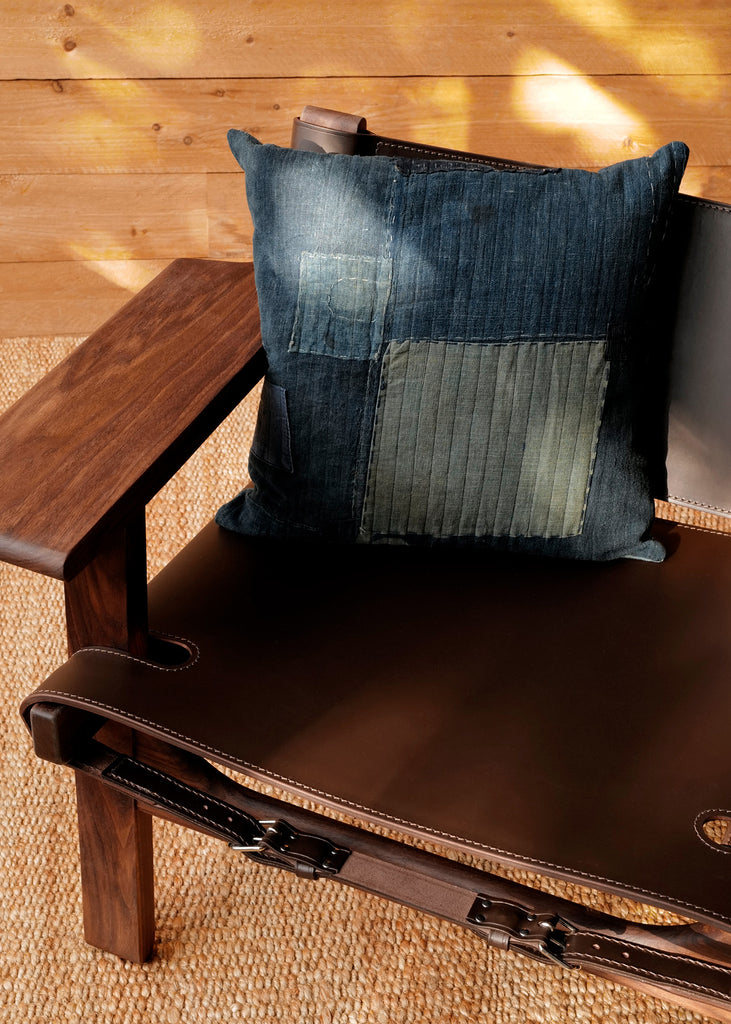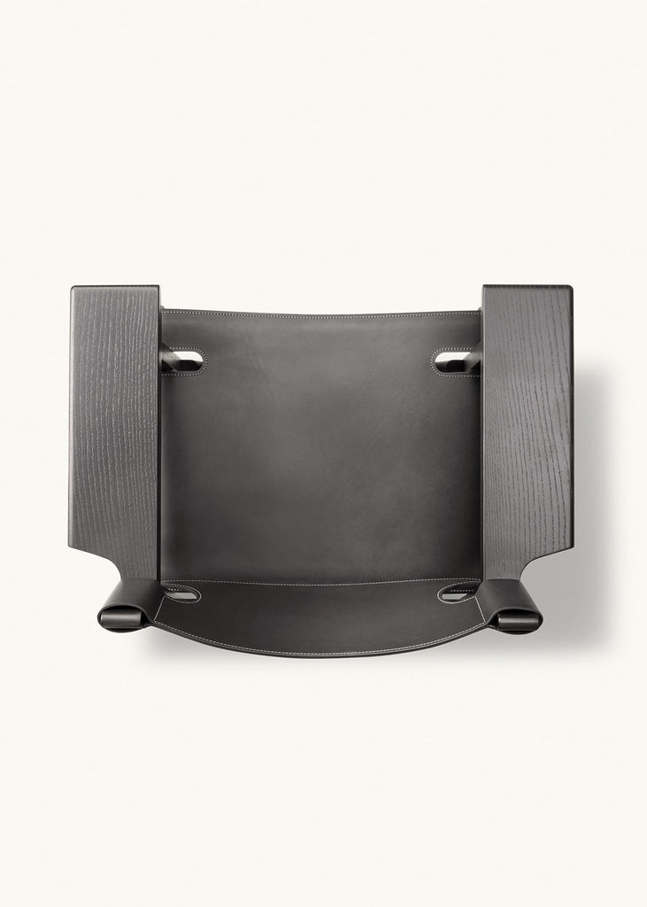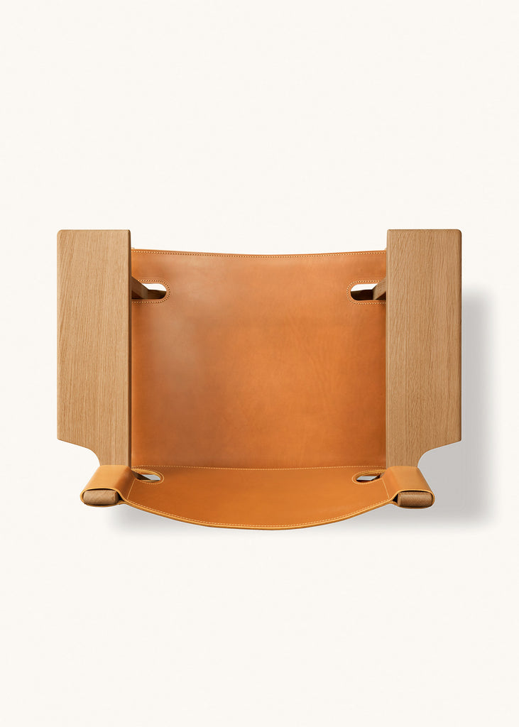 Construction: Solid wood and saddle leather. Interchangeable seat and back made in vegetable tanned saddle leather with metal buckles. Leather seat has canvas backing. Saddle straps can be tightened as the leather expands through use.