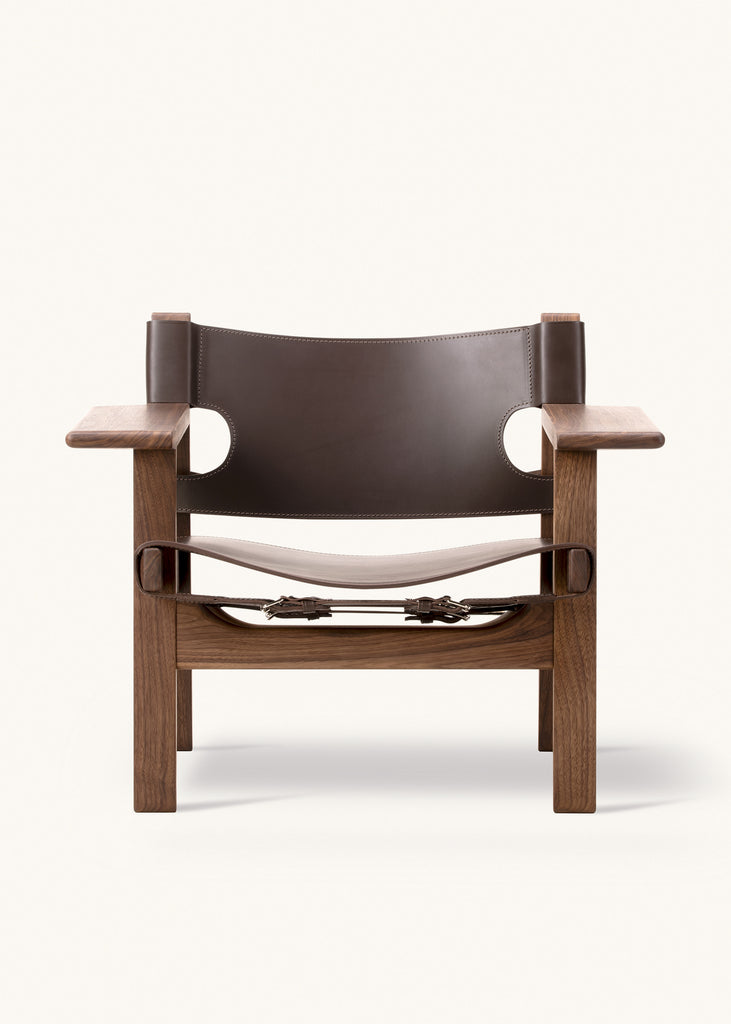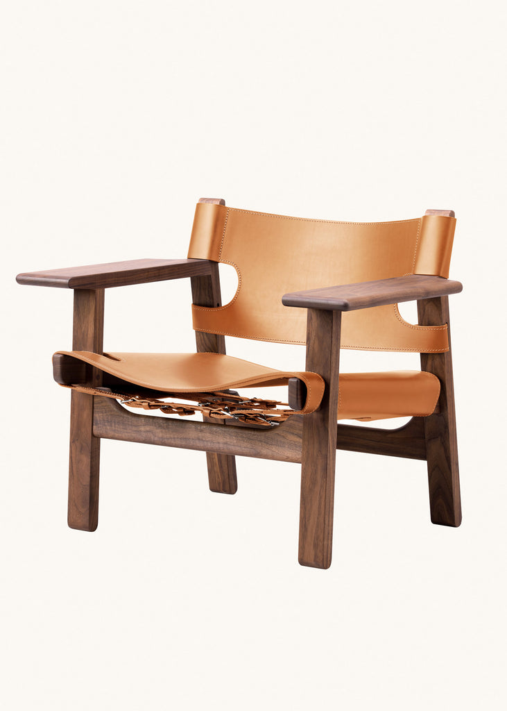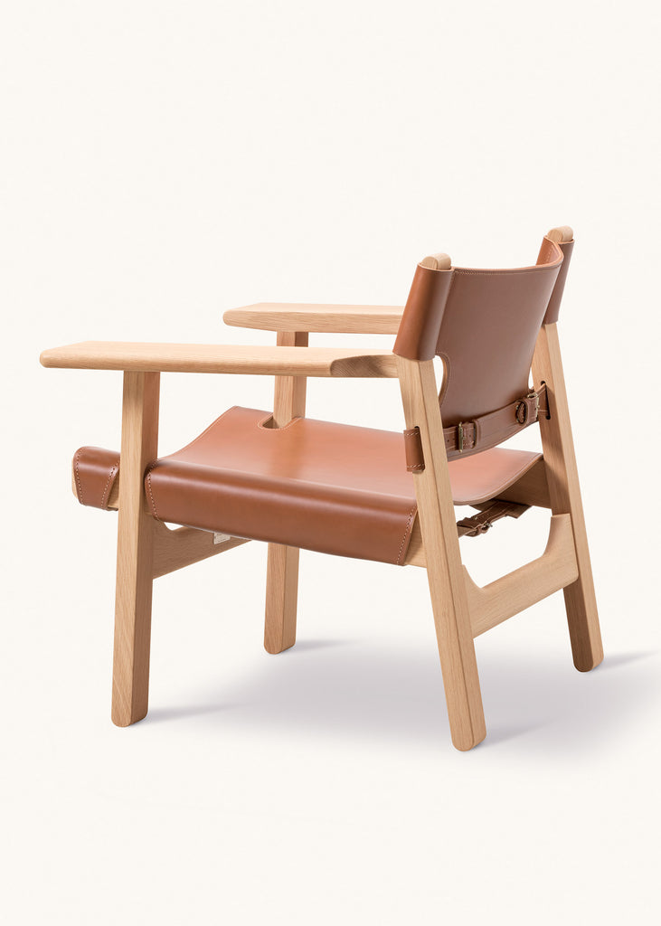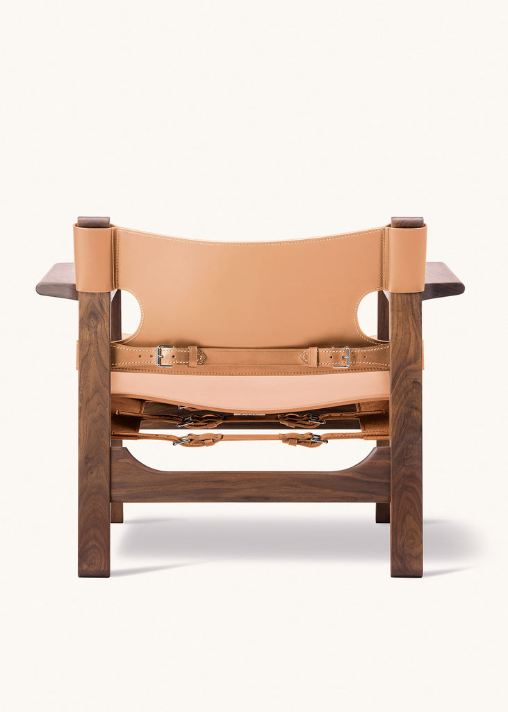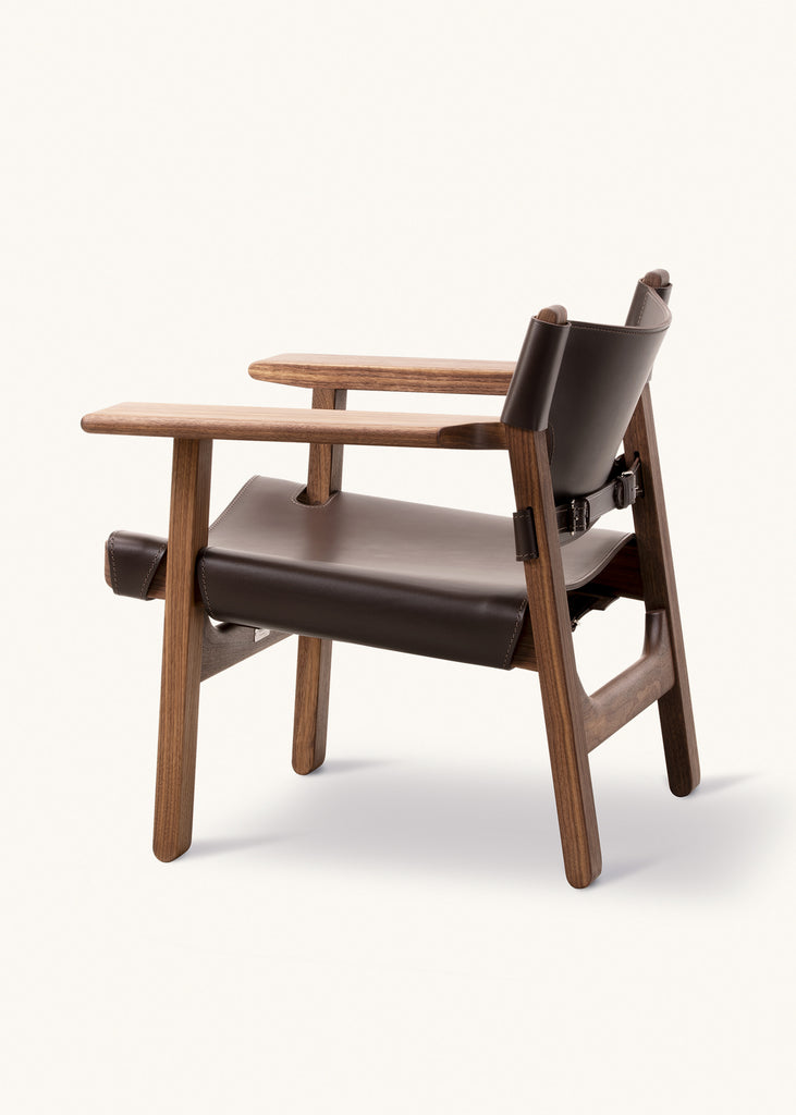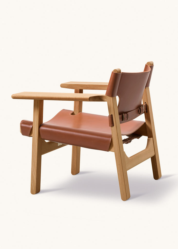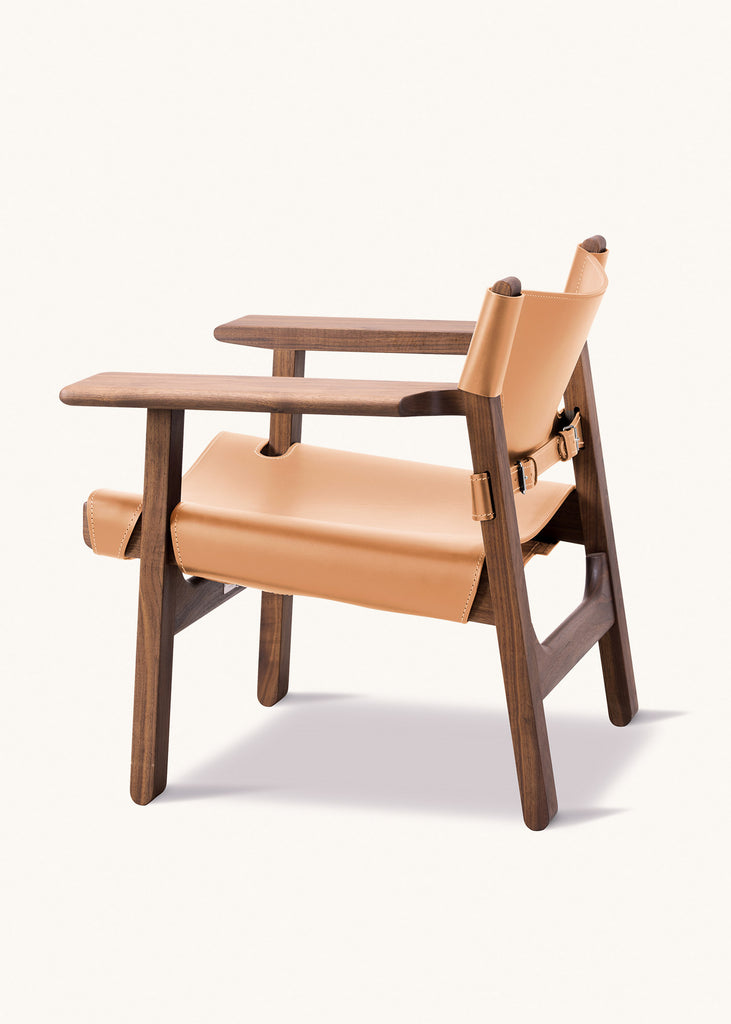 Designed in Denmark by Børge Mogensen in 1958, the Spanish Chair draws inspiration from traditional Spanish furniture-making techniques that used sturdy leather as an integral part of construction. This Spanish approach supported Mogensen's belief that good furniture should be enjoyed now and for generations to come. Available in solid oak or walnut, the chair's high-quality saddle leather develops a patina over time and the adjustable straps can be tightened as the leather naturally expands.