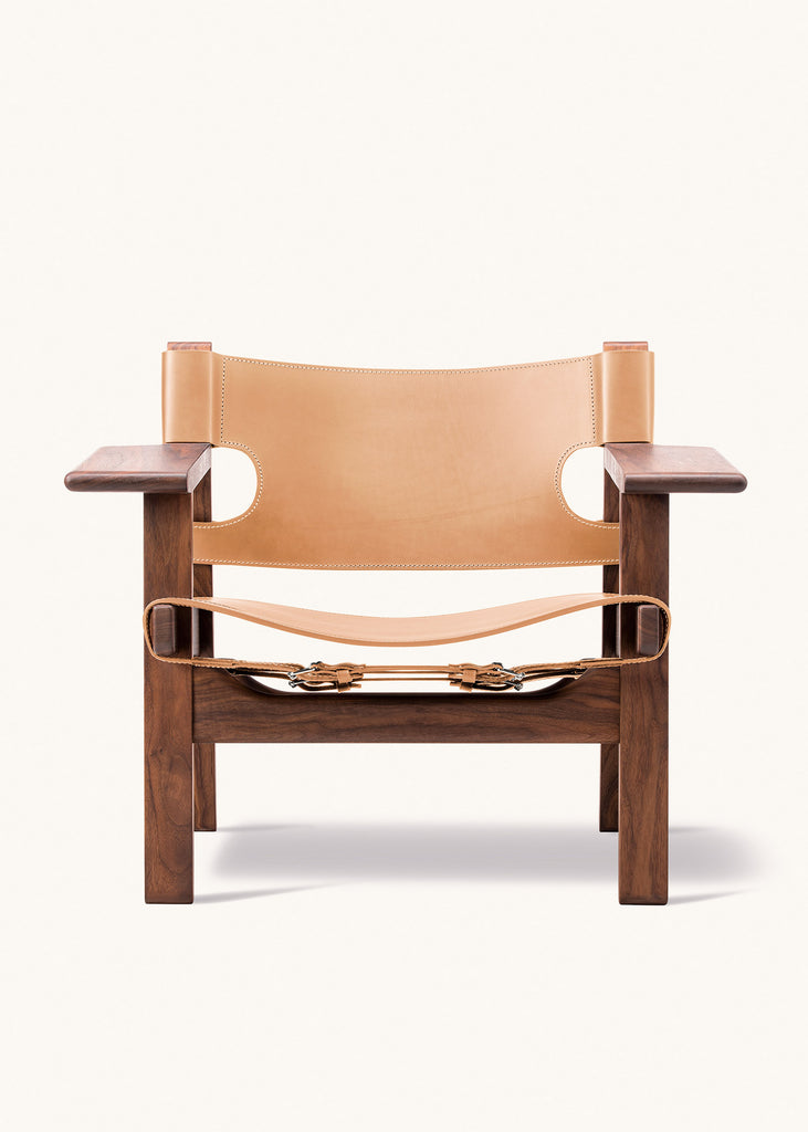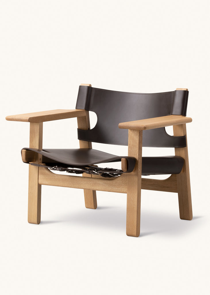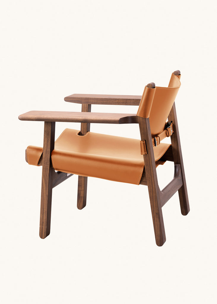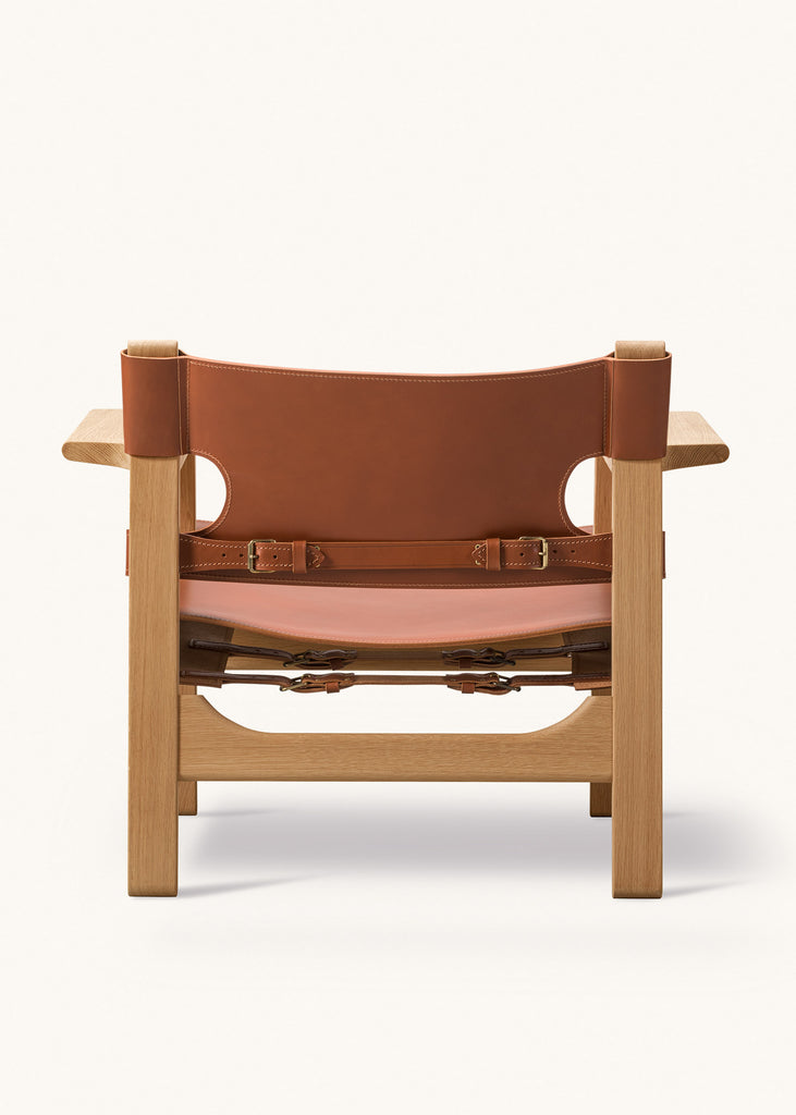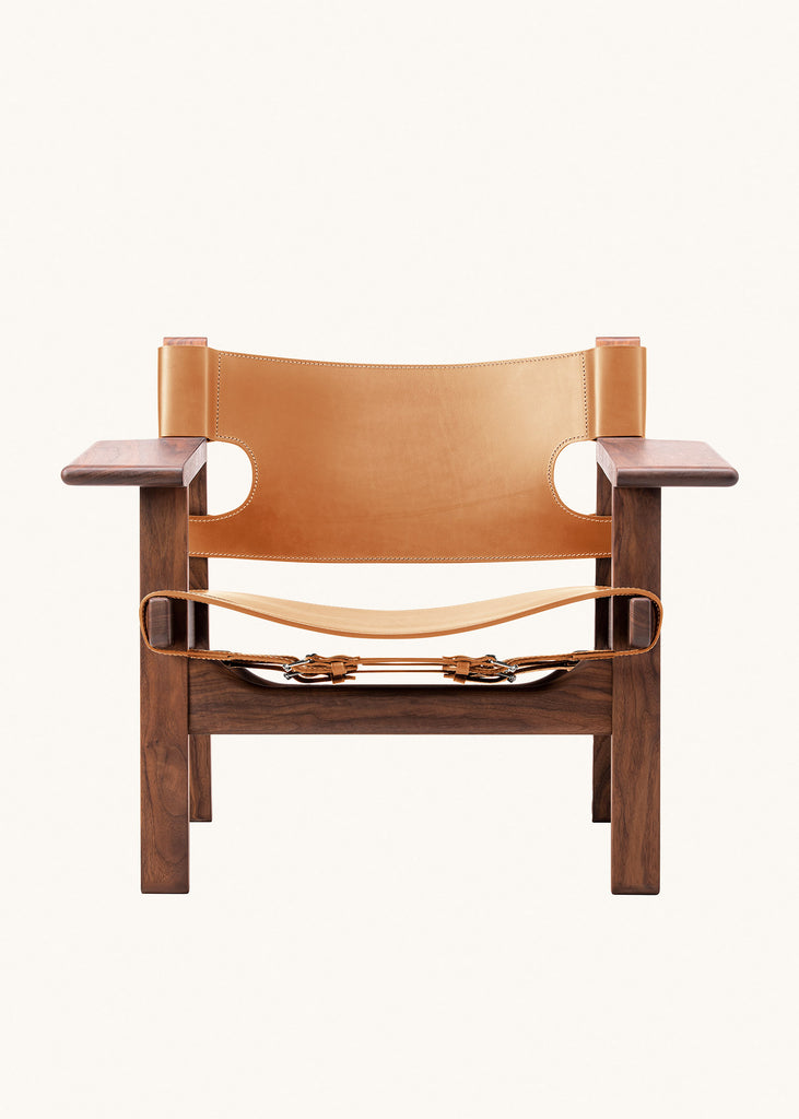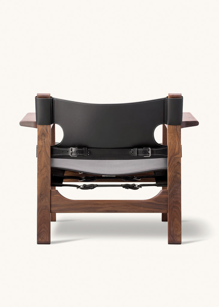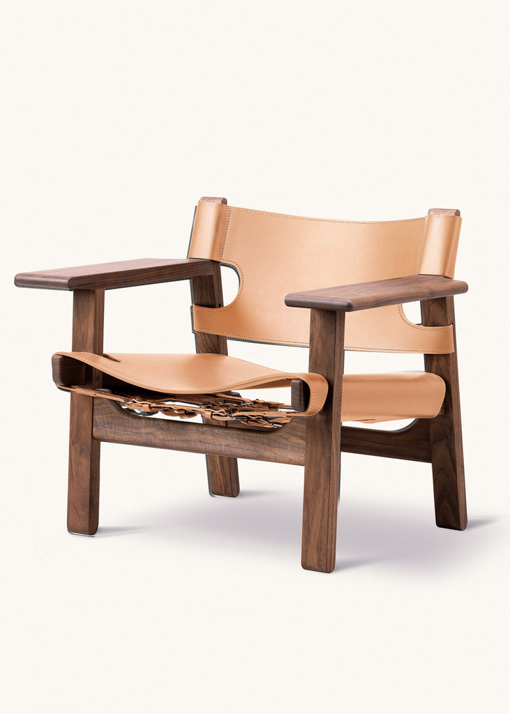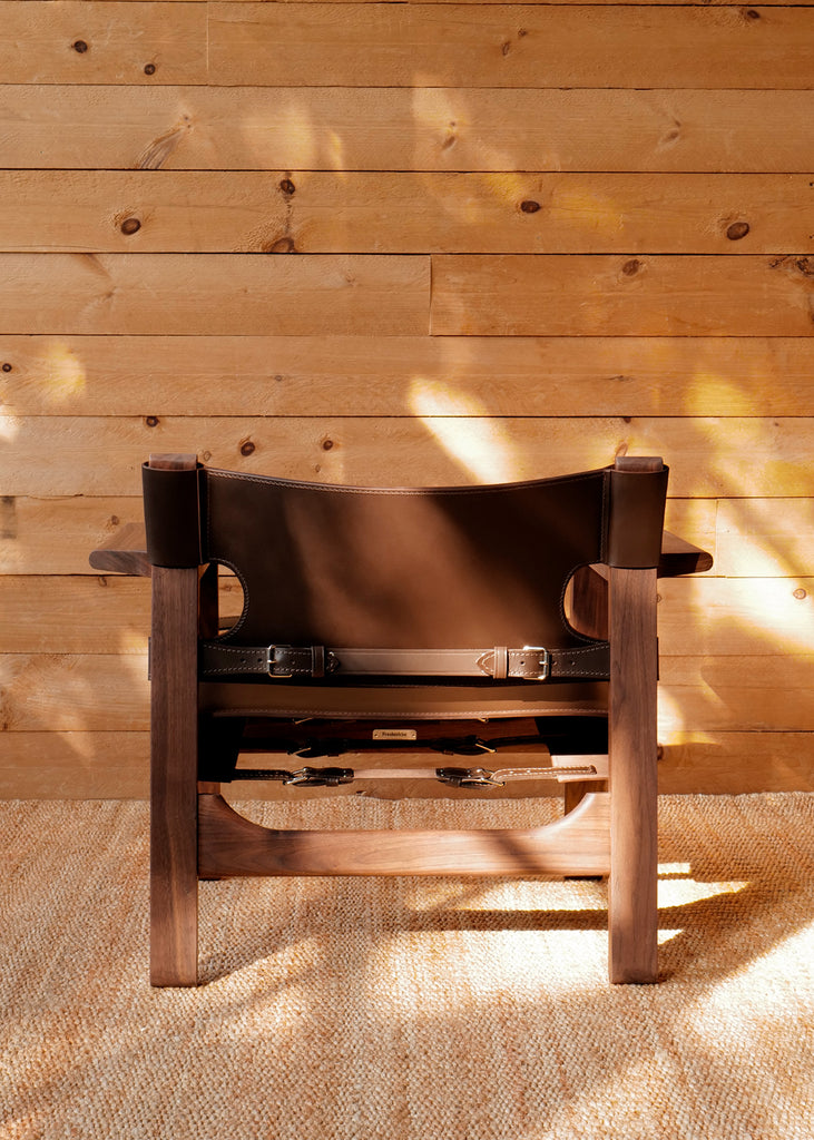 Designed in Denmark by Børge Mogensen in 1958, the Spanish Chair draws inspiration from traditional Spanish furniture-making techniques that used sturdy leather as an integral part of construction. This Spanish approach supported Mogensen's belief that good furniture should be enjoyed now and for generations to come. Available in solid oak or walnut, the chair's high-quality saddle leather develops a patina over time and the adjustable straps can be tightened as the leather naturally expands.