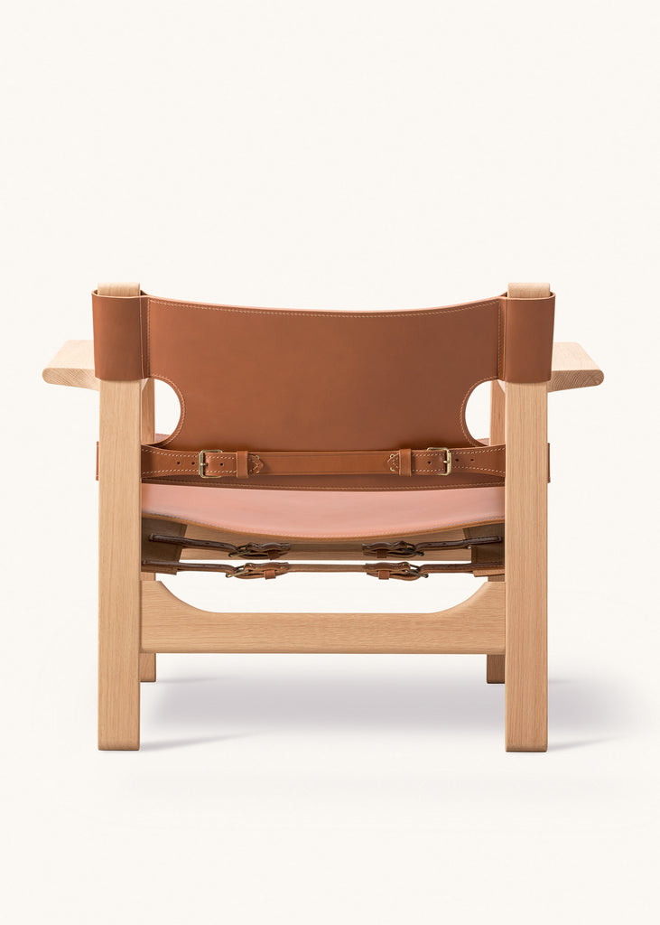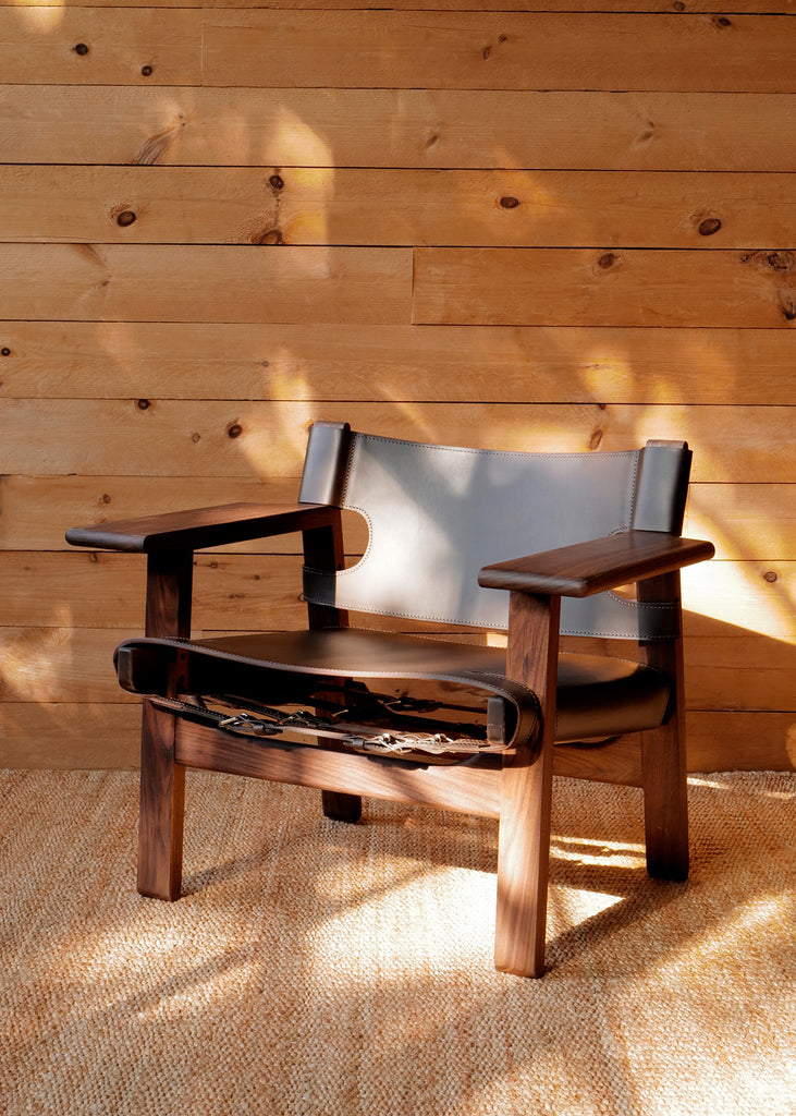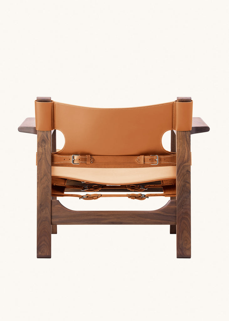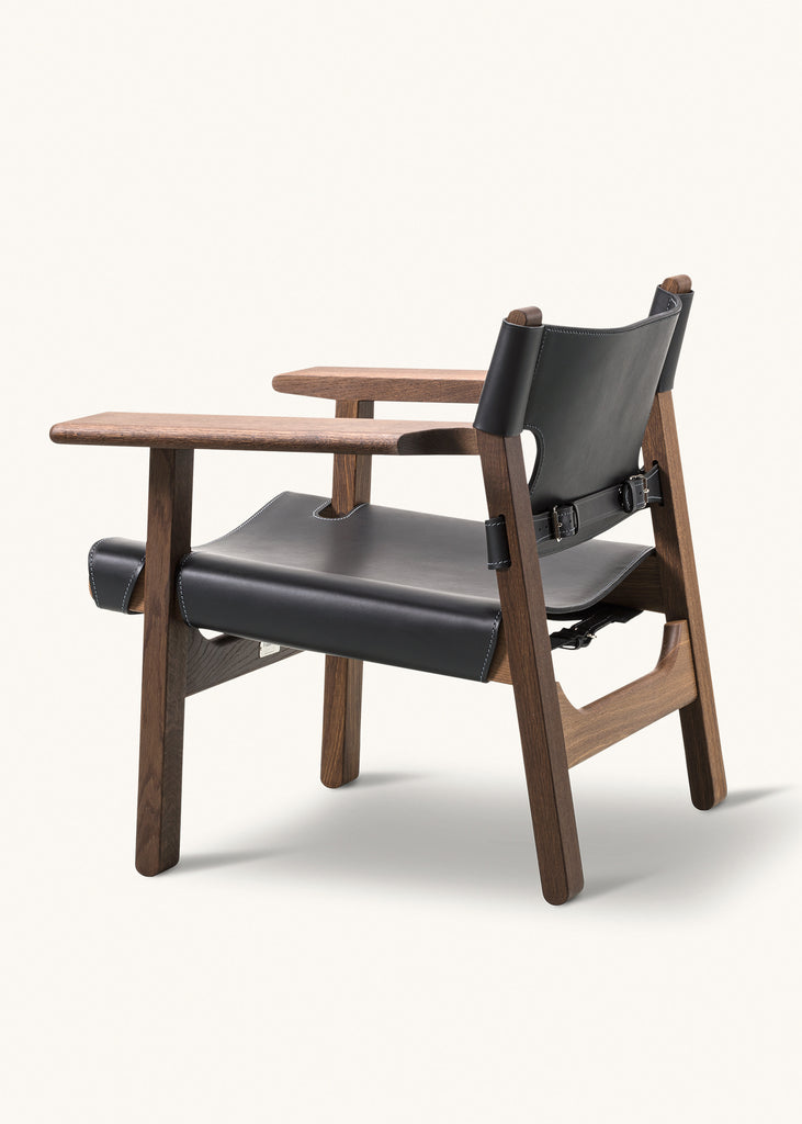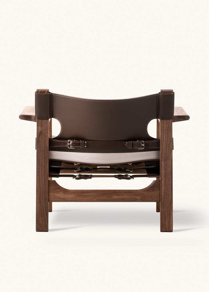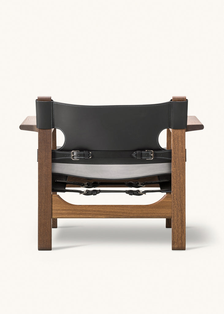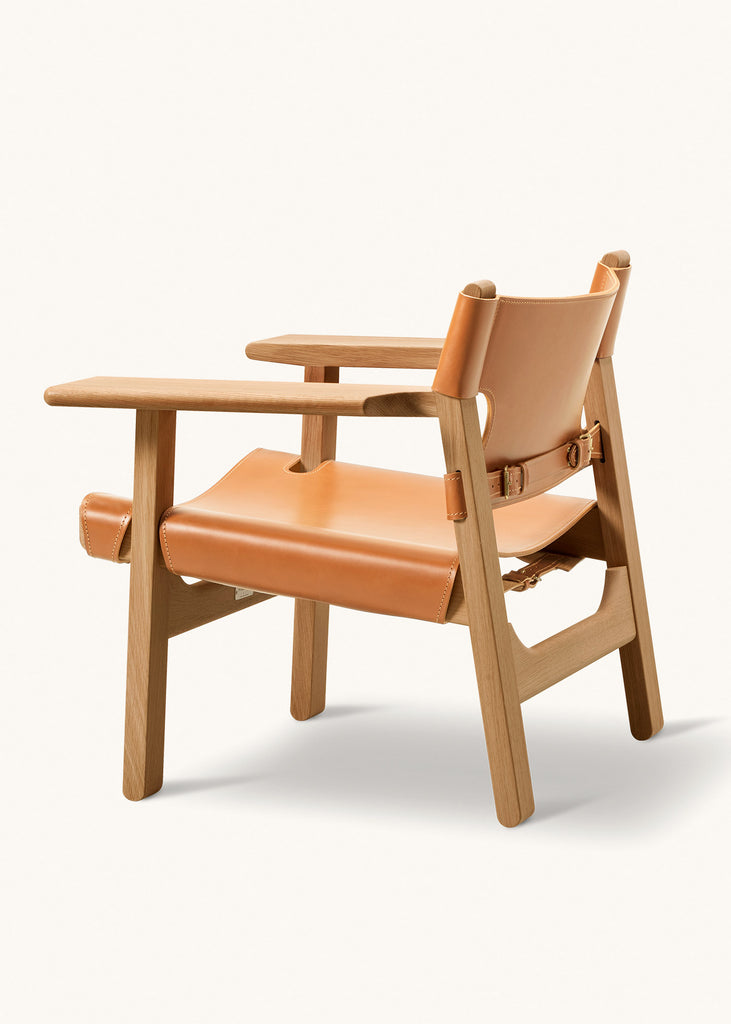 Designed in Denmark by Børge Mogensen in 1958, the Spanish Chair draws inspiration from traditional Spanish furniture-making techniques that used sturdy leather as an integral part of construction. This Spanish approach supported Mogensen's belief that good furniture should be enjoyed now and for generations to come. Available in solid oak or walnut, the chair's high-quality saddle leather develops a patina over time and the adjustable straps can be tightened as the leather naturally expands.