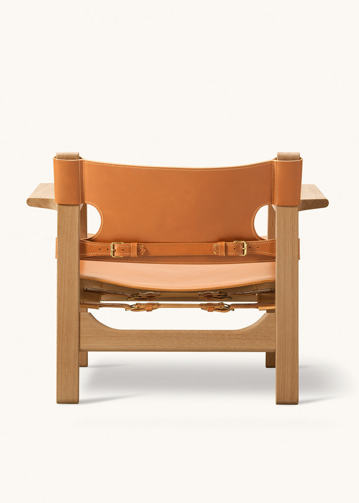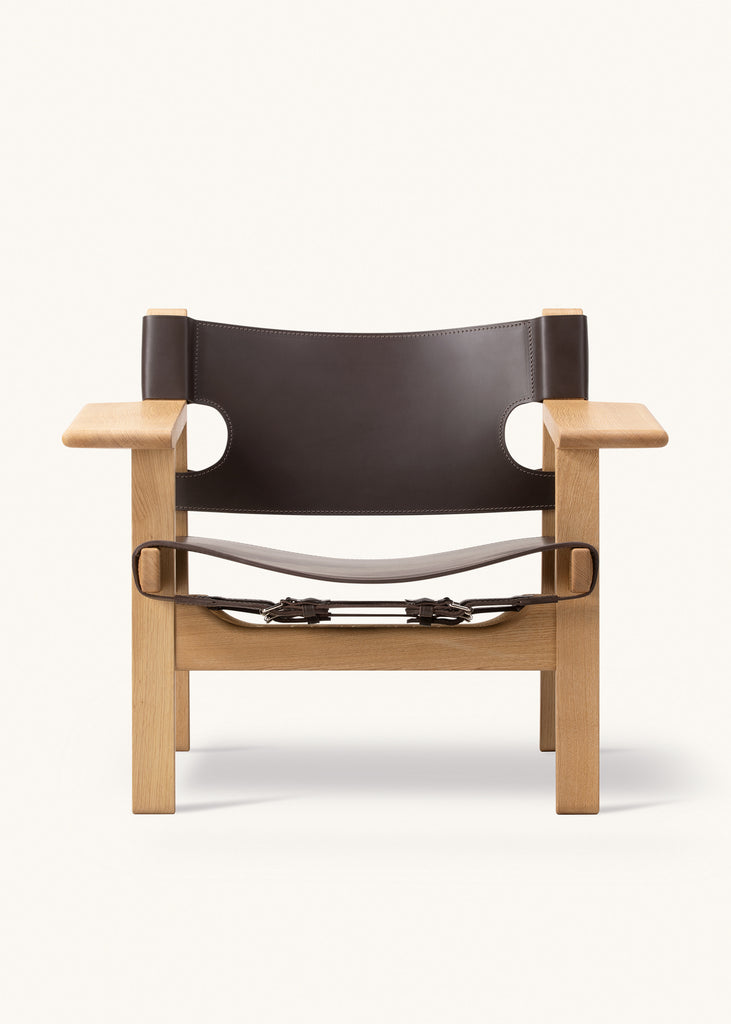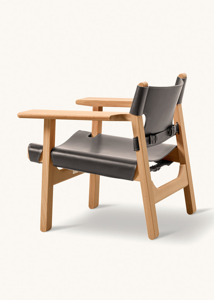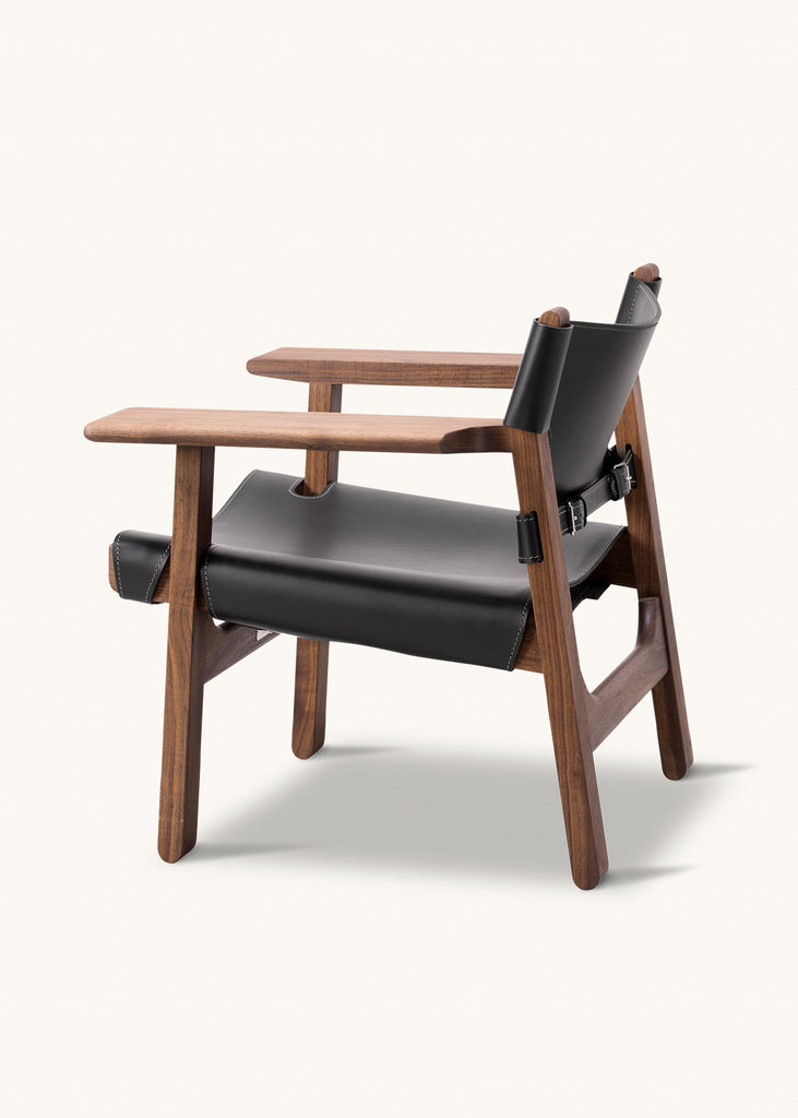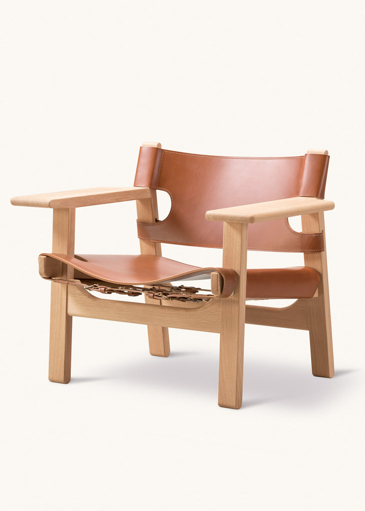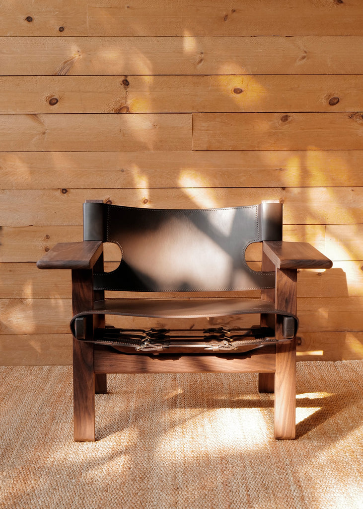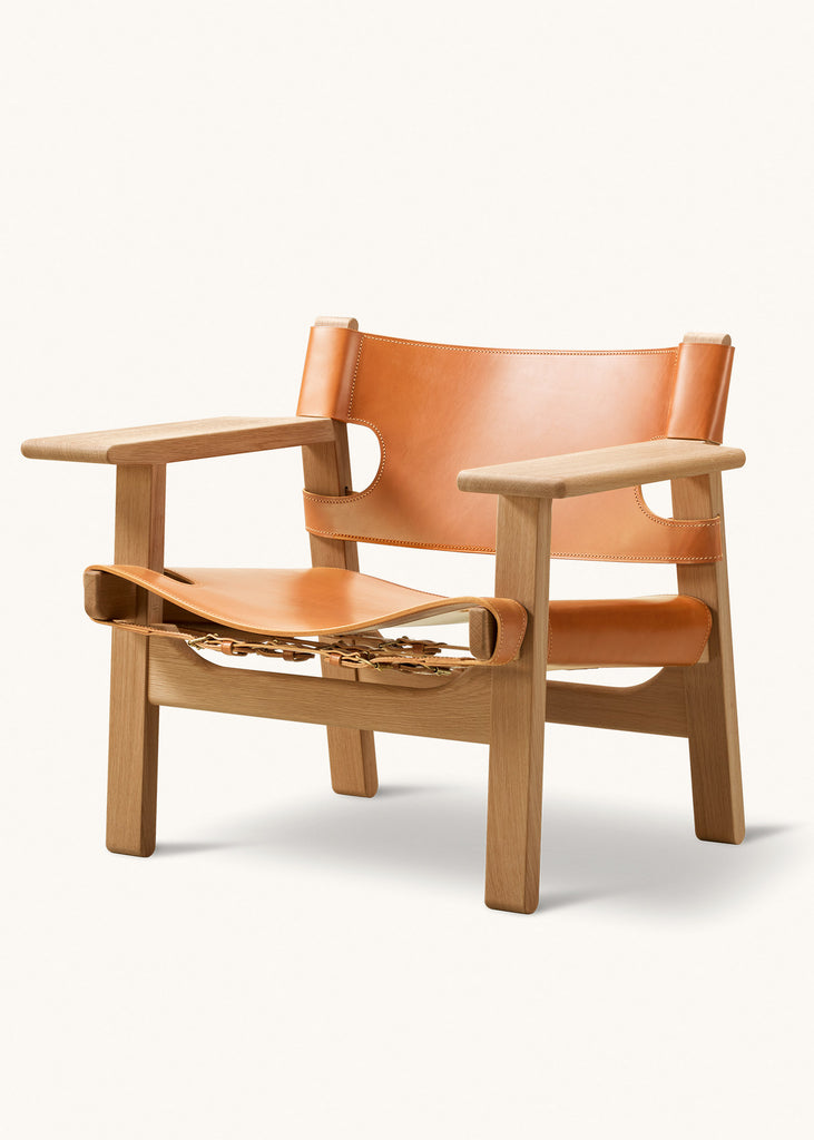Designed in Denmark by Børge Mogensen in 1958, the Spanish Chair draws inspiration from traditional Spanish furniture-making techniques that used sturdy leather as an integral part of construction. This Spanish approach supported Mogensen's belief that good furniture should be enjoyed now and for generations to come. Available in solid oak or walnut, the chair's high-quality saddle leather develops a patina over time and the adjustable straps can be tightened as the leather naturally expands.