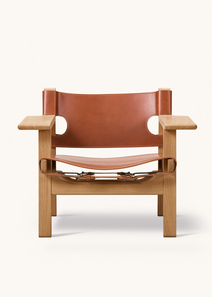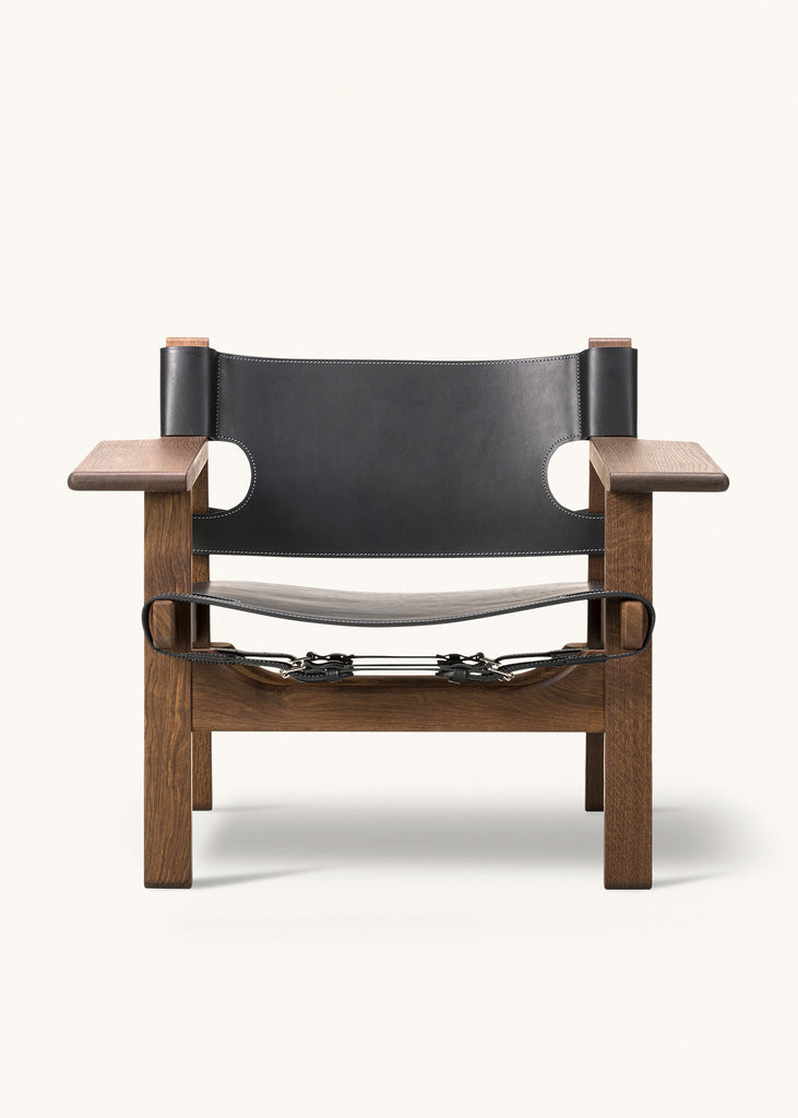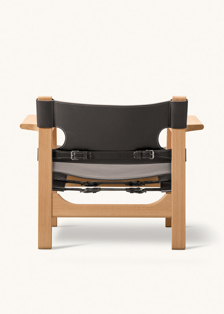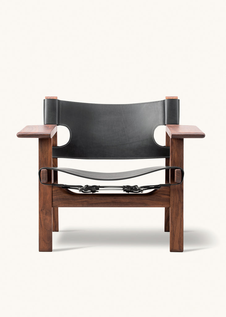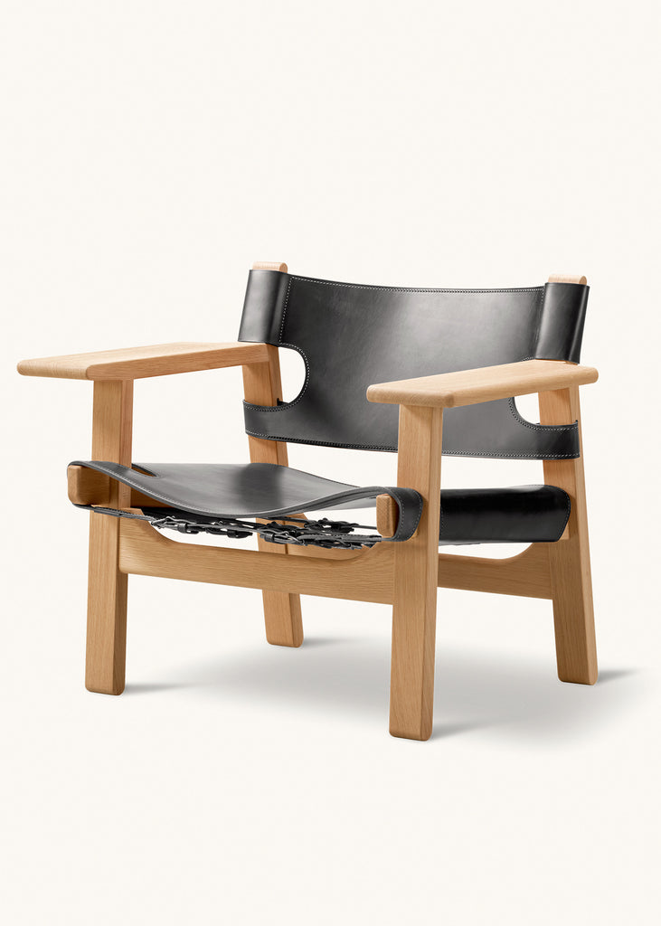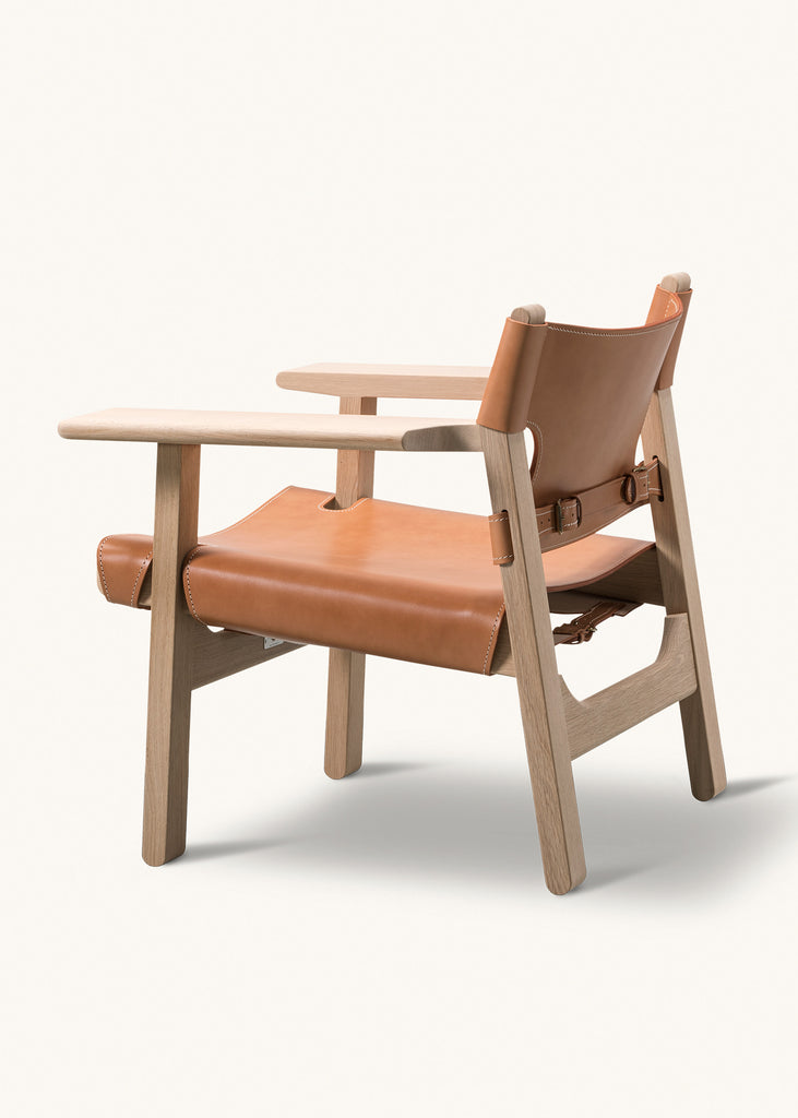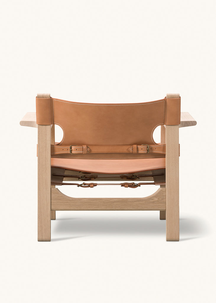 Designed in Denmark by Børge Mogensen in 1958, the Spanish Chair draws inspiration from traditional Spanish furniture-making techniques that used sturdy leather as an integral part of construction. This Spanish approach supported Mogensen's belief that good furniture should be enjoyed now and for generations to come. Available in solid oak or walnut, the chair's high-quality saddle leather develops a patina over time and the adjustable straps can be tightened as the leather naturally expands.