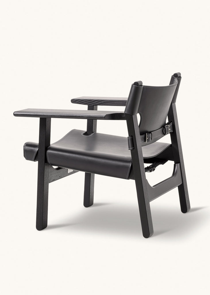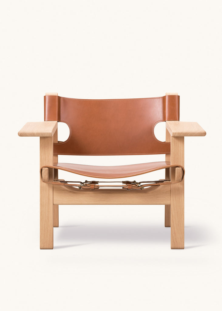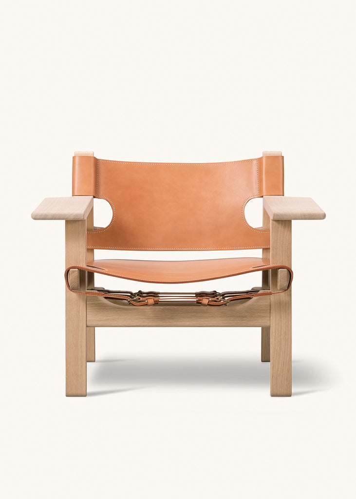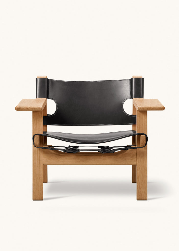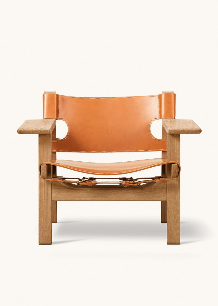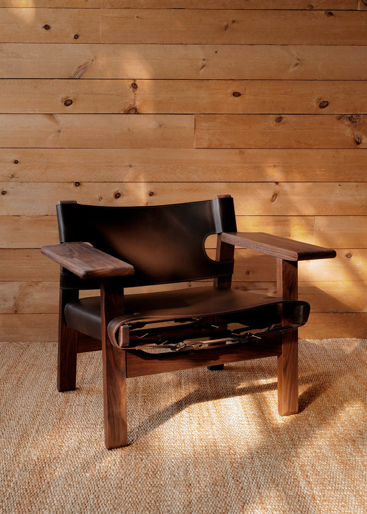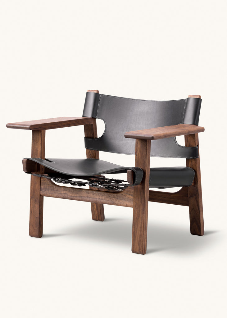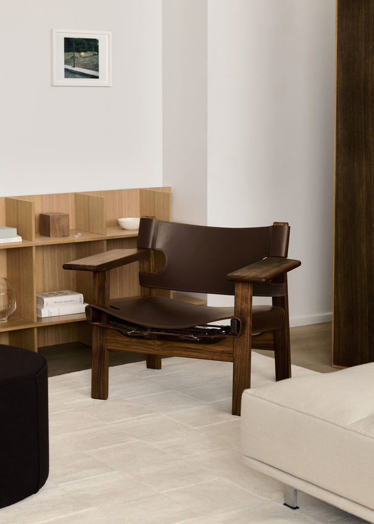Designed in Denmark by Børge Mogensen in 1958, the Spanish Chair draws inspiration from traditional Spanish furniture-making techniques that used sturdy leather as an integral part of construction. This Spanish approach supported Mogensen's belief that good furniture should be enjoyed now and for generations to come. Available in solid oak or walnut, the chair's high-quality saddle leather develops a patina over time and the adjustable straps can be tightened as the leather naturally expands.