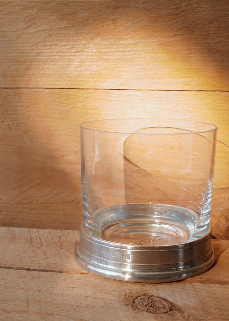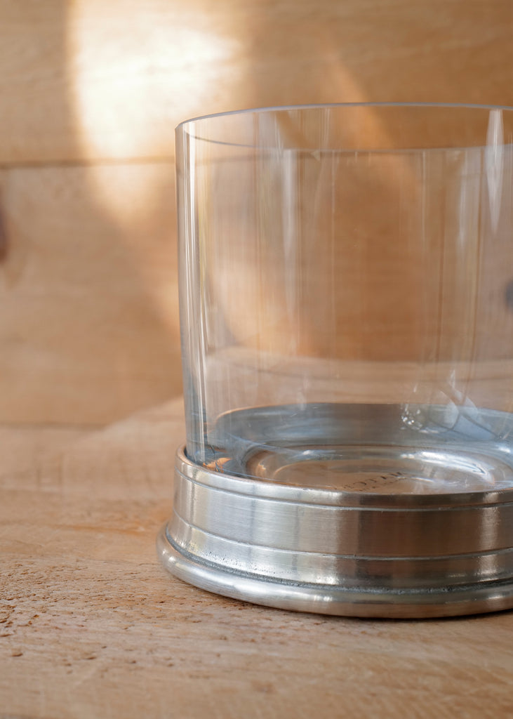 Crafted from lead-free European crystal and hand-finished Italian pewter, this glass is designed with balanced proportions and subtle weight. Suitable for beverages or small arrangements, it embodies functional design rooted in centuries of pewter craftsmanship. Set of two.