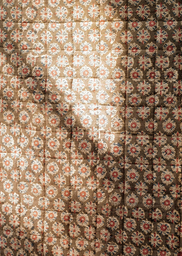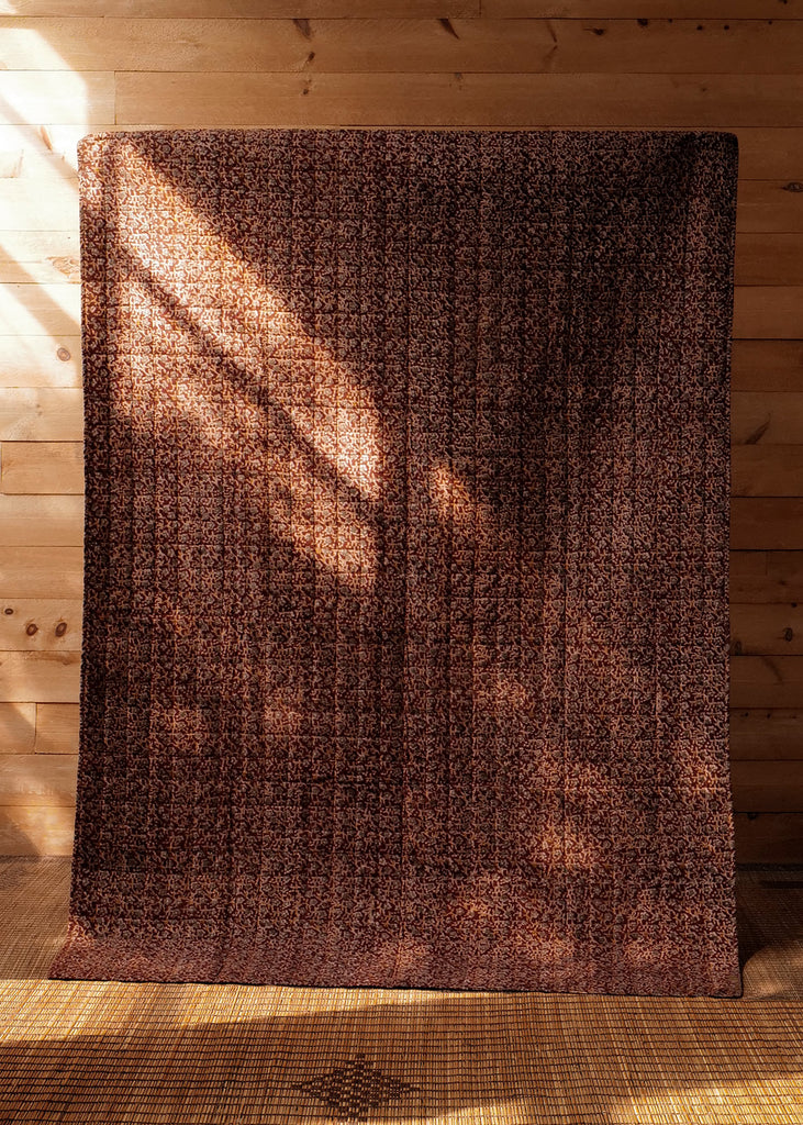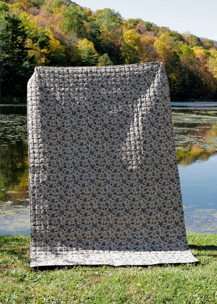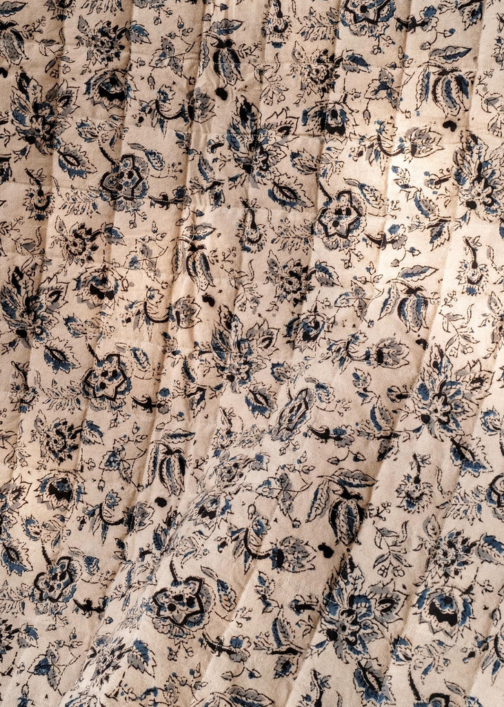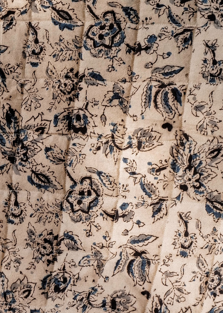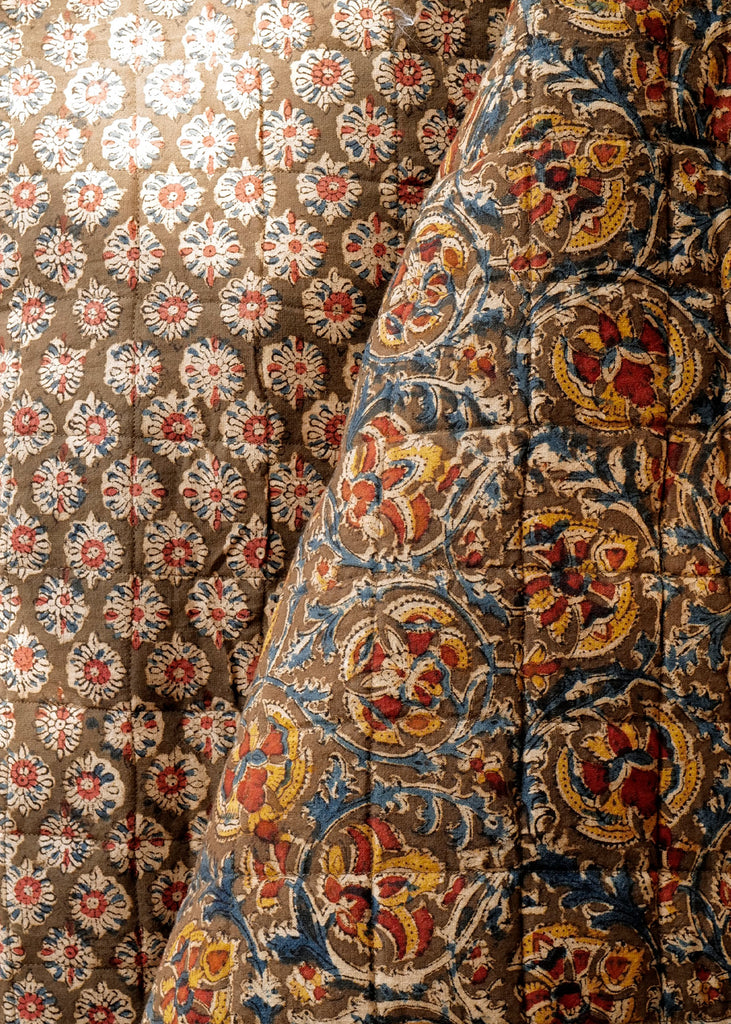 These patterned quilts are made from natural dyes on 100% hand-loomed cotton giving them an earthy, natural look. Each quilt features a repeated floral or whimsical motif on the front and back, created using traditional Indian wood-block printing techniques.