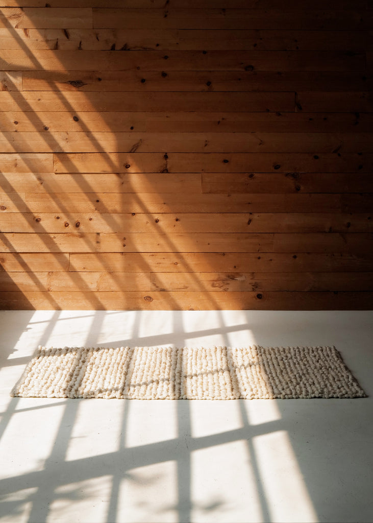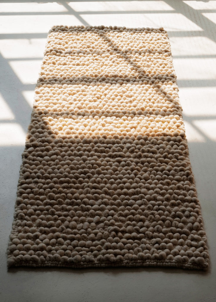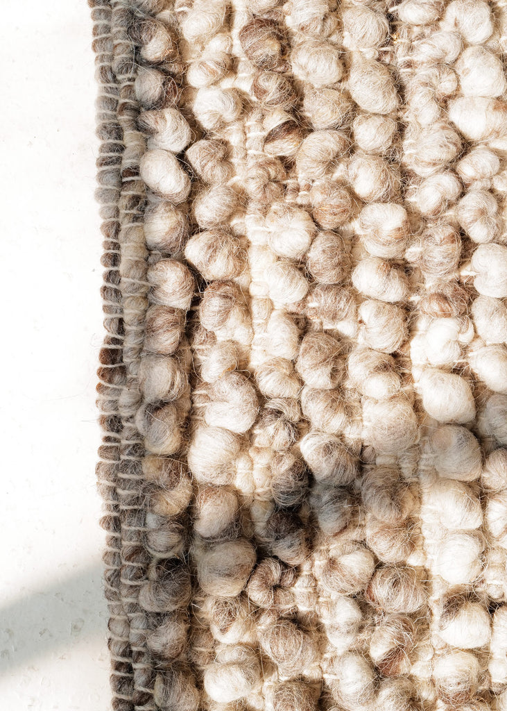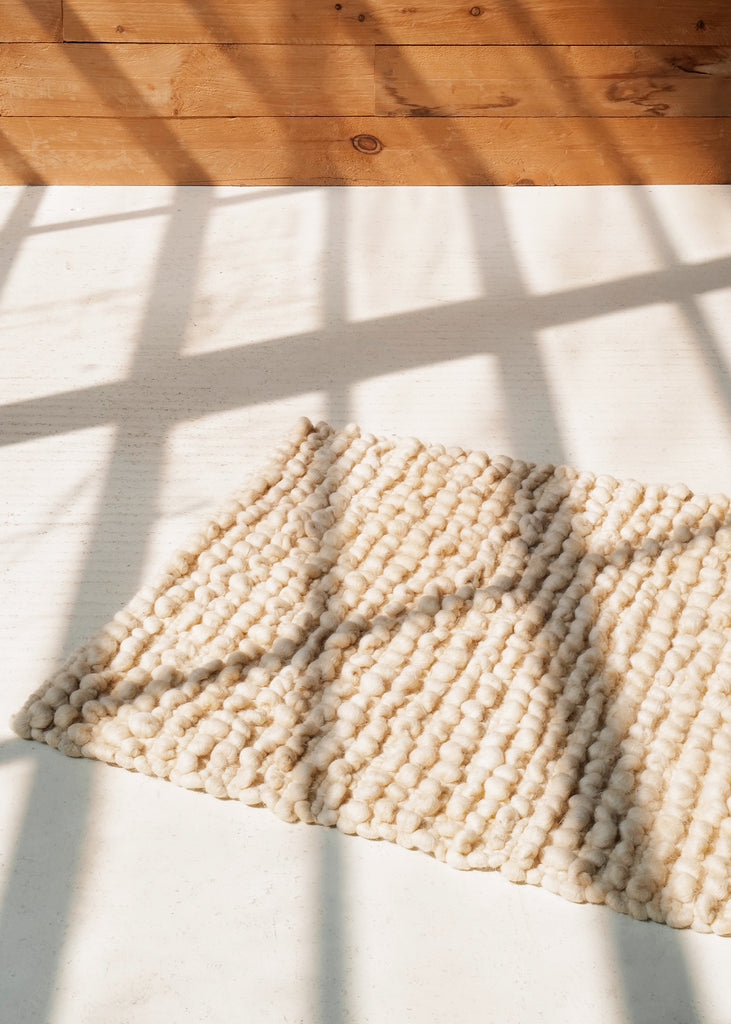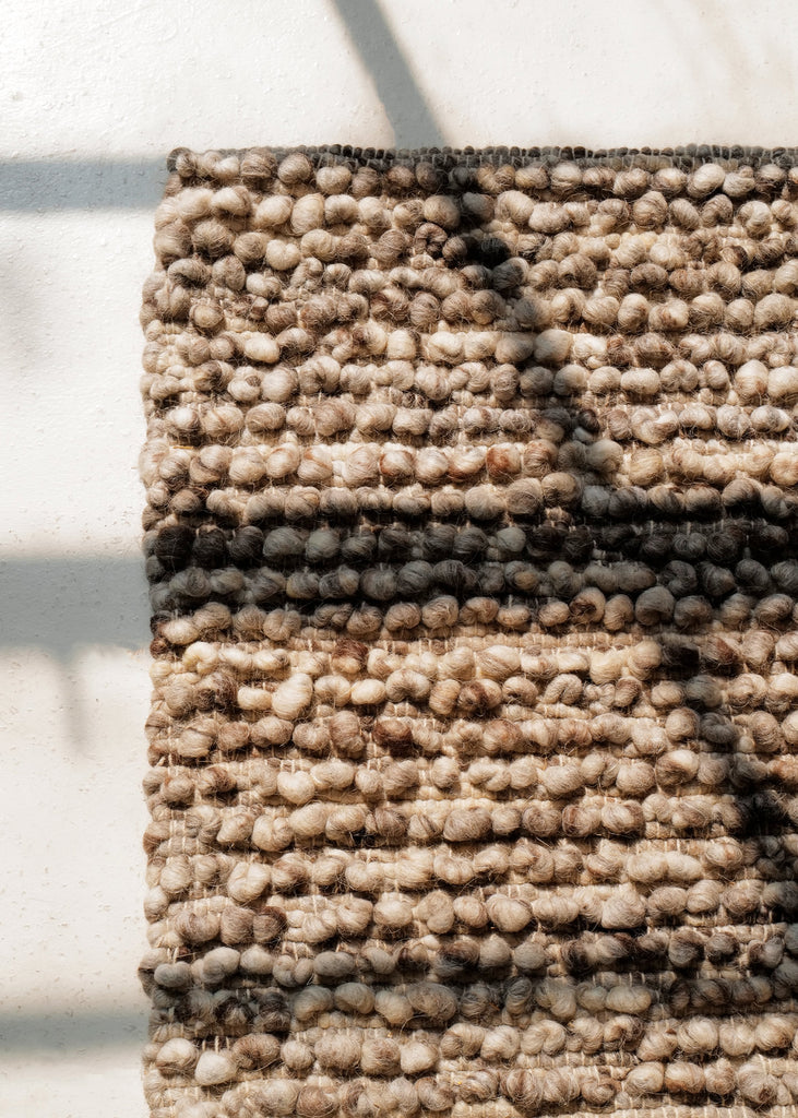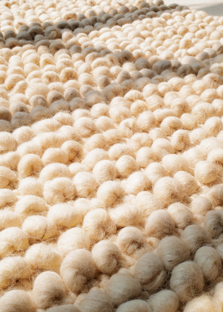 The Ovelha Bobble Wool Pillow is handcrafted in Portugal by expert weavers using 100% natural, undyed wool. Sourced from local farms and hand-sorted by color, the wool is spun into thick cords and woven on a traditional loom. Each pillow features a timeless knife-edge design, an invisible YKK zipper, and a double-sided construction with looped bobbles on the front and a tight basket weave on the back.