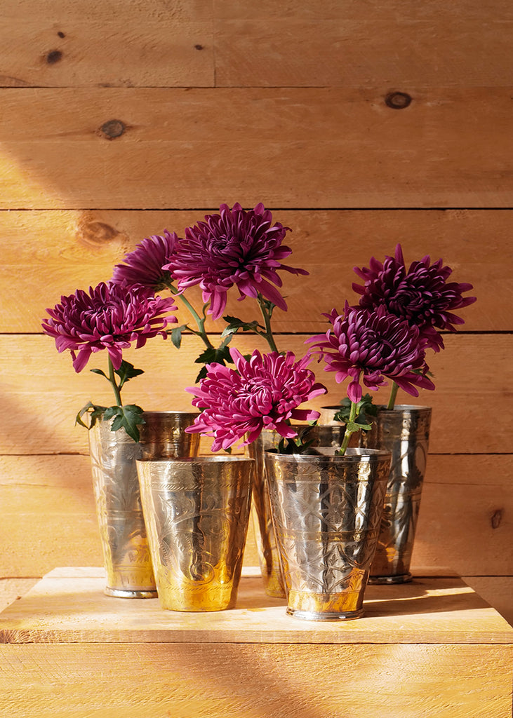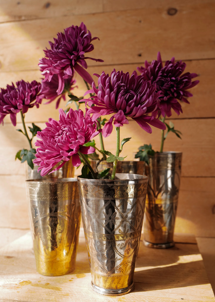 Each of these timeworn Lassi Cups carries a story, gathered from markets across India and shaped by tradition. Created out of brass and adorned with silver, each cup is one-of-a-kind and showcases intricate decorative etchings. Originally used for serving spiced yogurt drinks, these vessels now stand as beautiful relics of craftsmanship, ready to be repurposed as a decorative piece on a bookshelf, a holder for brushes or blooms, or simply admired as an artifact of a life well-lived. Sold individually.