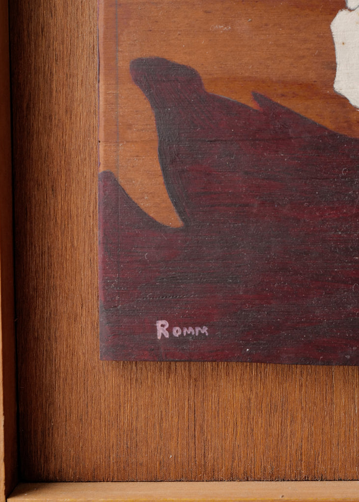 Midcentury vintage painting of a reclined nude. This original work is done on wood, with the richness and of the wood coming through, and some areas left unpainted, leaving the natural wood to fill in its own warm negative space. It is framed in a hand made frame, and signed Romm. One of a kind