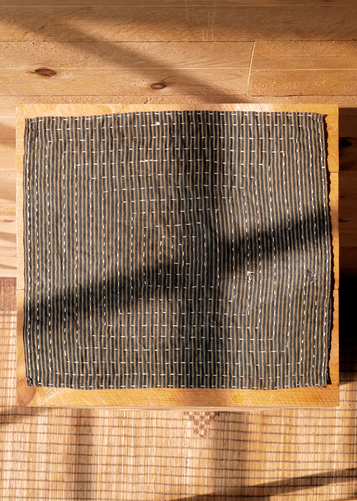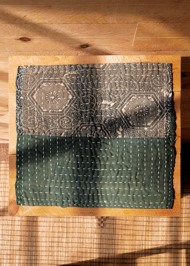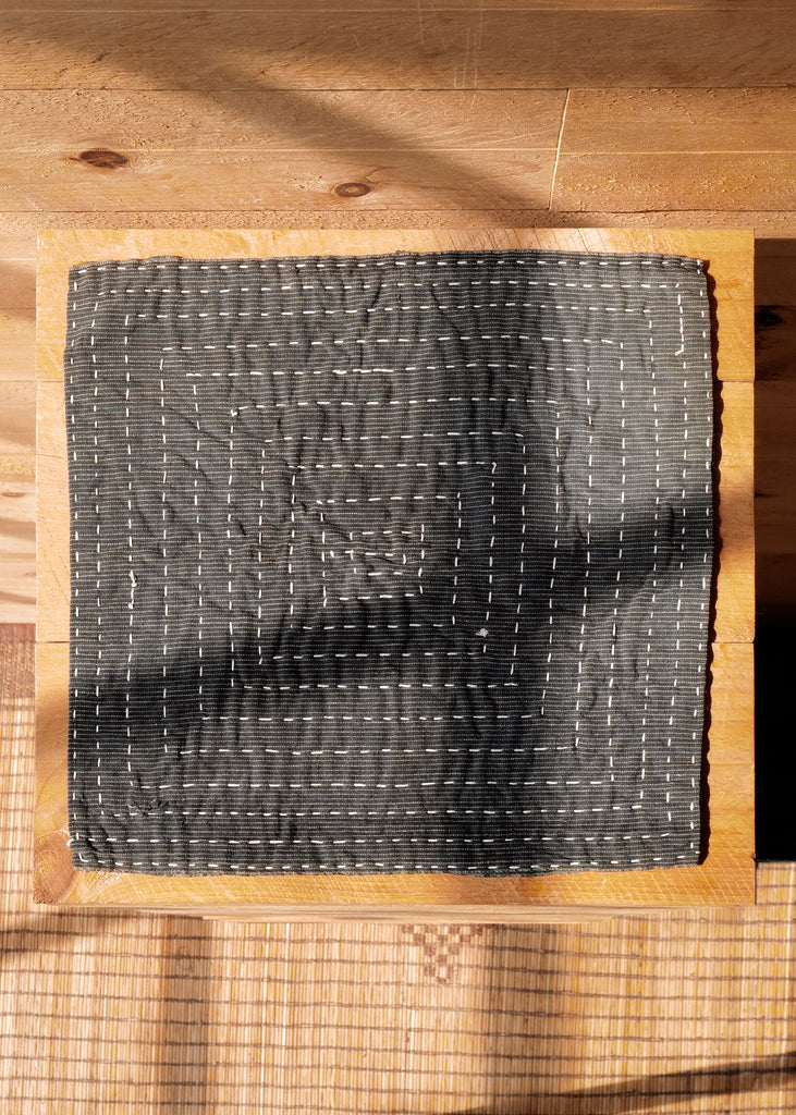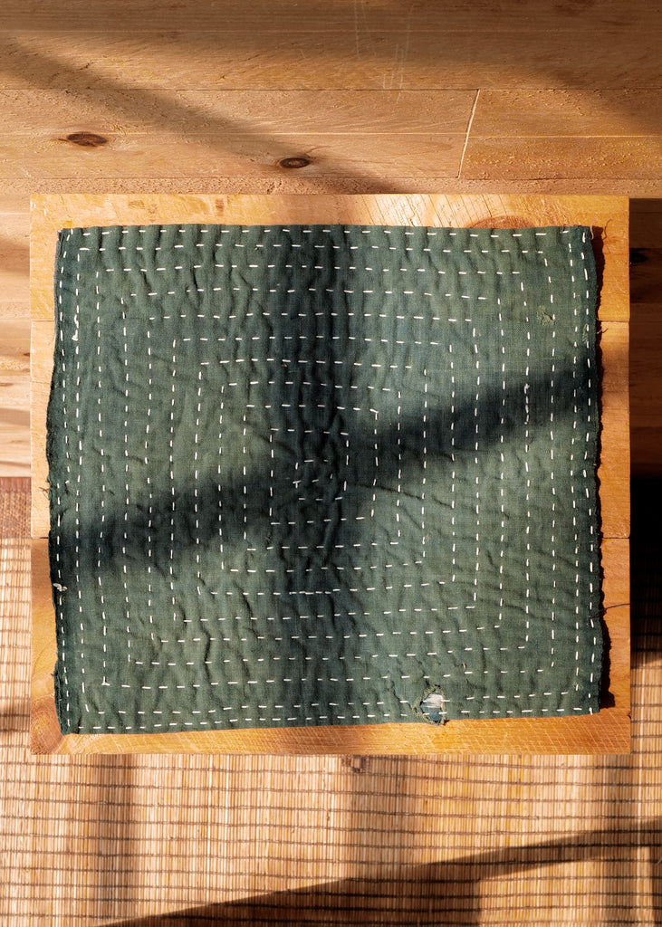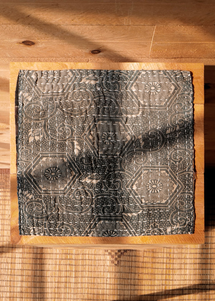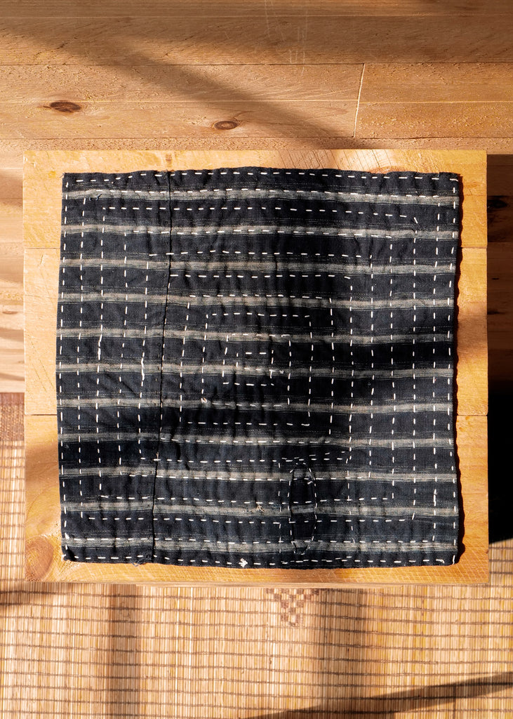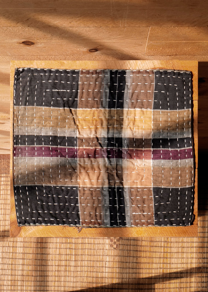 Our Folk Boro Mats provide a handcrafted, delicate touch to any hard surface. Protect your surfaces from scratches with these unique vintage mats. Boro cloth, a traditional Japanese craft passed down through generations, is created by skillfully patching and mending layers of antique and vintage textiles. Each piece of boro cloth is a beautiful conversation and a work of art, crafted over time. Use it as a placemat during dinner, as a protective layer for planters and vases, or as a decorative seat cushion on a bench or chair. Each mat is one of a kind and double sided, featuring a variety of traditional Japanese fabrics like floral, polka dots, and plaids. Sold individually and estimated to be from the 1950s. One of a kind.
