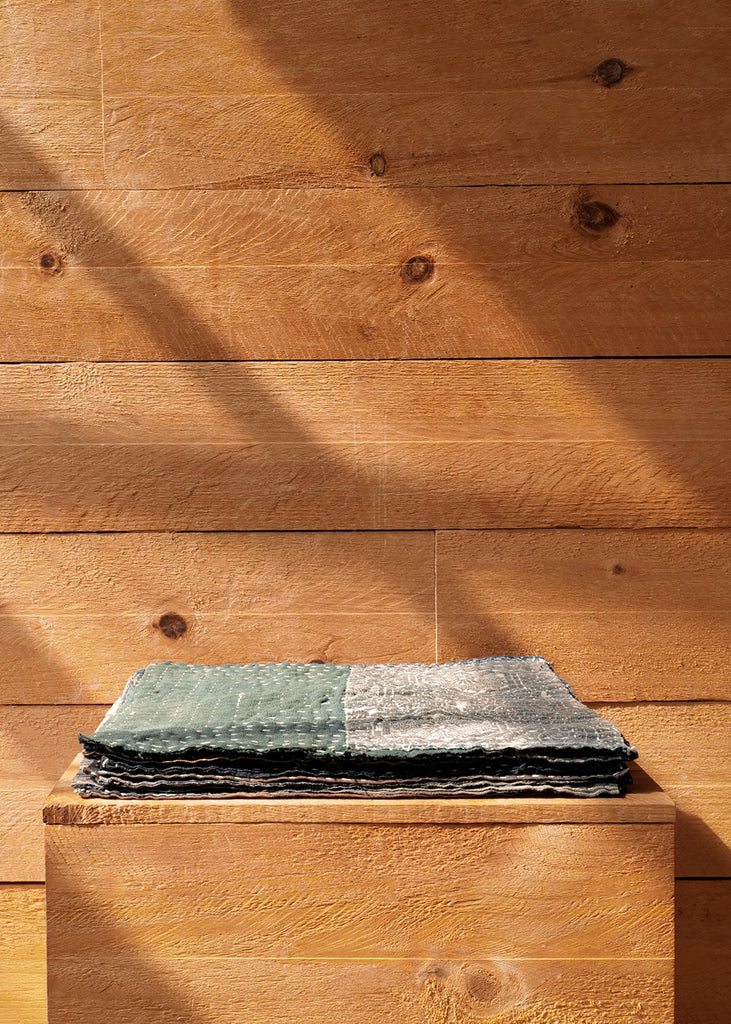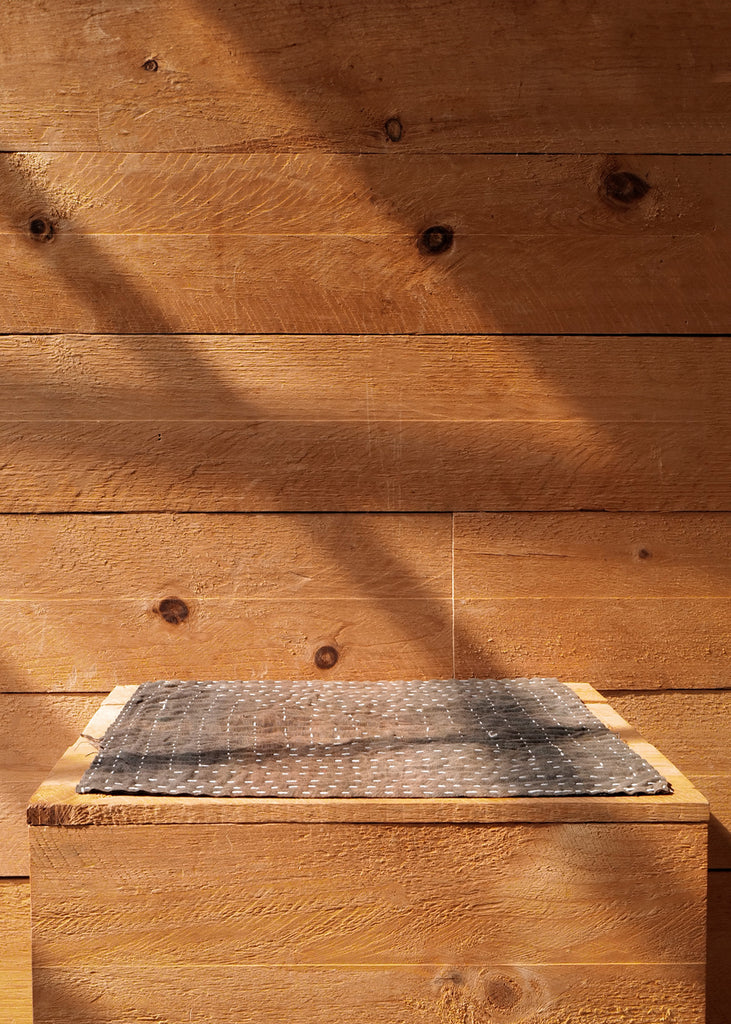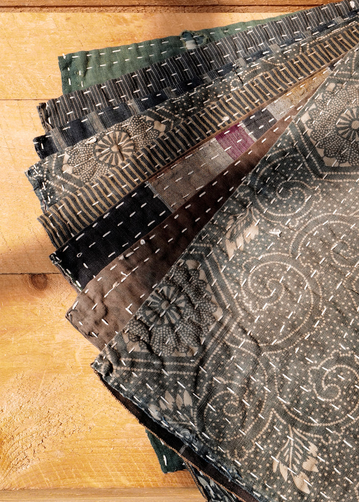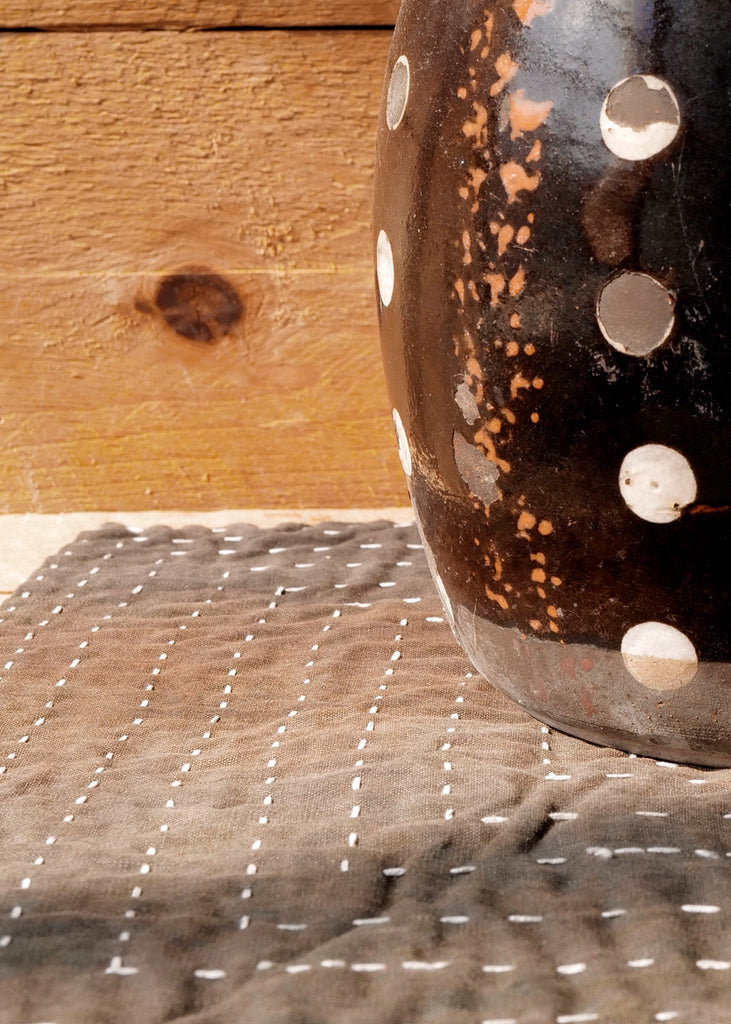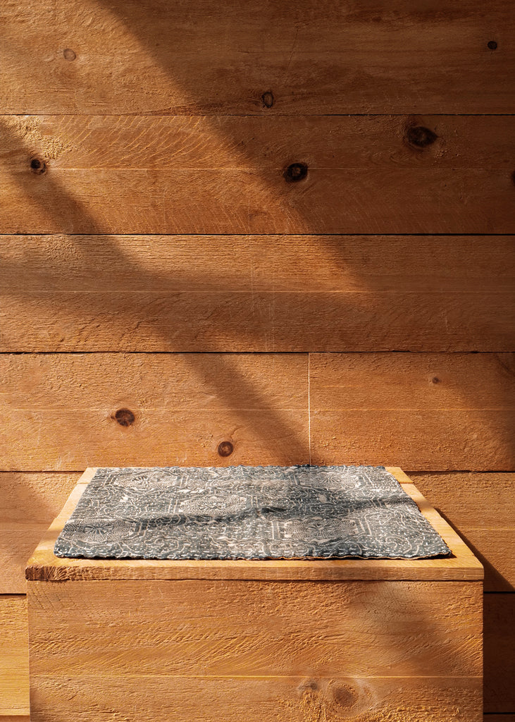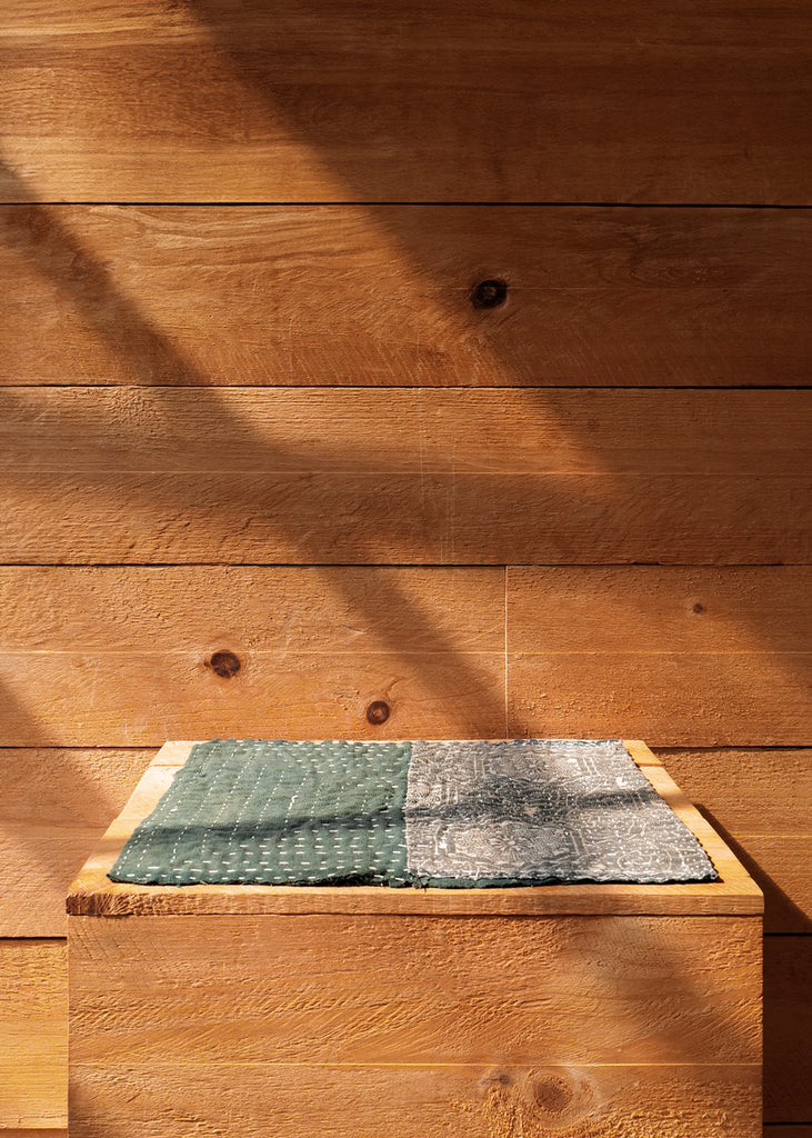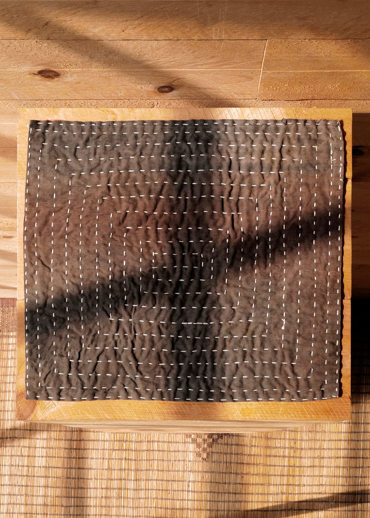 Our Folk Boro Mats provide a handcrafted, delicate touch to any hard surface. Protect your surfaces from scratches with these unique vintage mats. Boro cloth, a traditional Japanese craft passed down through generations, is created by skillfully patching and mending layers of antique and vintage textiles. Each piece of boro cloth is a beautiful conversation and a work of art, crafted over time. Use it as a placemat during dinner, as a protective layer for planters and vases, or as a decorative seat cushion on a bench or chair. Each mat is one of a kind and double sided, featuring a variety of traditional Japanese fabrics like floral, polka dots, and plaids. Sold individually and estimated to be from the 1950s. One of a kind.