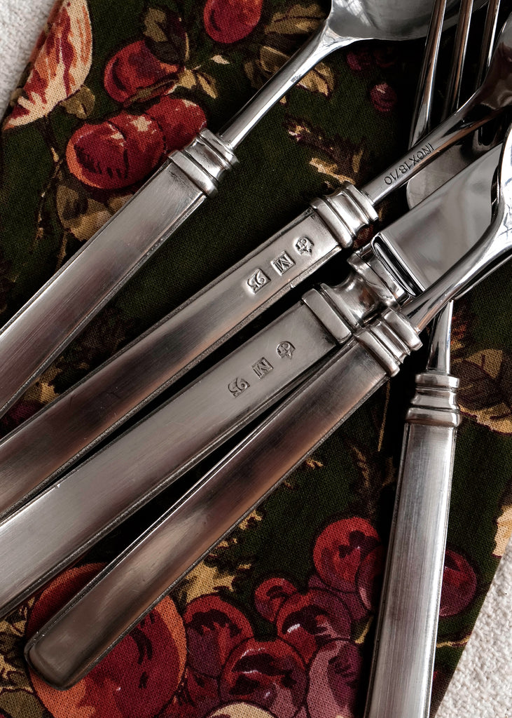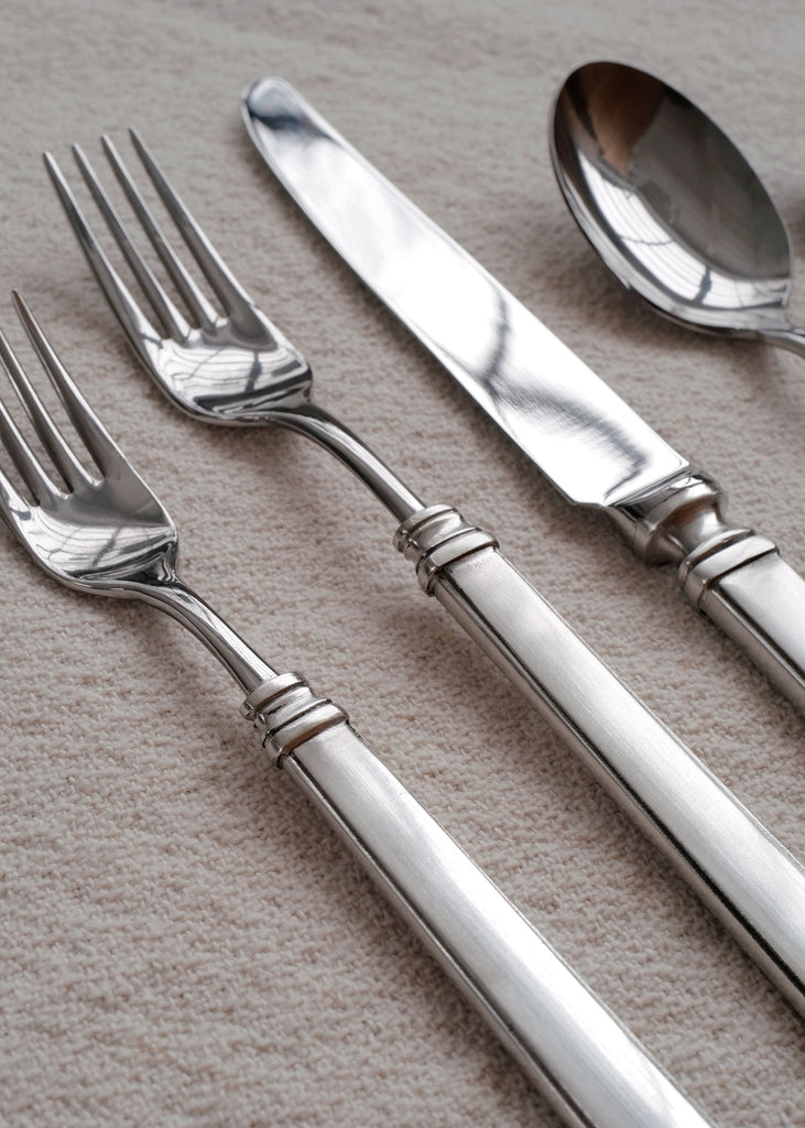 Gabriella flatware features a classic, understated design with subtle architectural details, including a thumbnail edge and banded collar. The working ends (or parts that touch food) are high-quality 18/10 stainless steel, and the handles are cast pewter molded directly around them - no adhesives, just metal fused to metal. Knives include forged stainless steel blades, and all items are stamped with the signature hallmarks of the brand. Available as a 5-piece set (Salad Fork, Dinner Fork, Dinner Knife, Soup Spoon, Teaspoon).