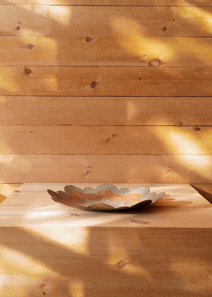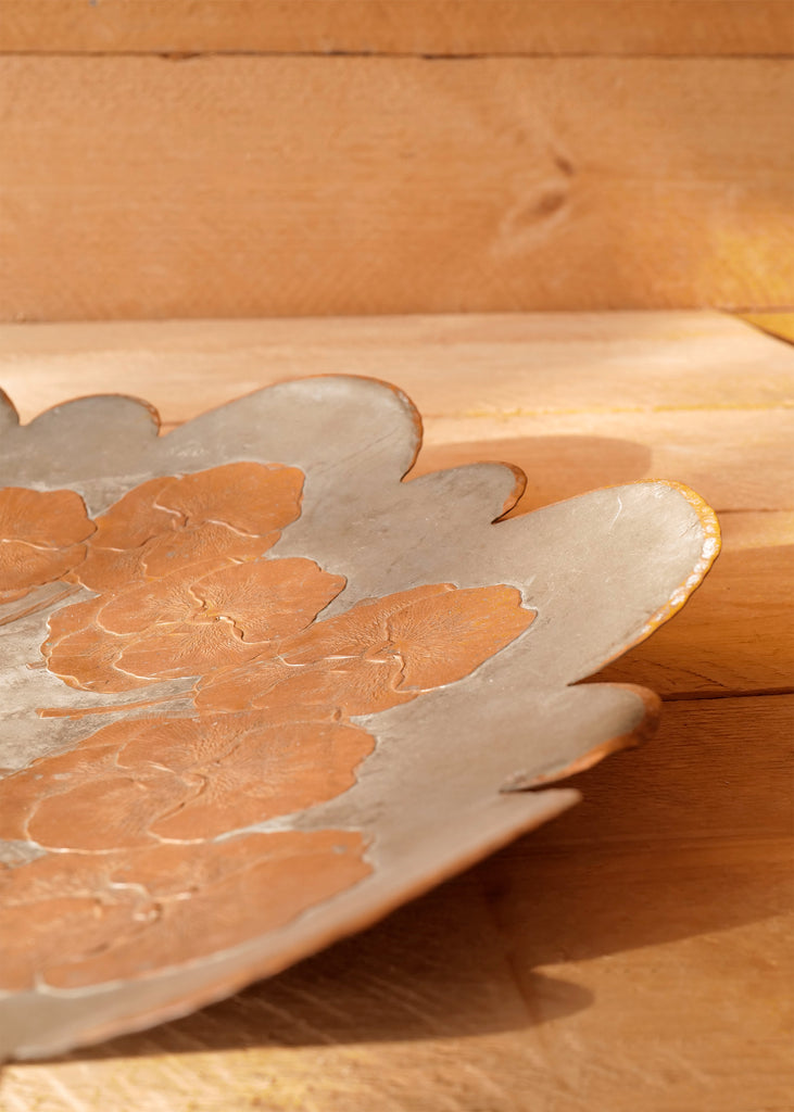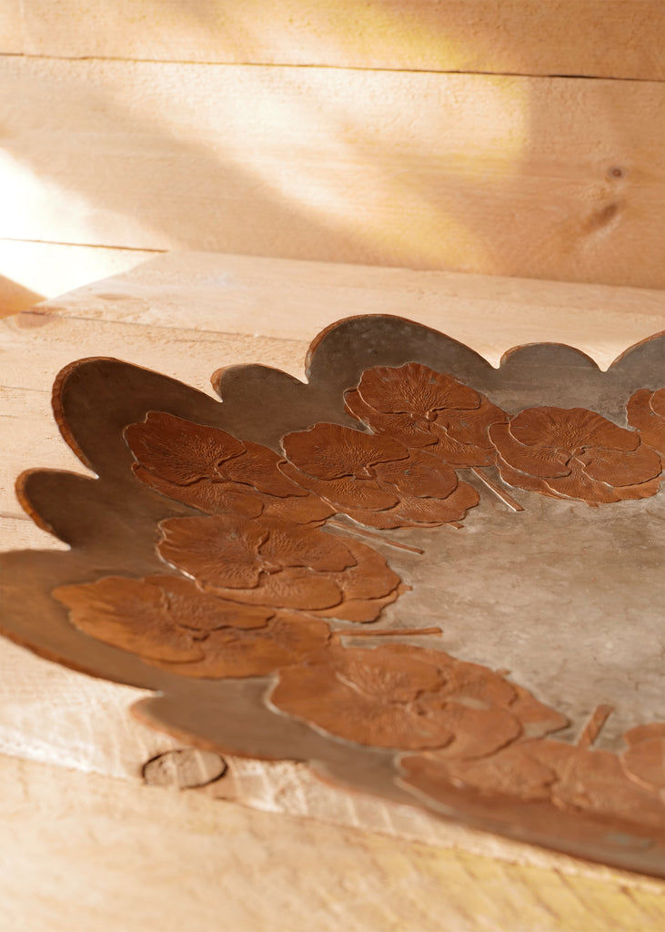 This vintage beaten copper tray features a hand-hammered botanical motif layered and hammered to form a flattened circular bouquet or wreath. Made of solid copper with silver plating, the platter shows natural patina and aging. A hook on the back allows it to hang. Suitable as a catchall or display. One of a kind.