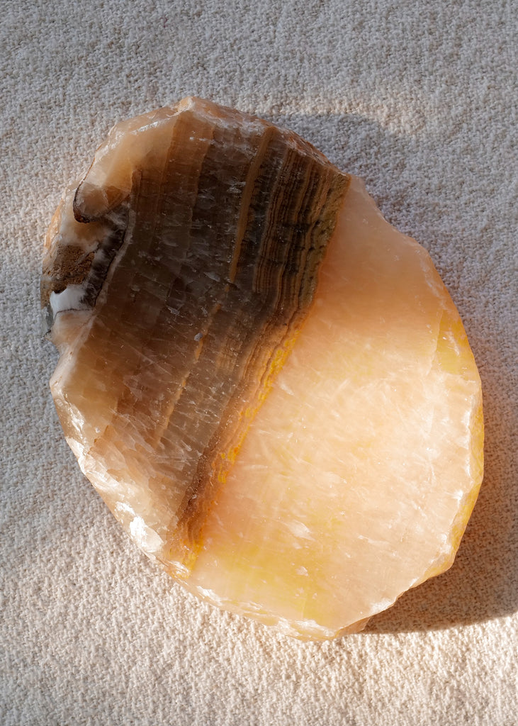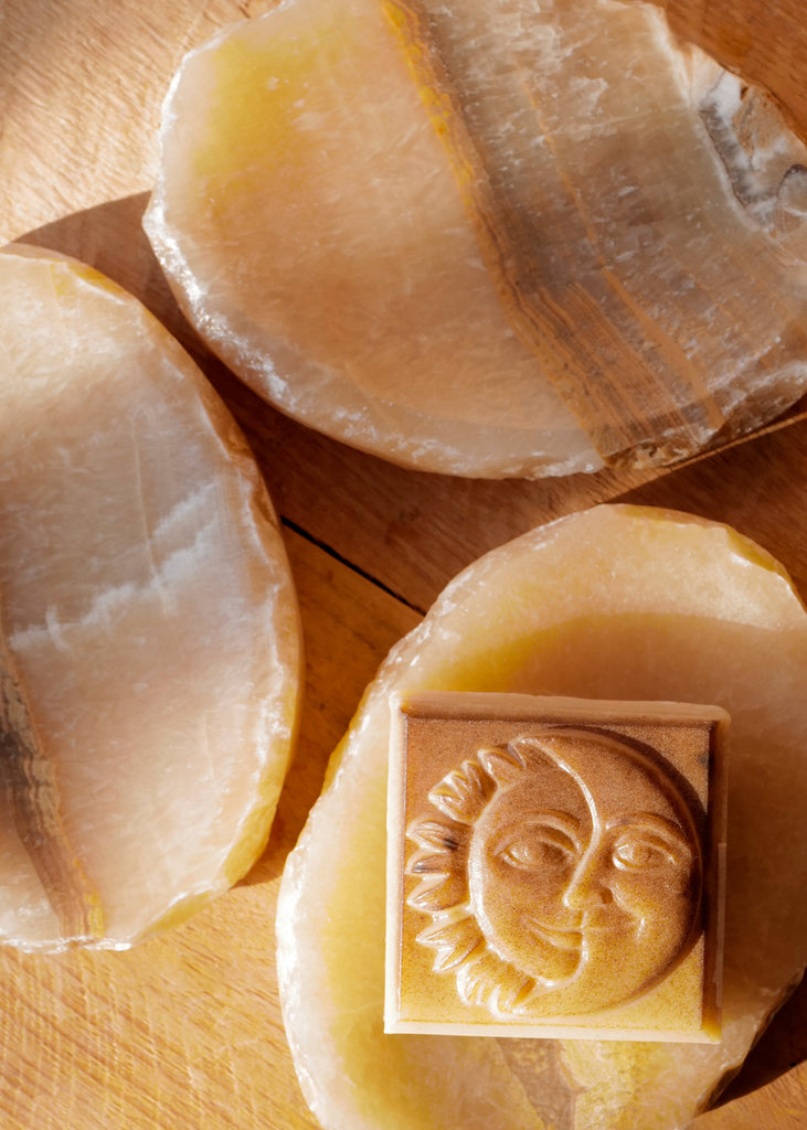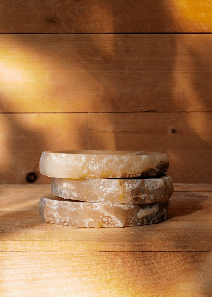 This natural onyx stone dish features warm tones of sand, stone, and amber. Each dish is handmade, with unique variations in tone and veining due to the natural sourcing of the stone. Suitable as a soap or trinket dish. One of a kind.