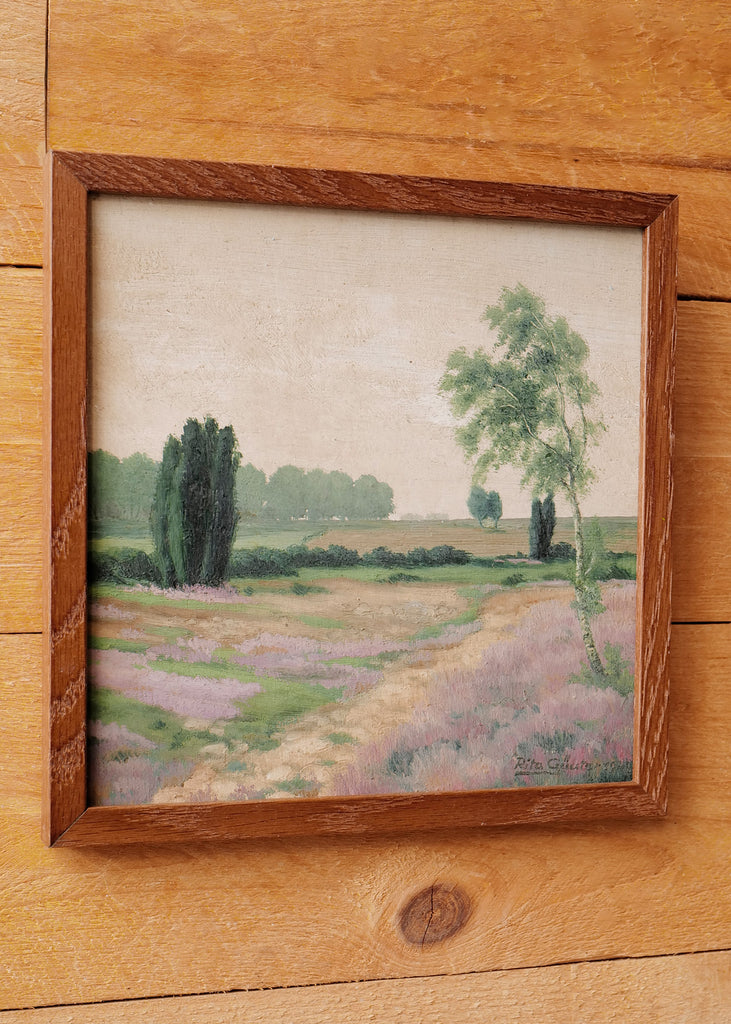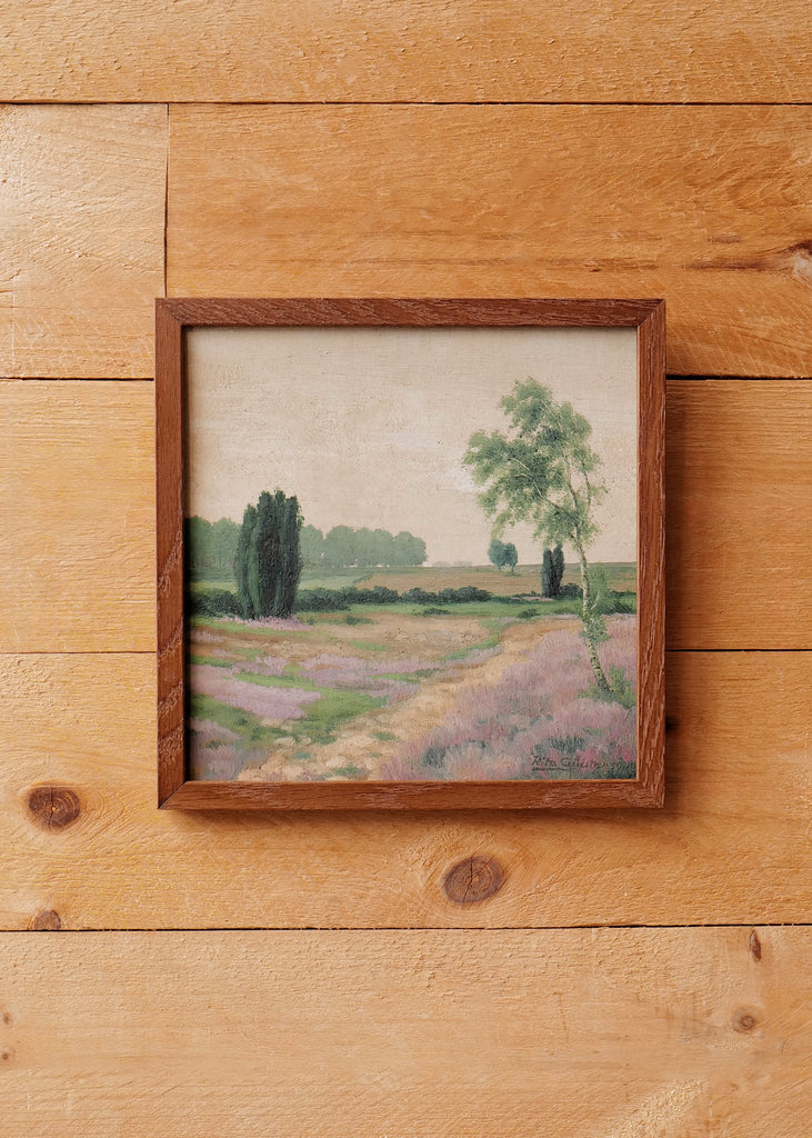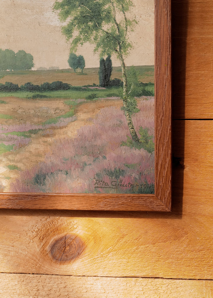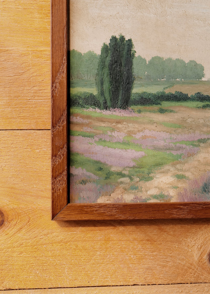 Beautiful vintage painting featuring a landscape of wildflowers and cypress trees. Painted in a natural color pallet of moss, grass, lavender, and warm sands. Signed by artist in the lower right. Newly framed in wooden frame. One of a kind.