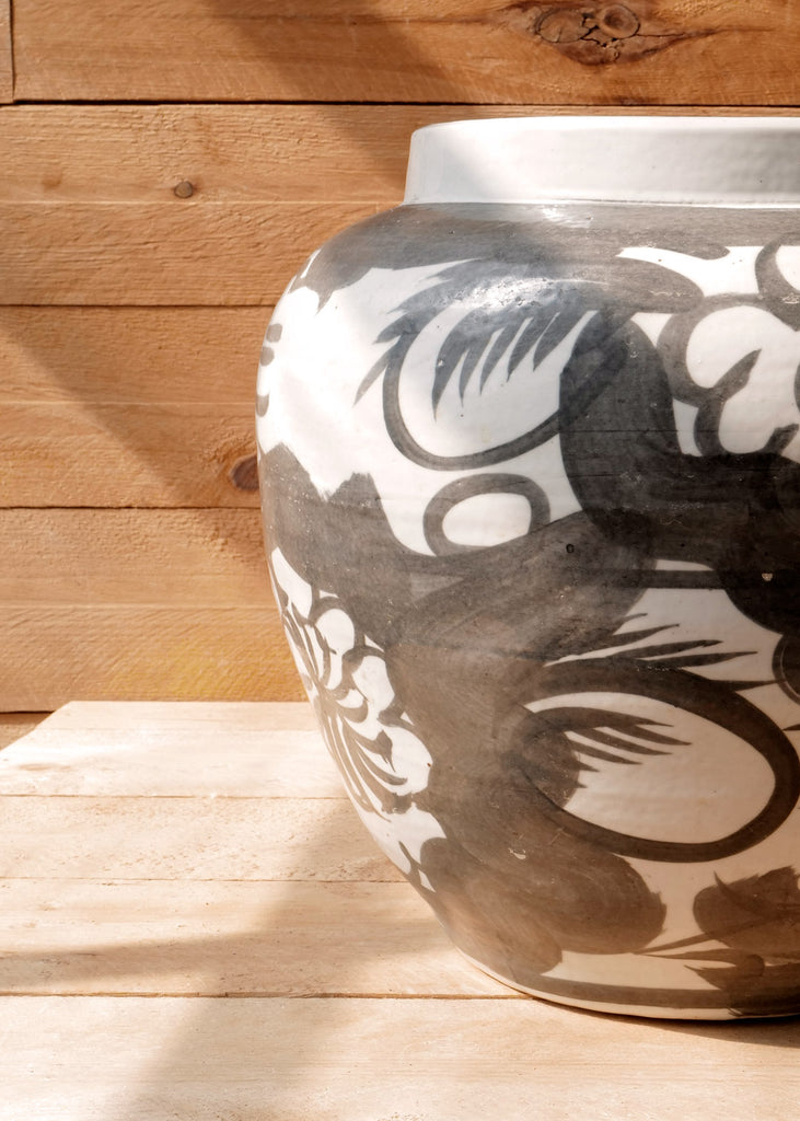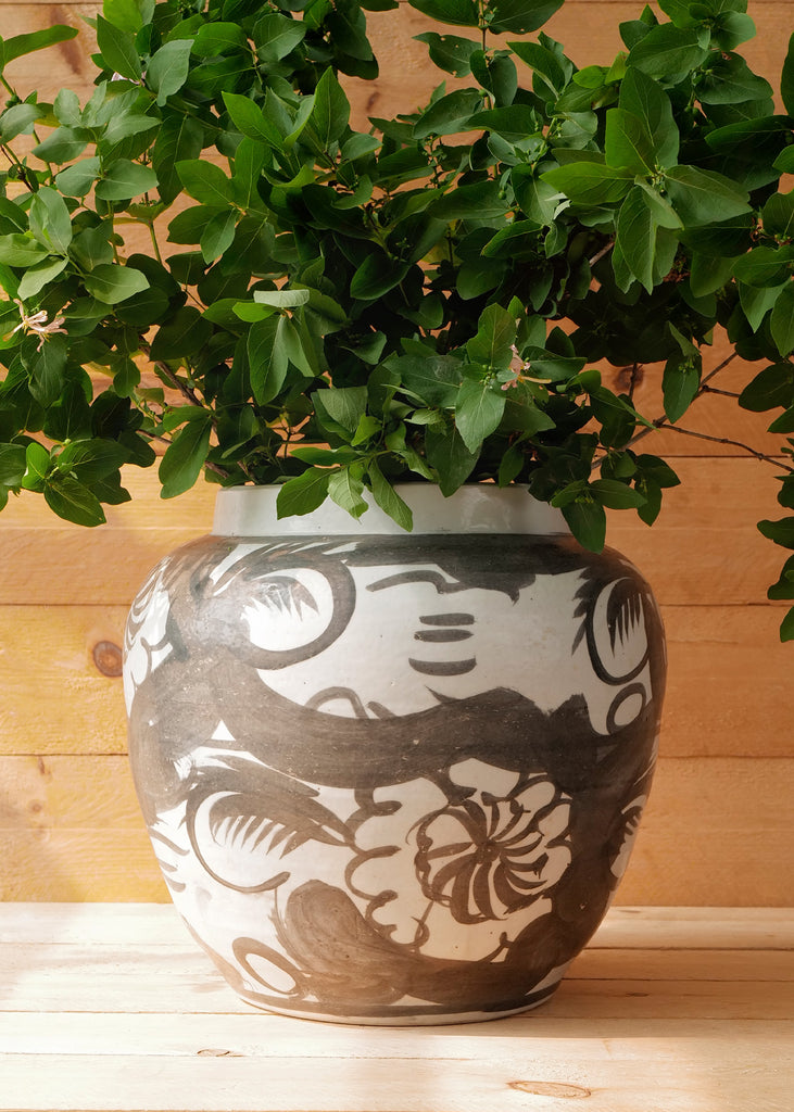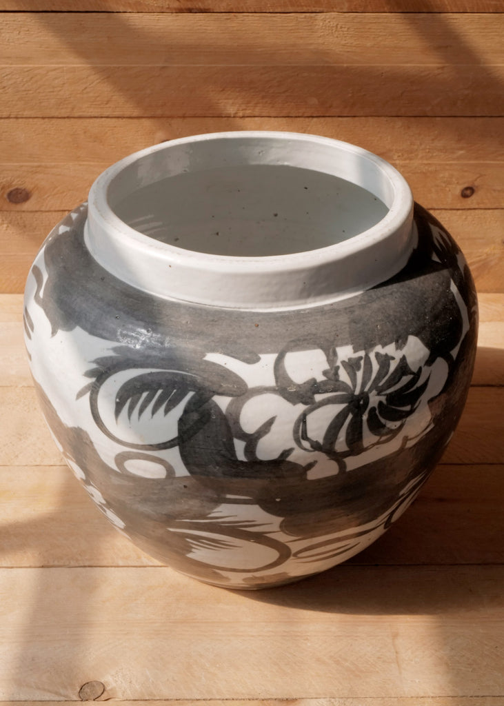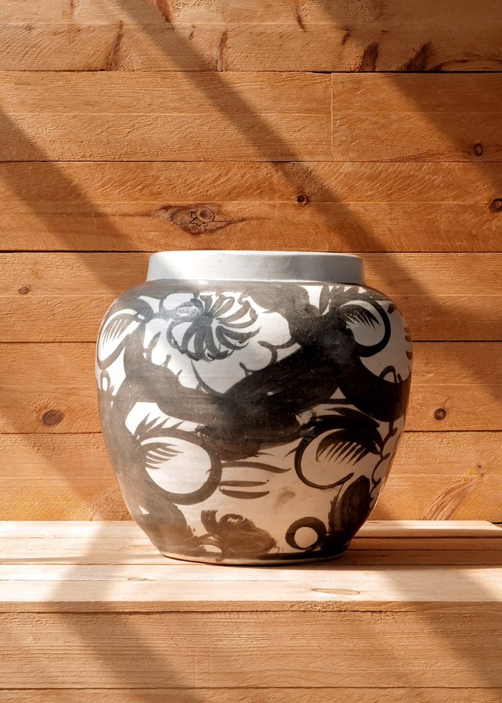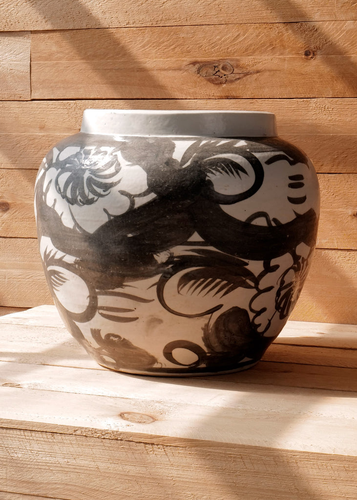 Hand-thrown in Jingdezhen, China, historic center of ceramic production, this vessel reflects influences from Yuan to early Qing Dynasty design. The surface features a loosely painted floral motif in black and white. One of a kind.