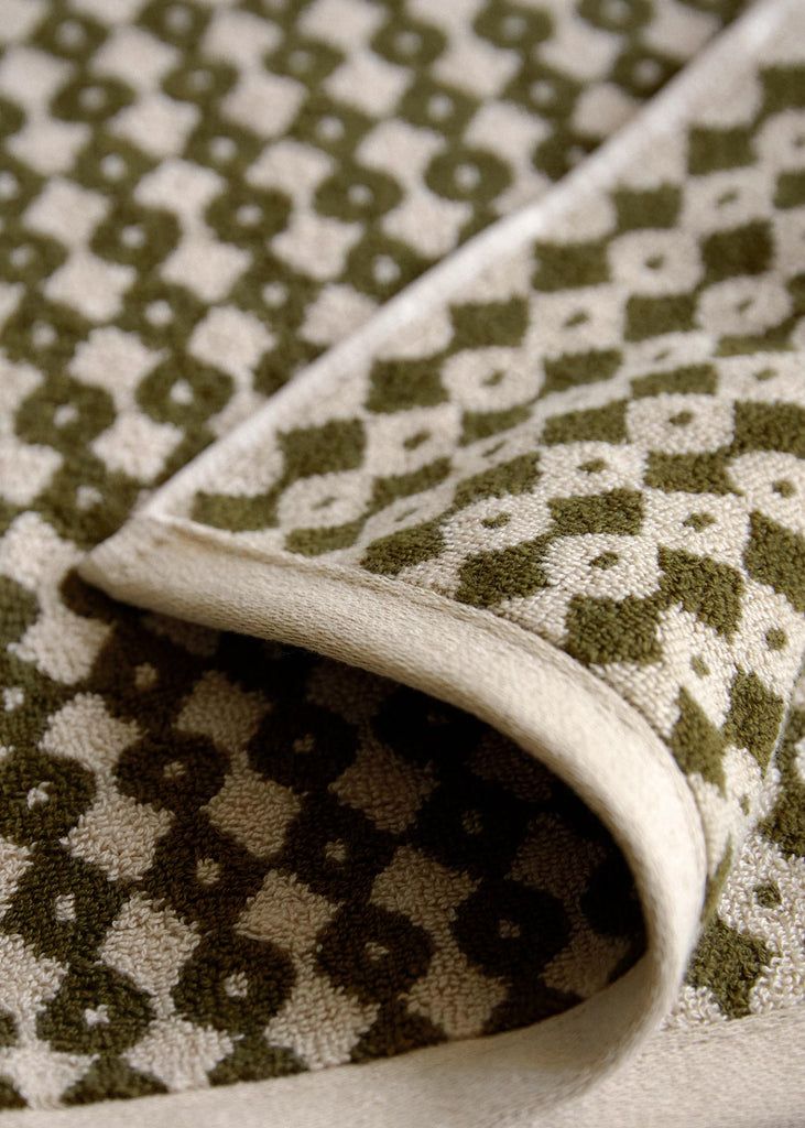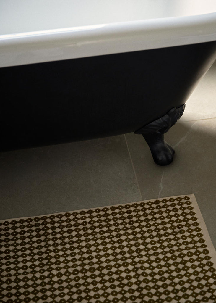 The Hana Bath Mat features a two-tone circle pattern inspired by traditional Katazome stenciling. Fully reversible in olive and ecru, it’s designed to look good no matter how it’s folded or hung. Made with thick double yarn, it’s both durable and soft underfoot, and the dense, even pile offers excellent absorbency and quick drying.