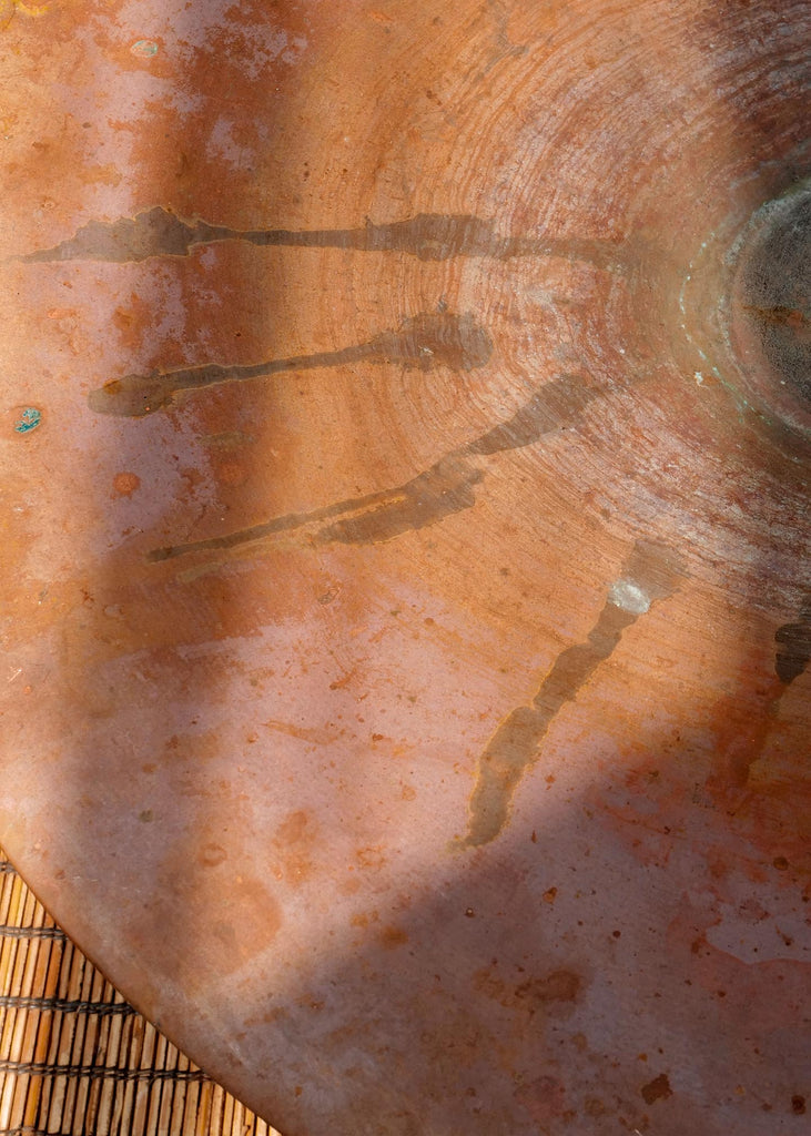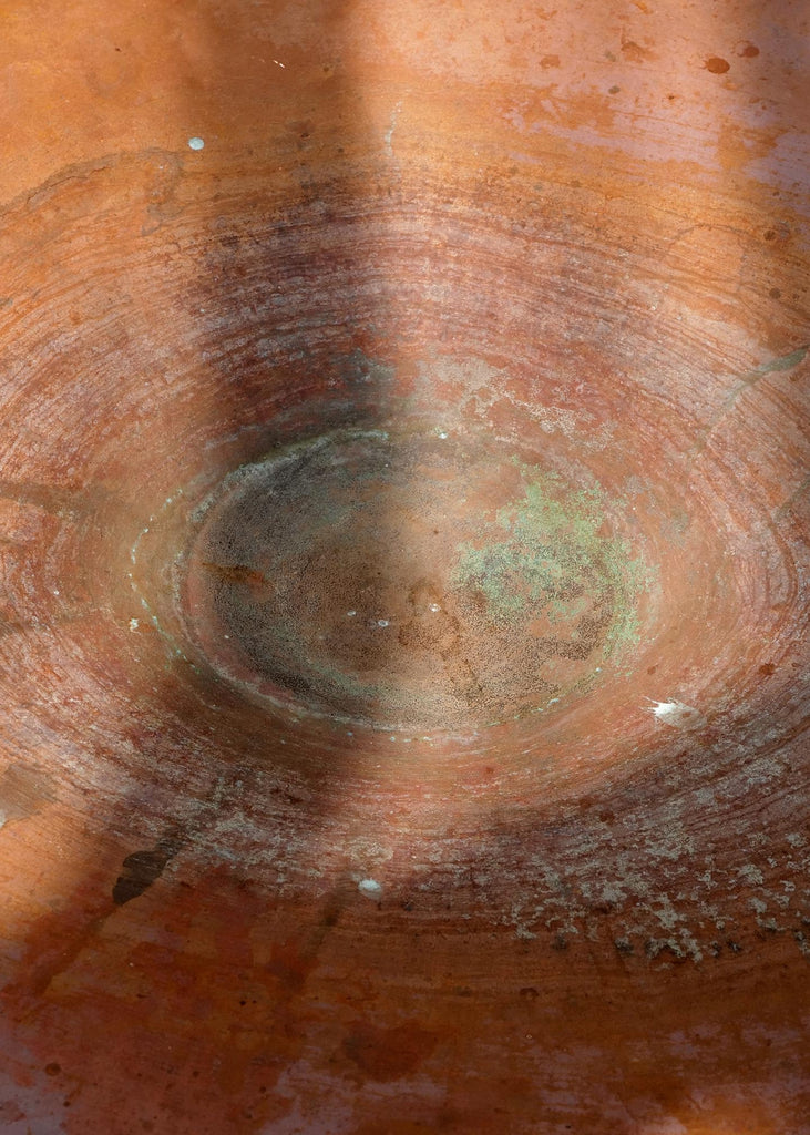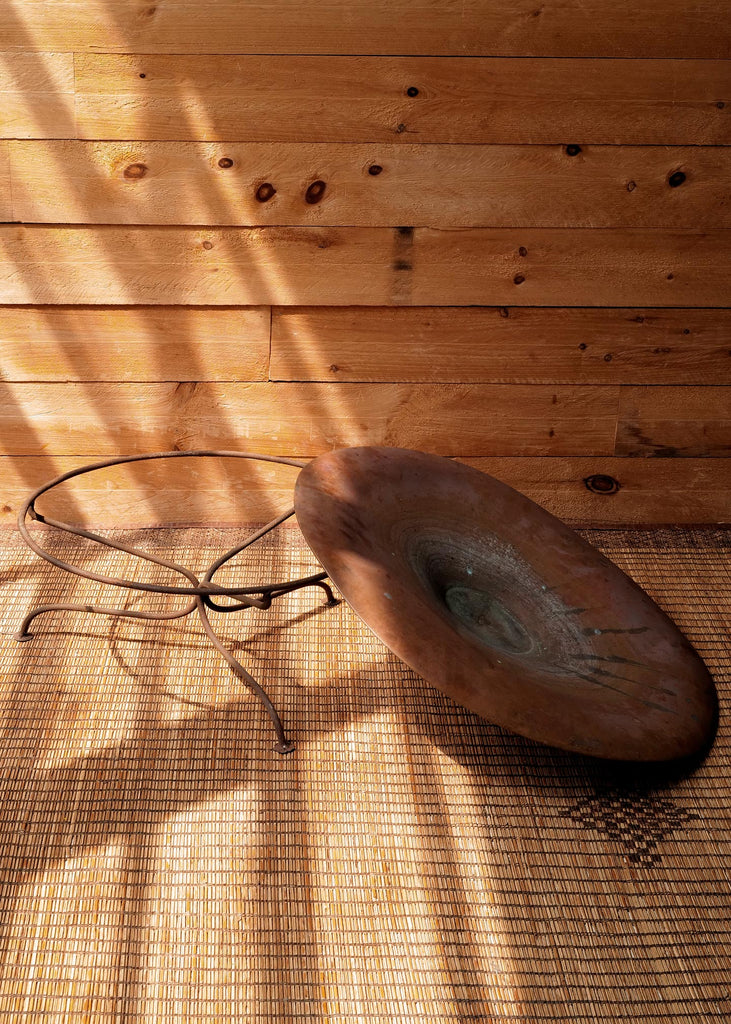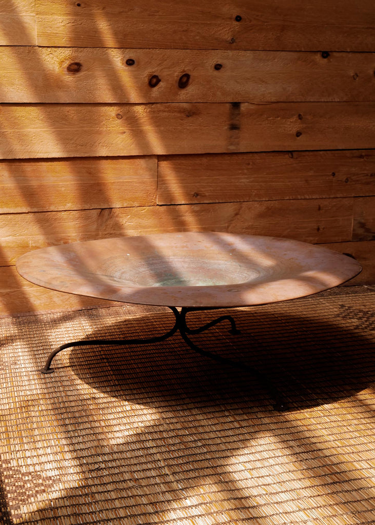 Crafted from hand-hammered bronze, this vintage bird bath features a wide, shallow basin atop a cylindrical pedestal. The surface shows a natural patina, with visible wear, oxidation, and irregularities consistent with age and use. Made using traditional metalworking techniques. One of a kind.