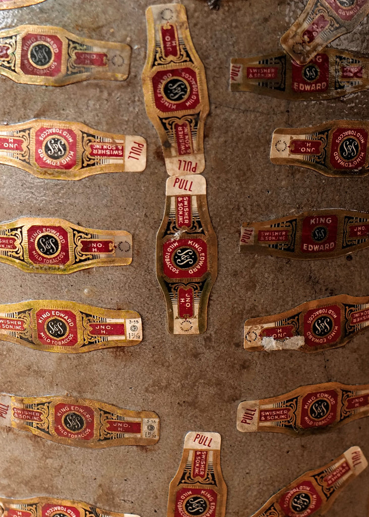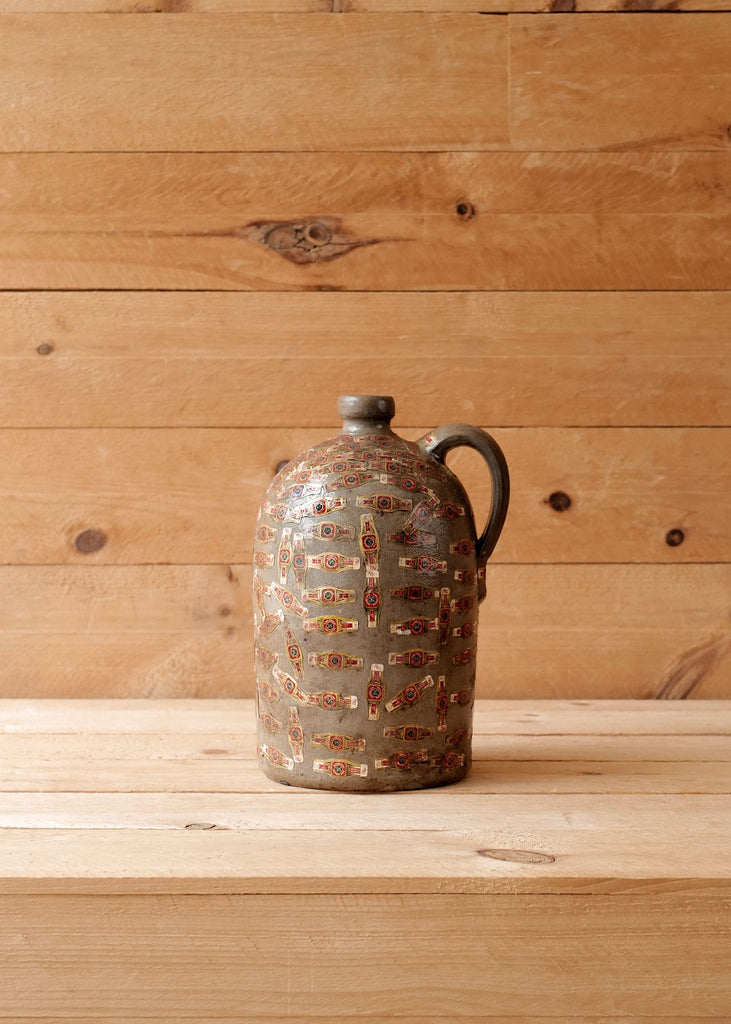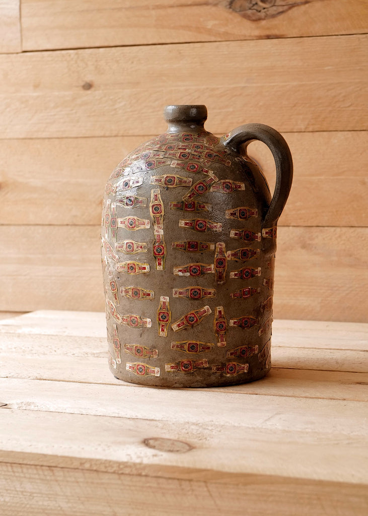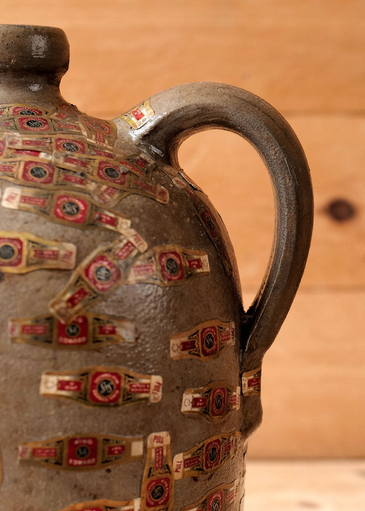 Crafted from stoneware, this hand-thrown vintage vase features one handle and a simple stone grey glaze. Decorated with decoupaged King Edward Mild Tobacco cigar bands collected over time, the glaze has naturally aged to a soft patina. One of a kind.