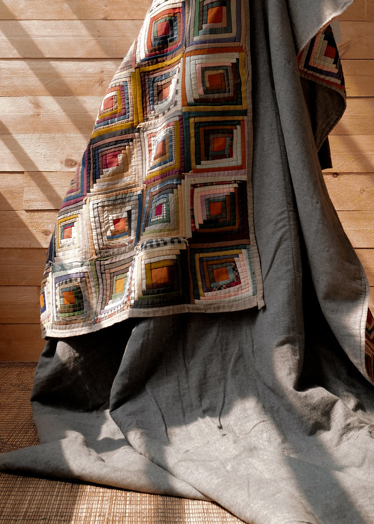 The Meadows Log Cabin Quilt is a traditional hand made quilt, made with a variety of fabrics. The materials consist of cottons, wools, and tartans. The design features a playful arrangement of fabrics in the traditional cabin style made popular in 1863, to help raise funds for the Union Army during the American Civil War. It was thought to be in honor of Abraham Lincoln, who grew up in a log cabin. The colors range from soft neutrals, to deep red, pale pinks, and slate blue. The quilt has a bold floral pattered backing that can also be seen around the edges. One of a kind.