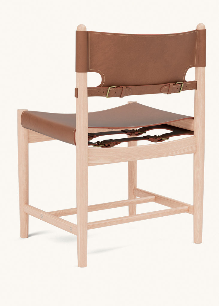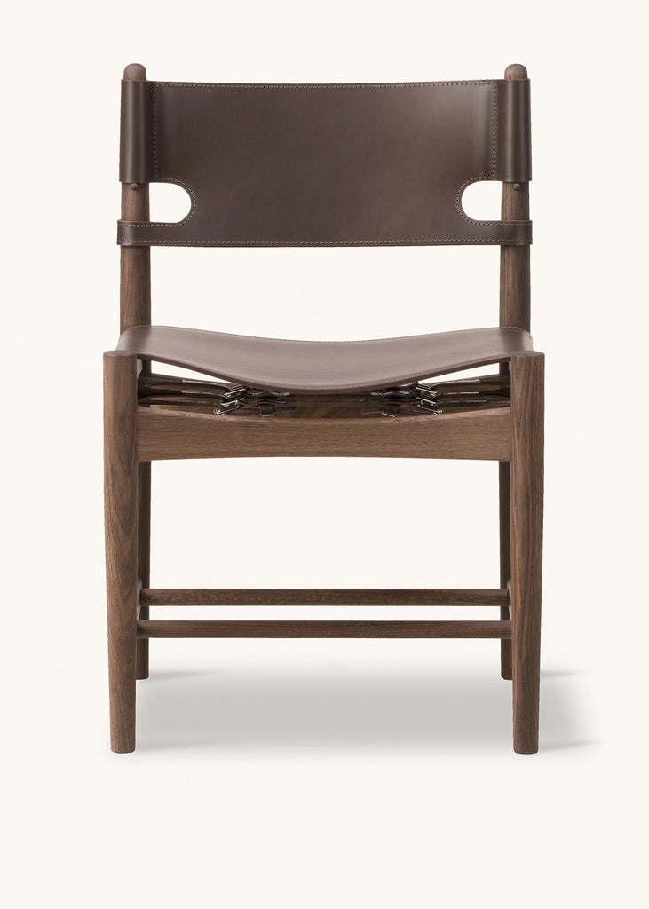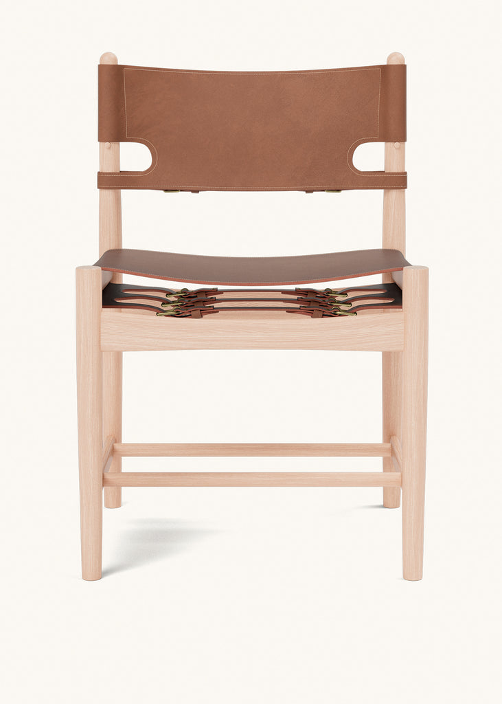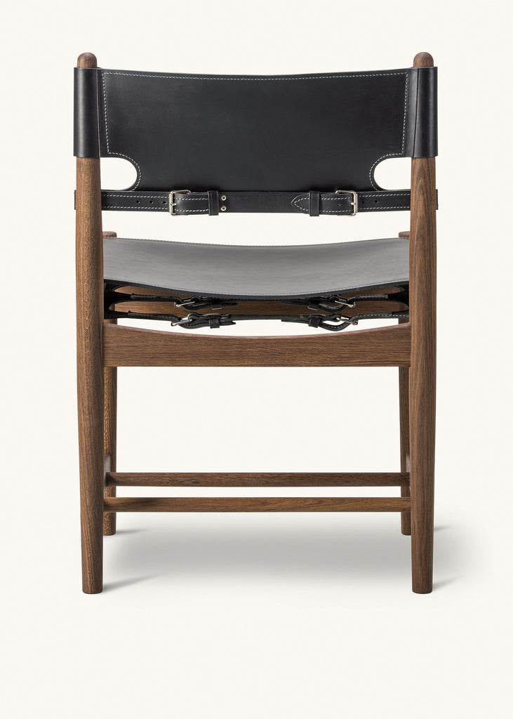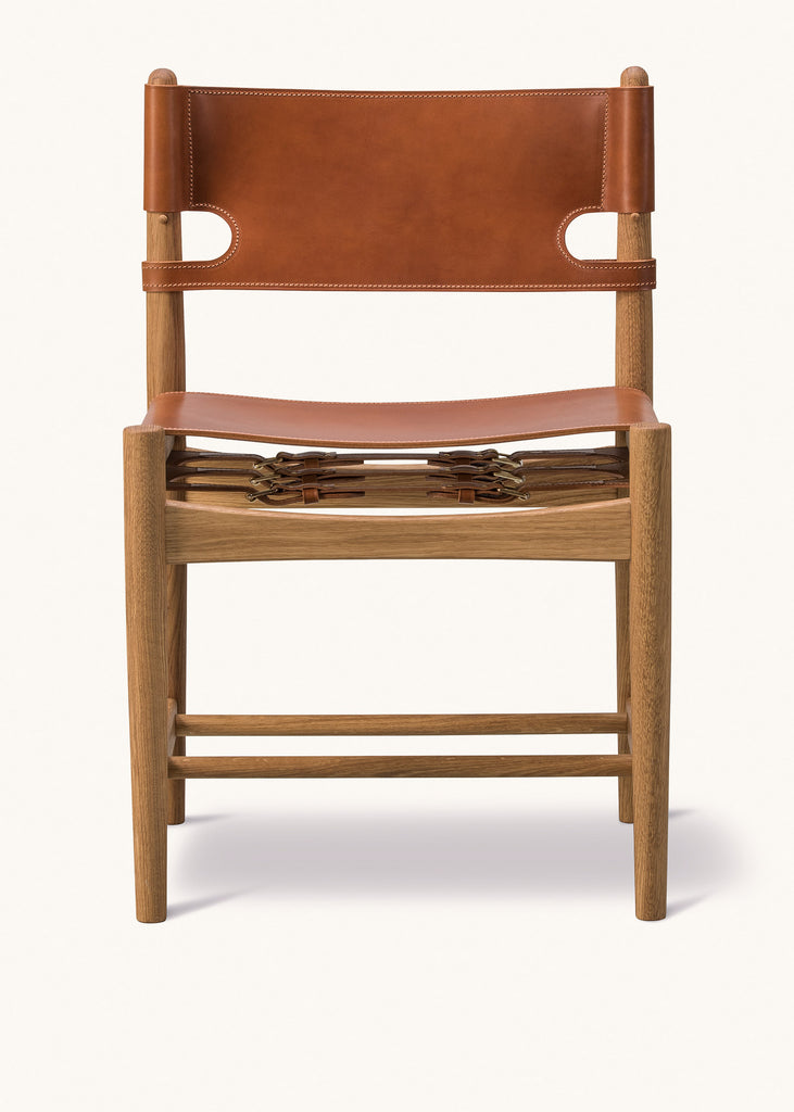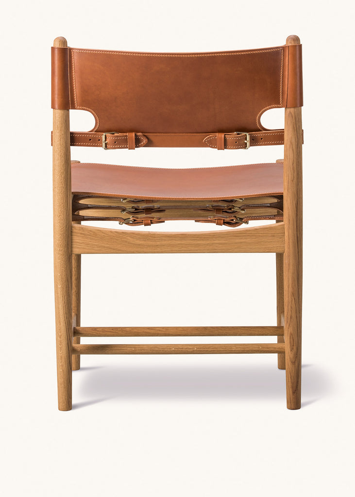 Designed in Denmark by Børge Mogensen in 1958, the Spanish Dining Chair draws inspiration from traditional Spanish furniture-making techniques that used sturdy leather as an integral part of construction. This Spanish approach supported Mogensen's belief that good furniture should be enjoyed now and for generations to come. Available in solid oak or walnut, the chair's high-quality saddle leather develops a patina over time and the adjustable straps can be tightened as the leather naturally expands.